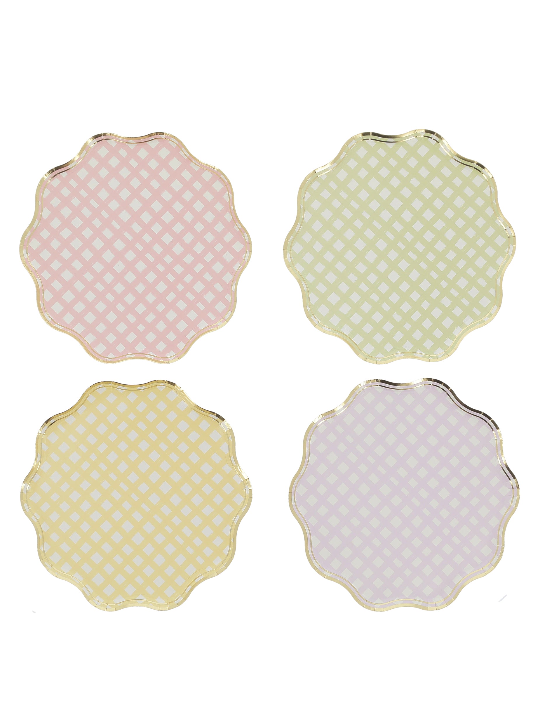8 assiettes carton lilas, rose, jaune, vert et or 23cm festonnées à carreaux pastel