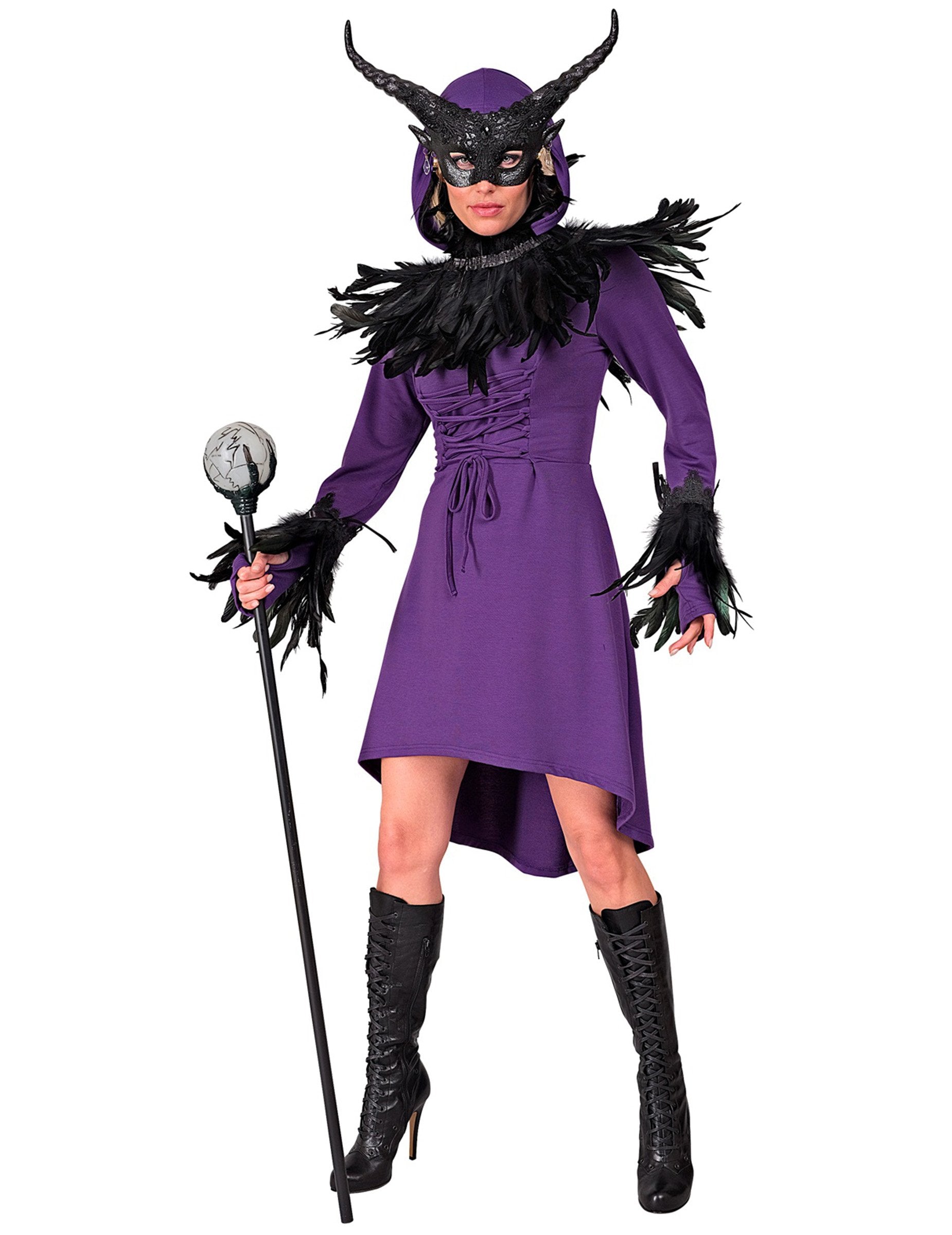 Această rochie gotică medievală violet pentru femei este proiectată într -o țesătură curgătoare, cu o tăietură elegantă, ușor evazată. Este format dintr -o rochie cu o capotă integrată, cu o cravată pe față care evidențiază talia. Mânecile lungi și tăieturile asimetrice din spate adaugă o notă dramatică în ansamblu. Ideal pentru un costum de vrăjitoare, nobil medieval sau mistic, această rochie va fi perfectă pentru Halloween, o seară gotică sau un eveniment medieval.