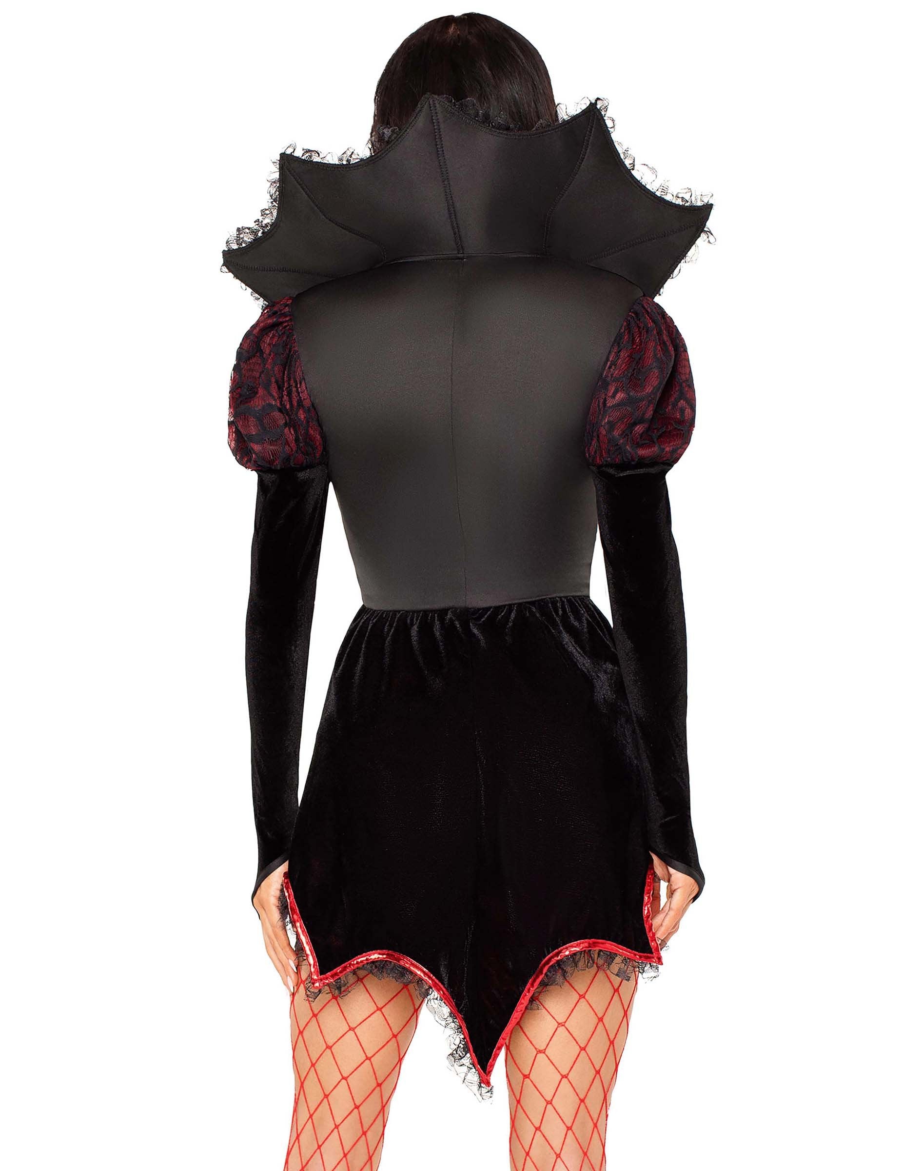 Ce déguisement de vampire sexy rouge et noir pour femme se compose d’une robe courte noire avec un empiècement rouge orné de dentelle noire au niveau du buste, et de bretelles fines pour un maintien délicat. Le haut met en valeur le décolleté avec un contraste séduisant. La tenue est accompagnée d’une veste asymétrique longue dans le dos, avec un col large rouge à l’intérieur, soulignant une silhouette dramatique. Un bijou de tête noir et rouge vient parfaire cet ensemble mystérieux au style ensorcelant. Un costume envoûtant pour se démarquer lors de d'Halloween !