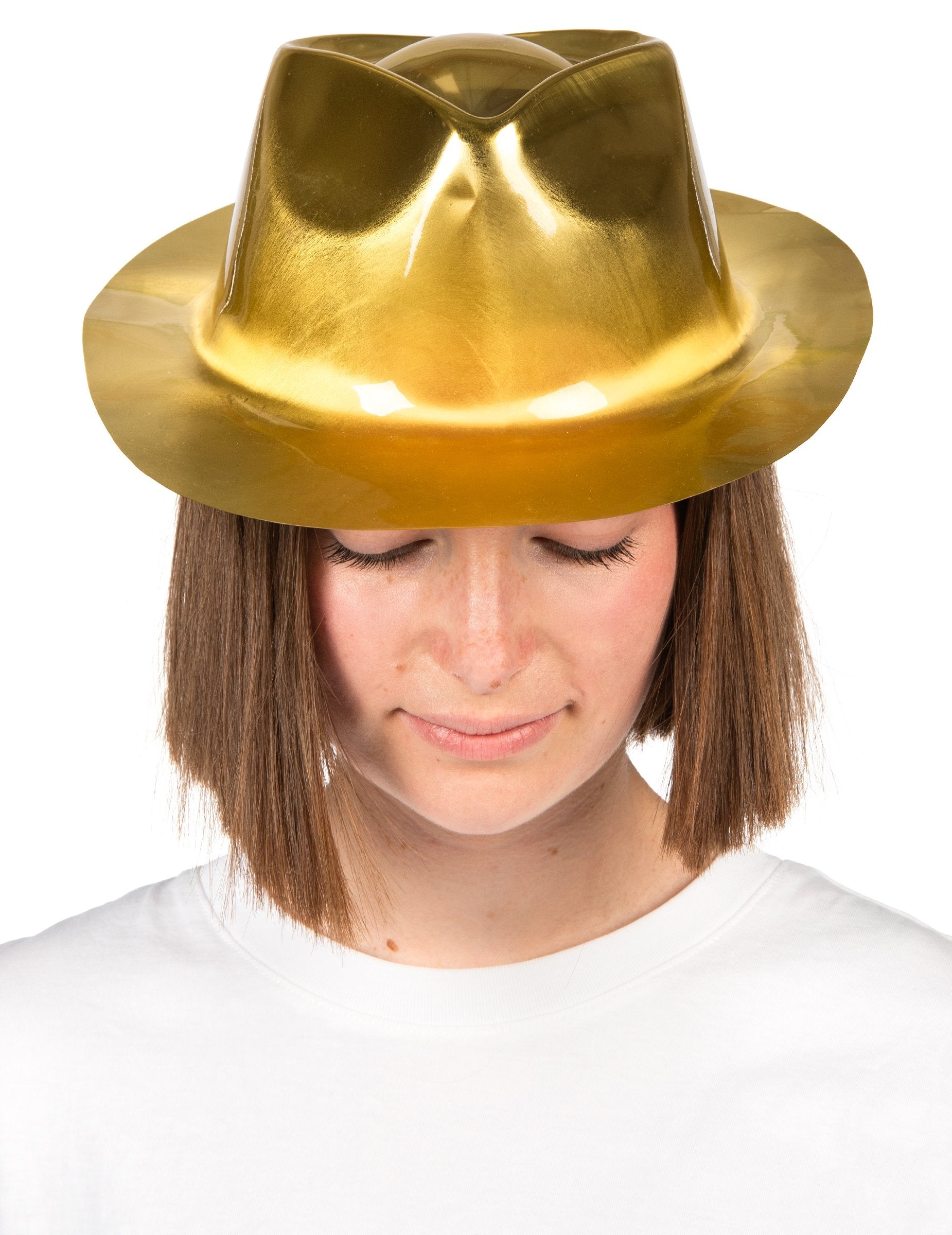 Această pălărie de gangster aurie strălucitoare este fabricată din plastic ușor, cu un finisaj metalic orbitor, perfectă pentru a ieși în evidență la o petrecere. Cu forma sa inspirată din anii 1920, evocă eleganța unor figuri emblematice din lumea mafiei, reimaginate aici într-o versiune festivă, aurie. Un accesoriu perfect pentru a completa un costum de gangster sau pentru a adăuga o notă elegantă și distractivă unui carnaval, unui bal costumat sau unei petreceri cu tematică Gatsby.
