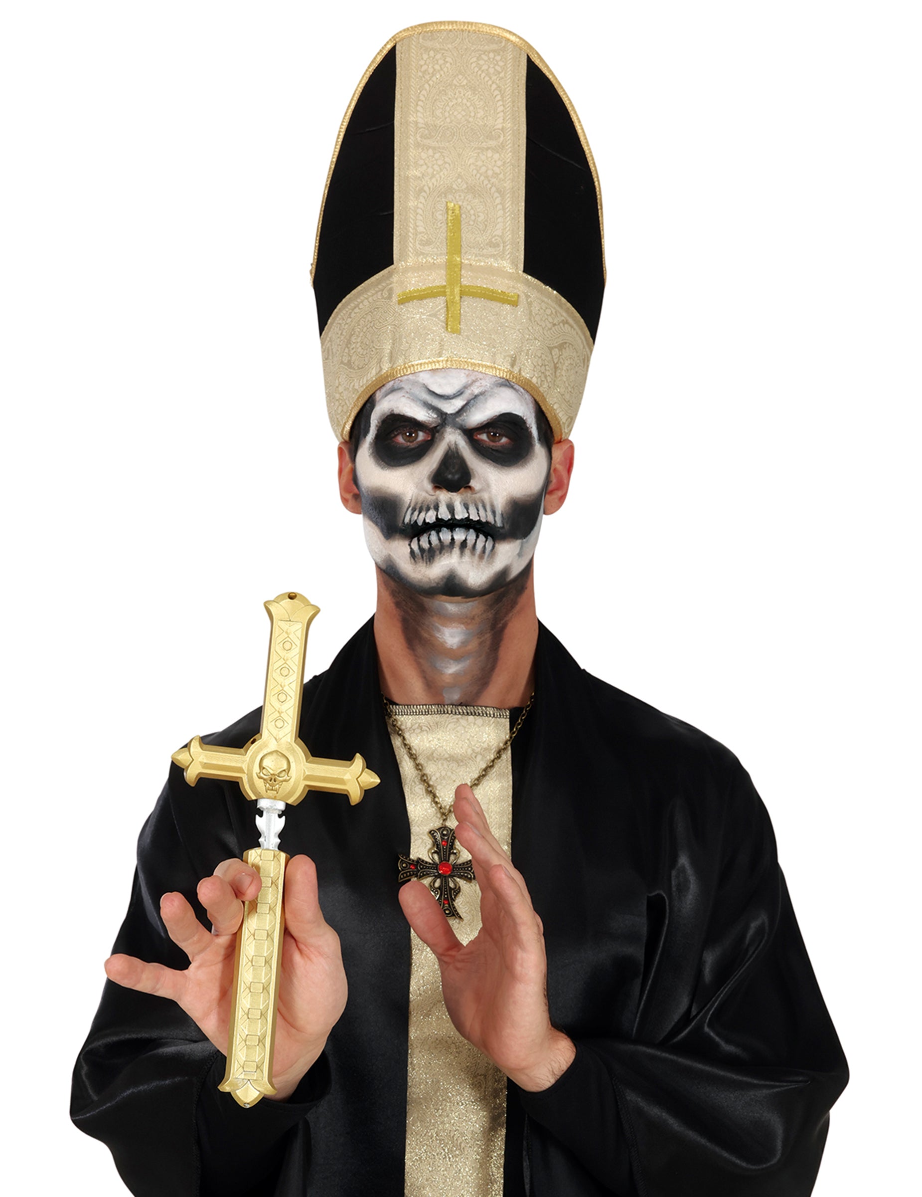 Cette croix de moine cache un poignard dissimulé dans son fourreau, pour un accessoire aussi intrigant que redoutable. Entièrement en plastique, elle affiche un aspect doré orné de reliefs et d’un crâne central menaçant, parfait pour semer le doute sur la véritable nature du porteur. Idéale pour Halloween ou une tenue de moine démoniaque, cette croix à double usage viendra parfaire une mise en scène sombre et inattendue.