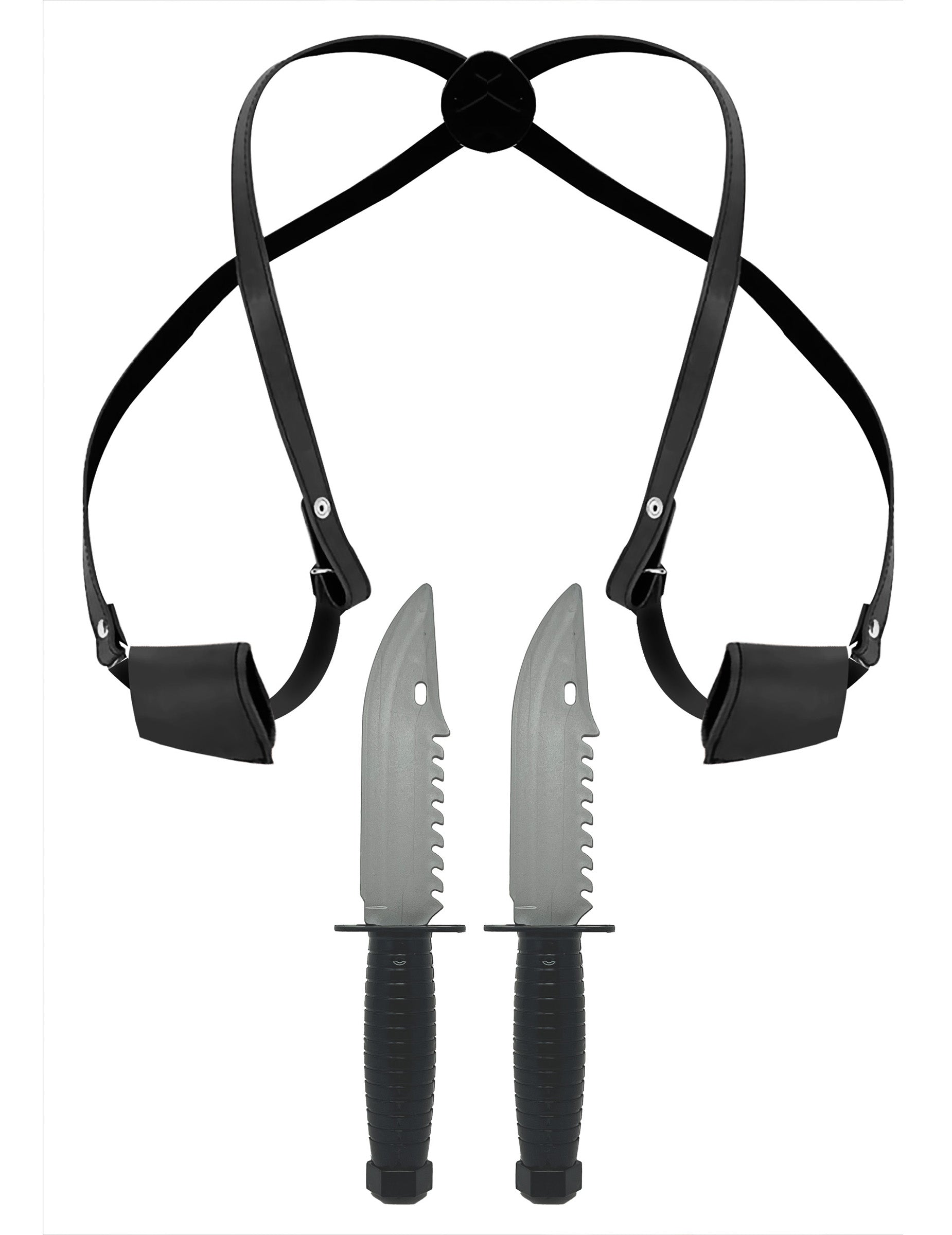 Ce holster avec deux couteaux en plastique est l’accessoire parfait pour compléter un déguisement de soldat, mercenaire ou aventurier. L’étui se porte en bandoulière, croisé dans le dos, pour un maintien optimal. Il est conçu pour accueillir deux grands couteaux de combat factices, au look réaliste avec leurs lames grises crantées et leurs poignées noires. Un détail incontournable pour une allure de guerrier redoutable lors de vos soirées à thème, carnavals ou missions déguisées.