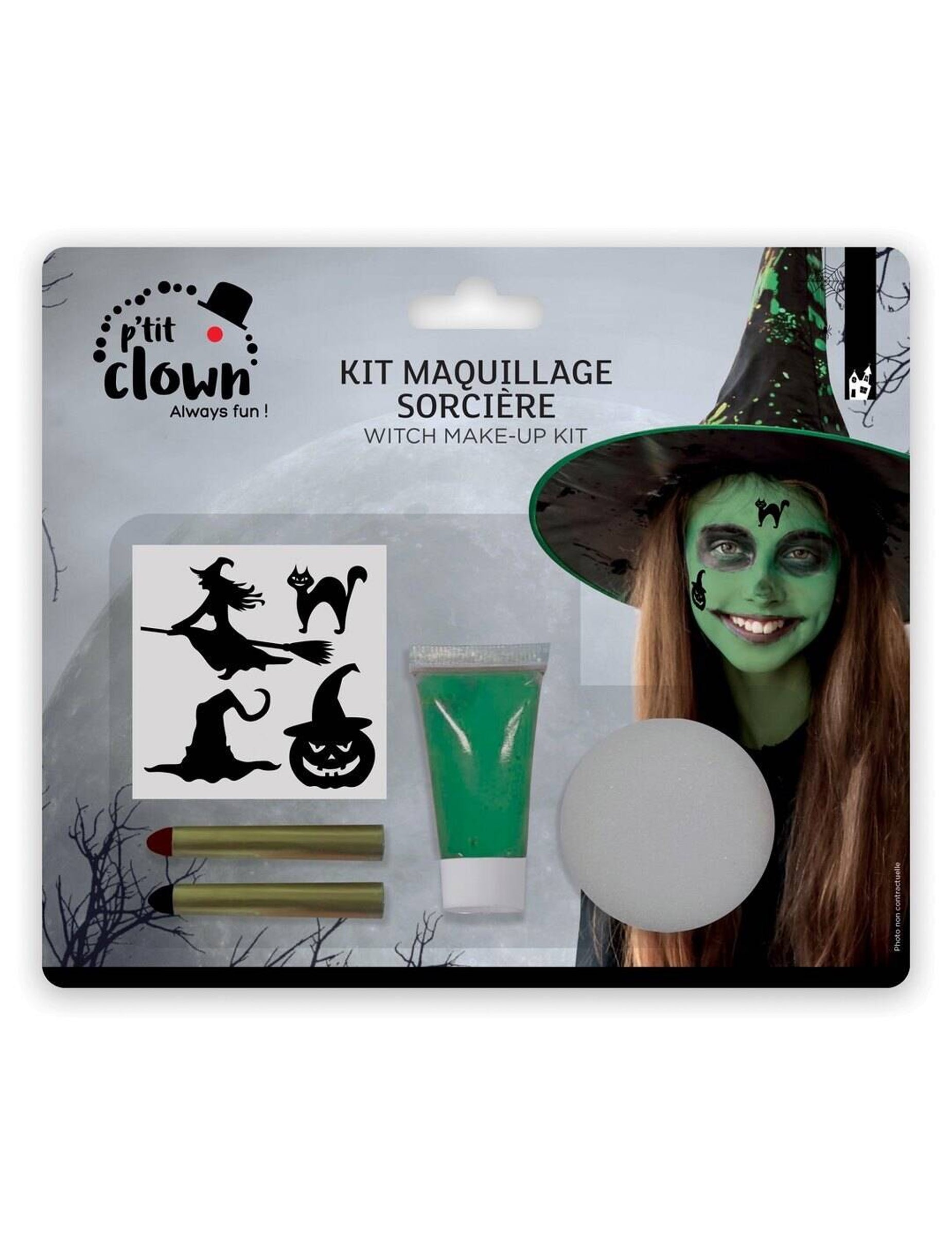 Ce kit sorcière verte enfant comprend un tube de maquillage vert, deux petits crayons, une éponge ronde et une planche de tattoos avec des dessins de citrouilles, balais et chats noirs. Il permet de se maquiller facilement pour une soirée d’Halloween ou une fête costumée à l’école. Un petit kit malin pour un déguisement de sorcière réussi !