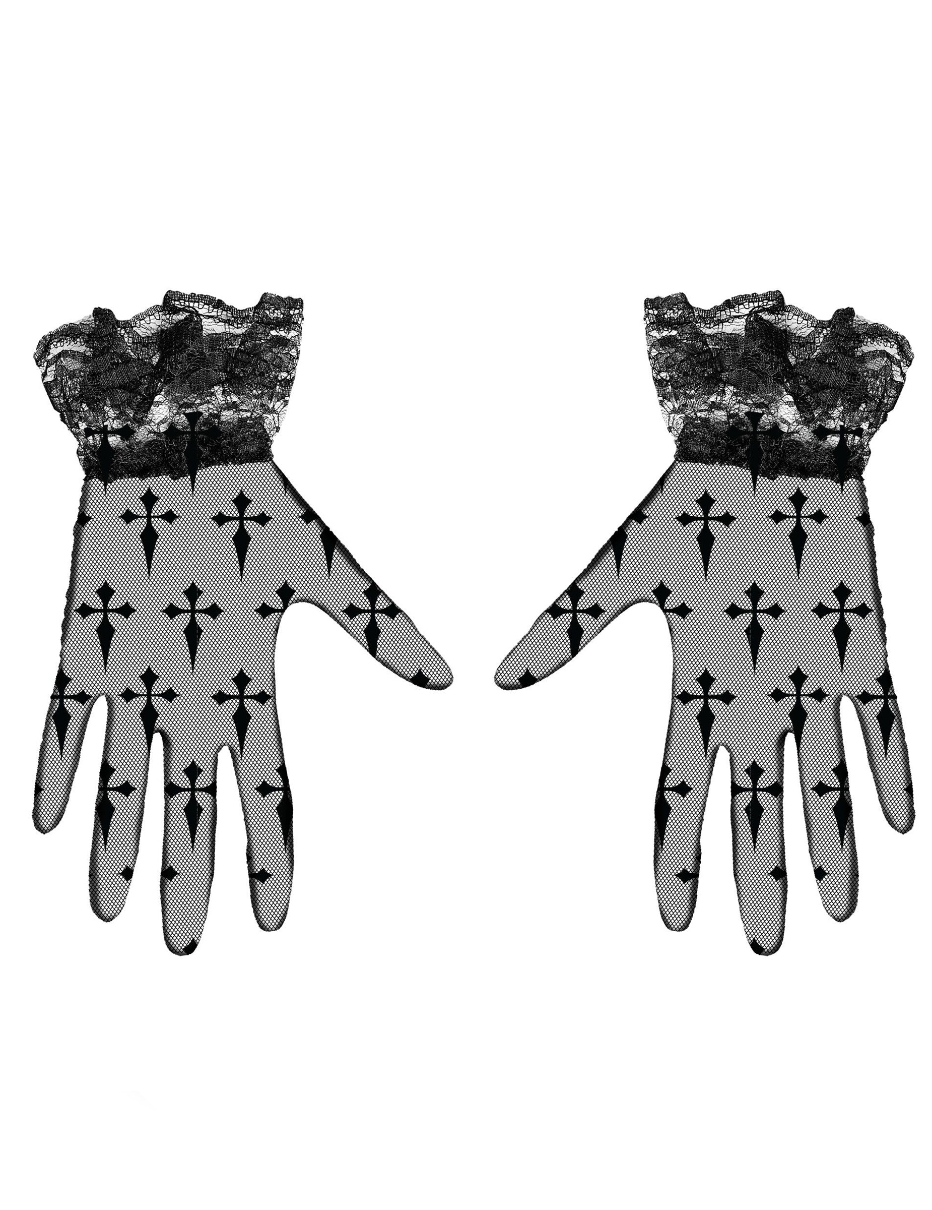 Aceste mănuși scurte sunt confecționate din voal subțire, decorate cu cruci negre stilizate pe toată mâna. O dantelă plisată împodobește încheietura pentru un plus de farmec victorian.