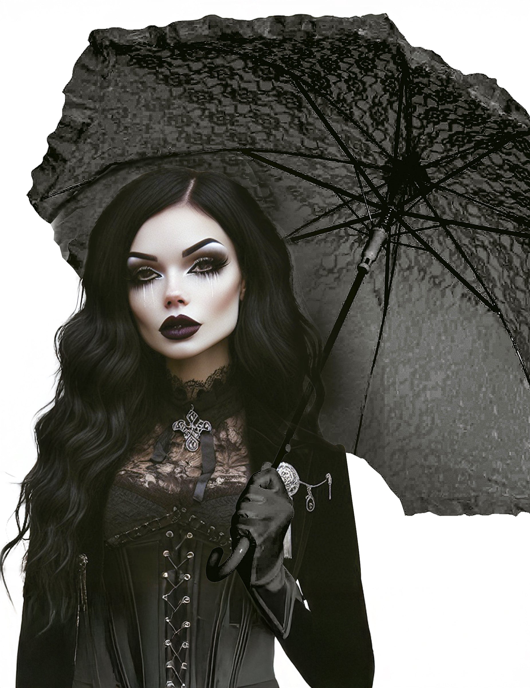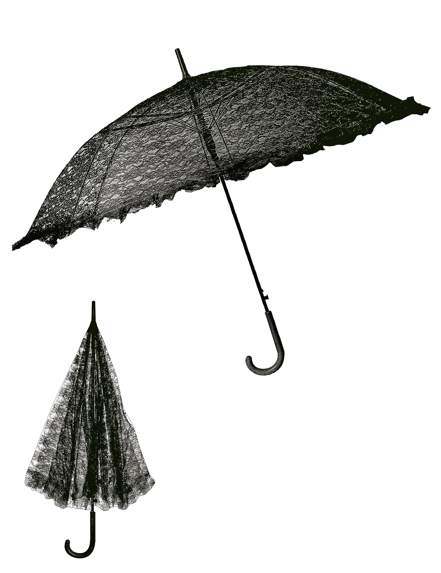 Această umbrelă neagră cu un diametru de aproximativ 70 cm este acoperită în întregime cu dantelă transparentă cu motive delicate, conferindu-i un aspect romantic și misterios. Mânerul său negru curbat completează estetica sa cu inspirație victoriană. Perfectă pentru a completa un costum de vampir, marchiză gotică sau vrăjitoare rafinată, această umbrelă va adăuga o notă finală ținutelor tale pentru bal mascat sau petrecerea de Halloween.
