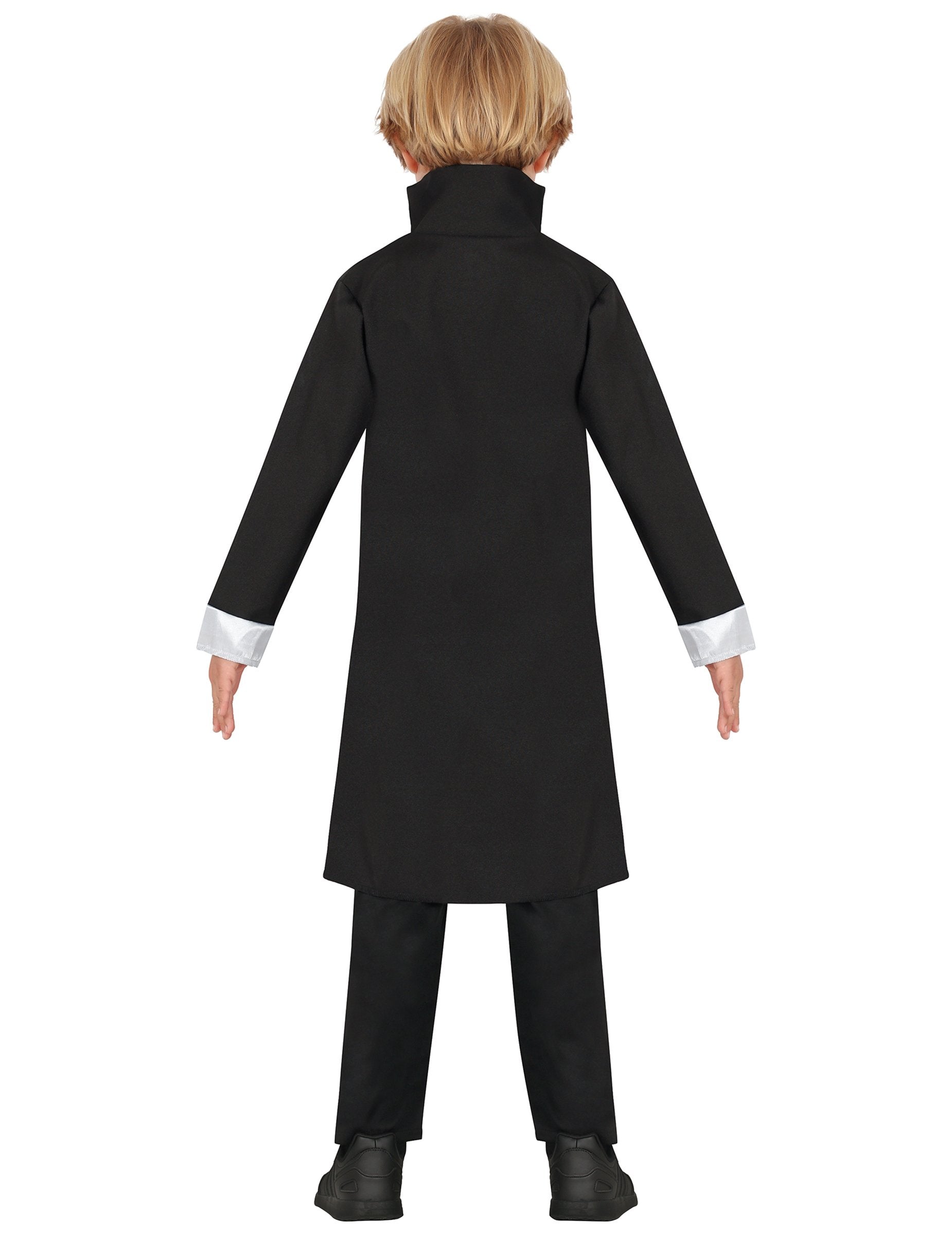 Ce déguisement de vampire argent pour garçon se compose d’un long manteau noir à col relevé, orné de boutons argentés pour une allure noble. Le gilet intégré, avec ses motifs baroques gris et noirs, apporte une touche de raffinement à l’ensemble. Le plastron blanc satiné, façon jabot, évoque le style des vampires aristocrates, tandis que les revers gris au niveau des manches ajoutent un contraste élégant. Le pantalon noir assorti complète la tenue pour un look harmonieux et soigné. Avec cette panoplie complète, l’enfant incarne un jeune comte des ténèbres, parfait pour impressionner à Halloween tout en gardant une silhouette chic et mystérieuse.