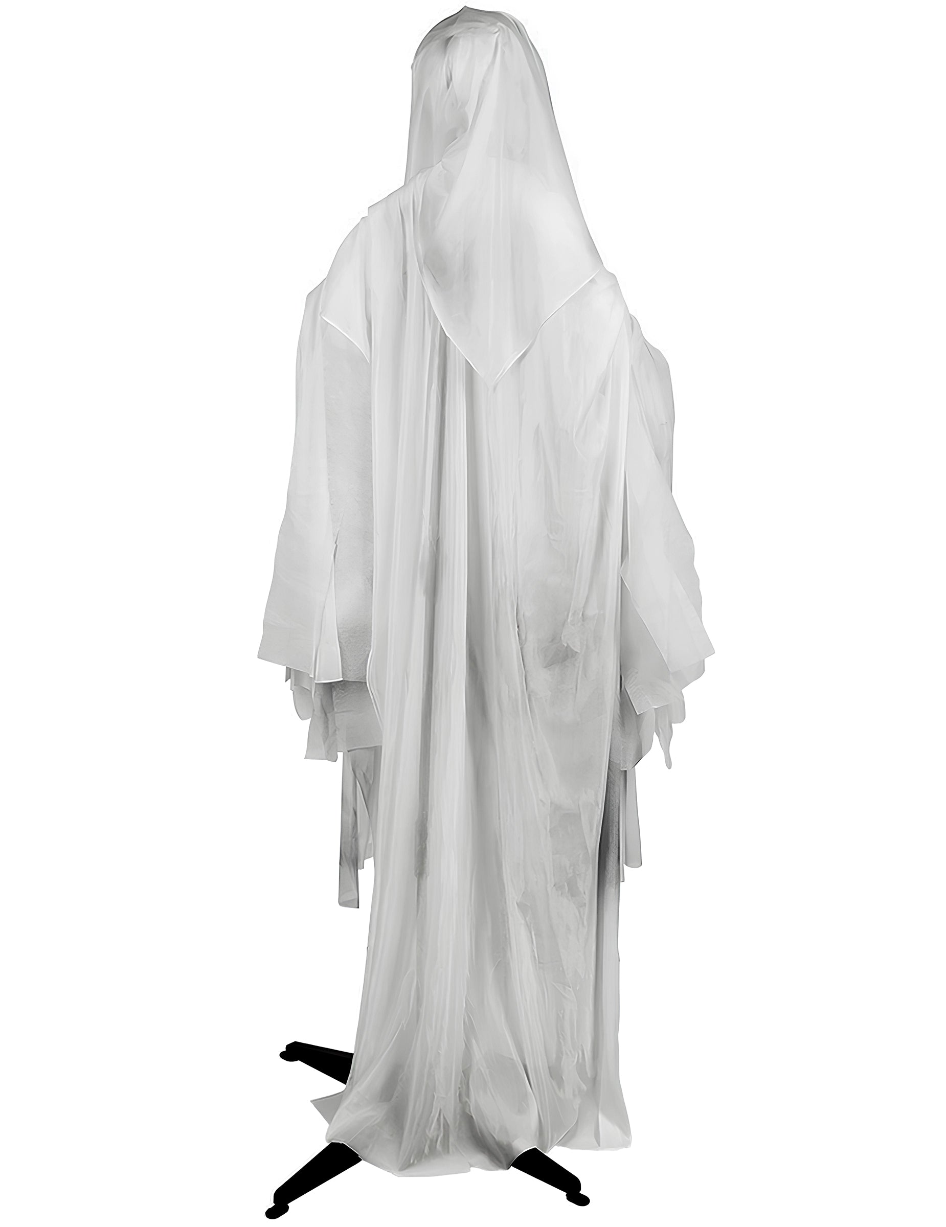 Faceți-i să tremure pe invitații dvs. cu acest fantomă animată de aproximativ 170 cm, o siluetă eterică și înfricoșătoare care pare să plutească între două lumi. Voalul său albicios și sfâșiat, amestecat cu un material ușor și cețos, îi ascunde parțial craniul palid, accentuând aspectul său neliniștitor.