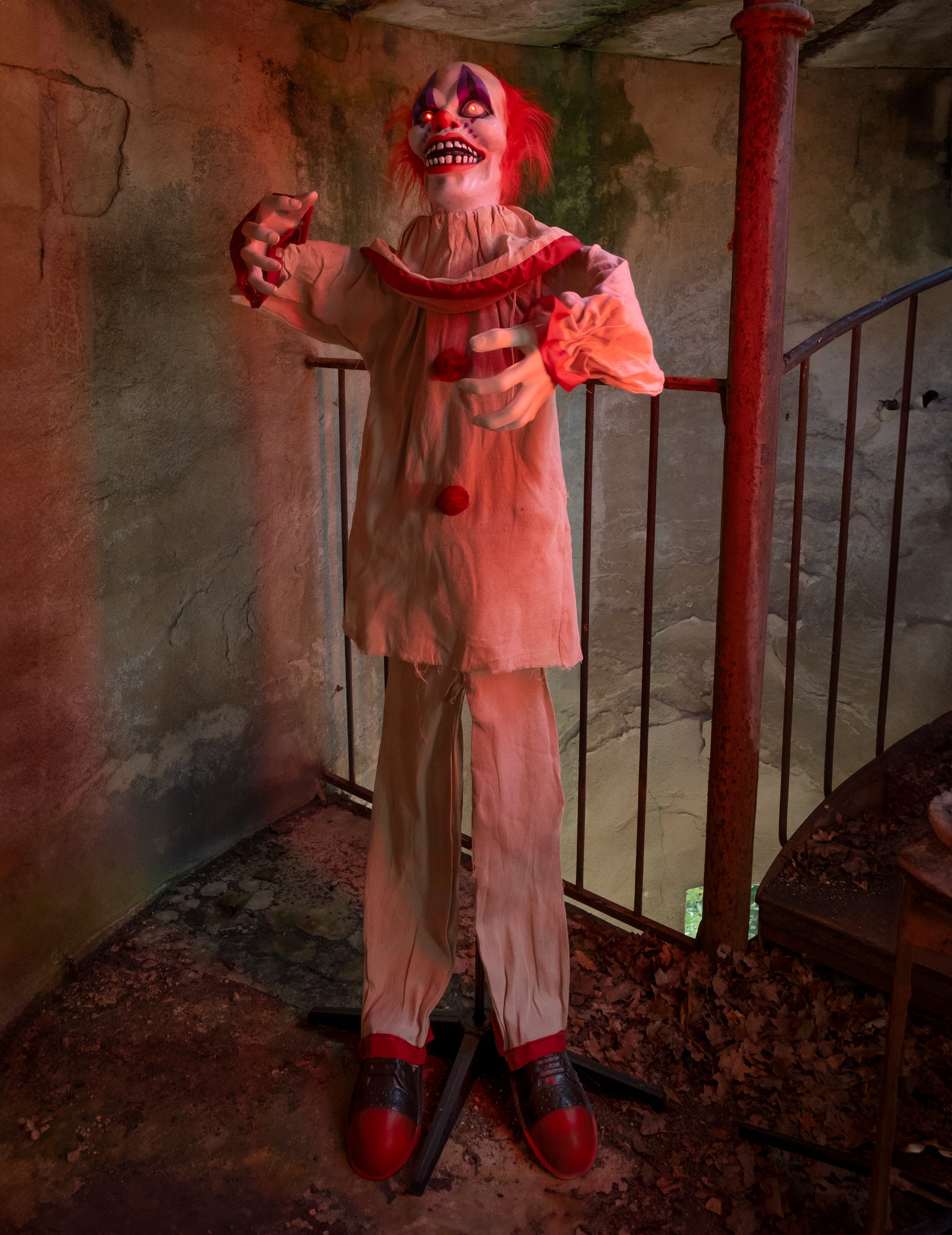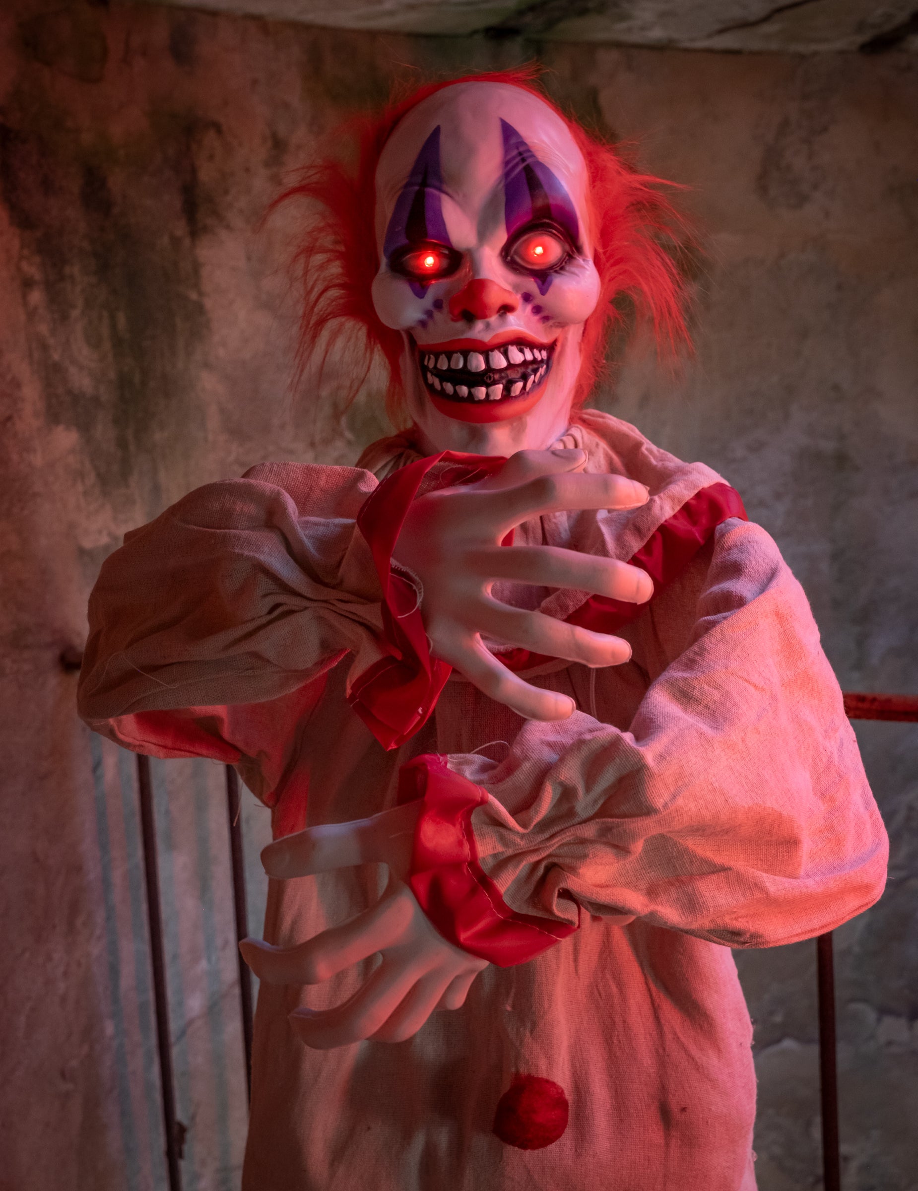 Adaugă o notă de groază pură scenografiei tale cu acest clovn animat de 153 cm cm Cu un zâmbet fix și tulburător, acest personaj, îmbrăcat într-un costum bej cu dungi roșii, cu o față palidă machiată sinistru și posedând o prezență amenințătoare, este suficient să-ți dea fiori pe șira spinării. Datorită senzorilor săi de sunet și mișcare, se activează imediat ce se apropie un vizitator. Ochii săi strălucesc cu o lumină intensă, se mișcă tulburător și emite sunete terifiante. Decorul necesită 3 baterii AAA (nu sunt incluse) pentru un efect combinat de lumină, sunet și animație cu adevărat izbitor. Ideal pentru o casă bântuită, o petrecere de Halloween, o vitrină înfricoșătoare sau o tematică macabră cu clovni, acest personaj devine rapid cea mai temută atracție din decor.