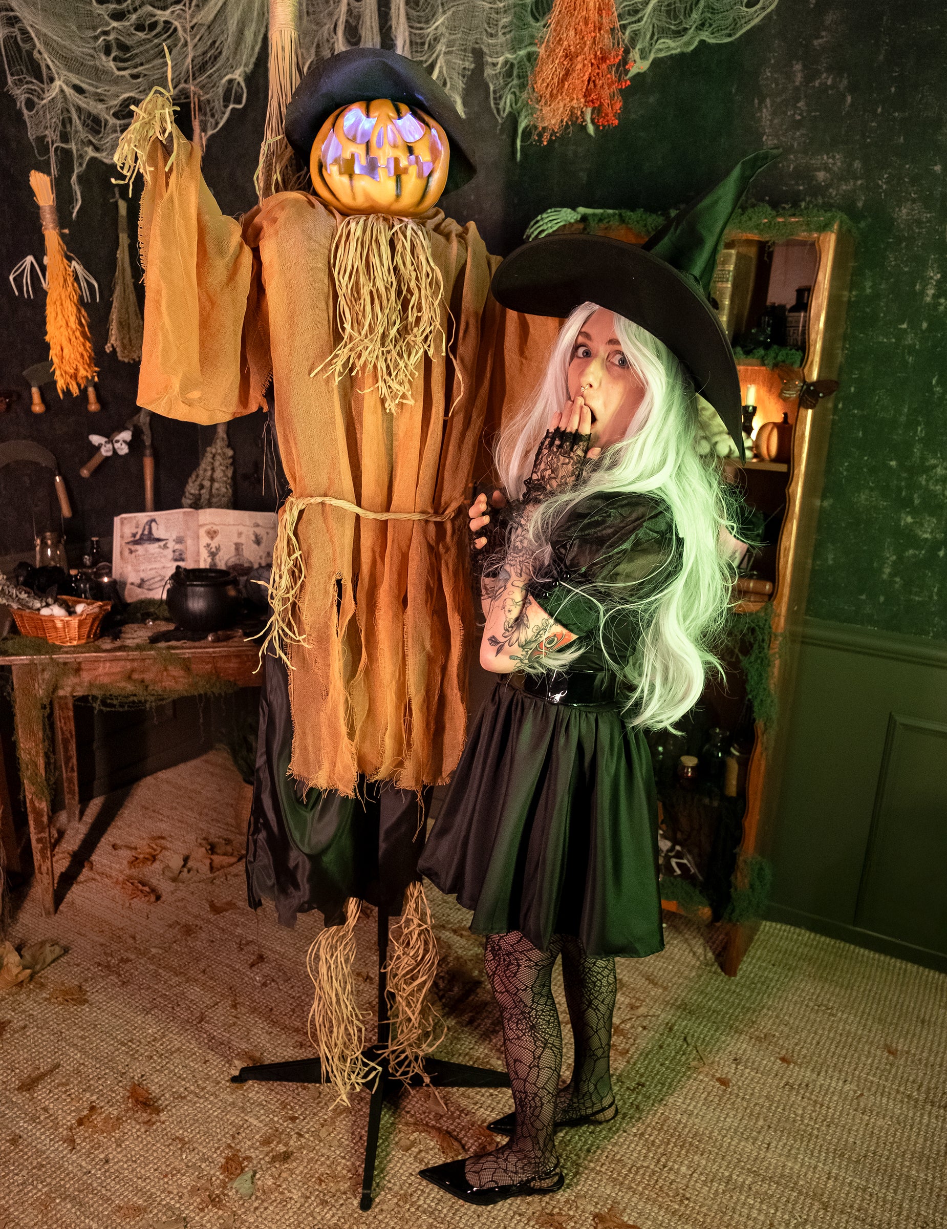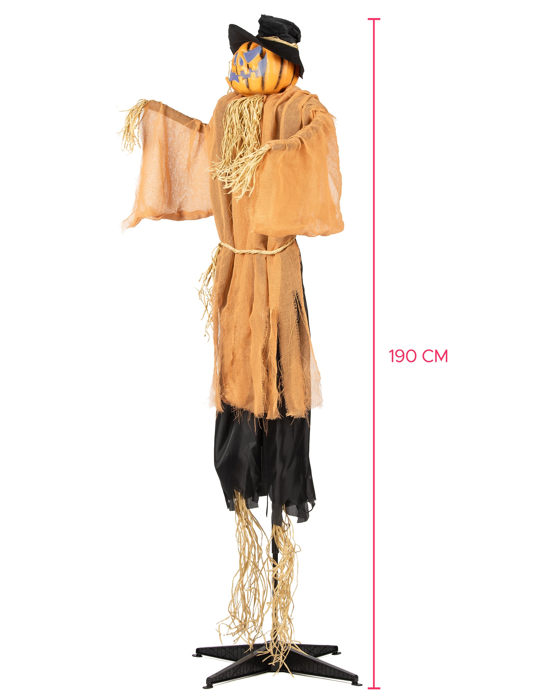 Fă -ți vizitatorii să tremure cu acest decor animat de dovleac rău din 190 cm Aproximativ, o sperietoare uriașă cu o față amenințătoare și un aspect spectral. Îmbrăcat în îmbrăcăminte în stil de paie, se pare că a venit direct dintr-un câmp bântuit. Capul său de dovleac sculptat, cu ochii roșii piercing, se mișcă lent ca și cum să scaneze împrejurimile. Datorită senzorului său de sunet, este activat imediat ce se aude un zgomot: mișcările sale deranjante, efectele sale de lumină și sunetele sale terifiante te scufundă imediat într -o atmosferă de groază. Decorația funcționează cu 3 baterii AA care nu sunt incluse. Perfect pentru a crea o scenă în aer liber înfricoșătoare, pentru a -ți întâmpina oaspeții la intrarea într -un loc bântuit sau de a aduce la viață un decor macabru de Halloween, acest gigant înfricoșător va deveni elementul central al decorului tău.