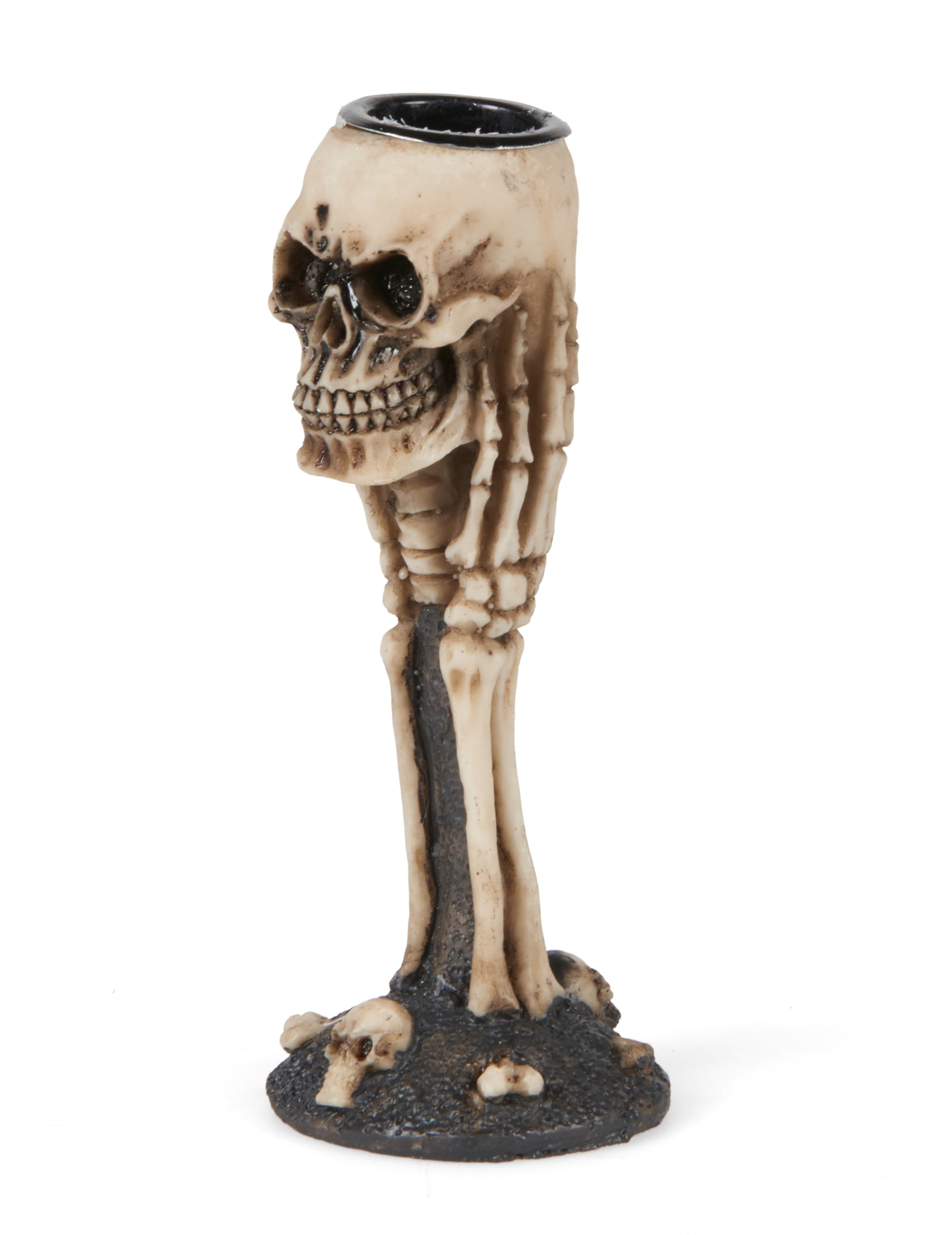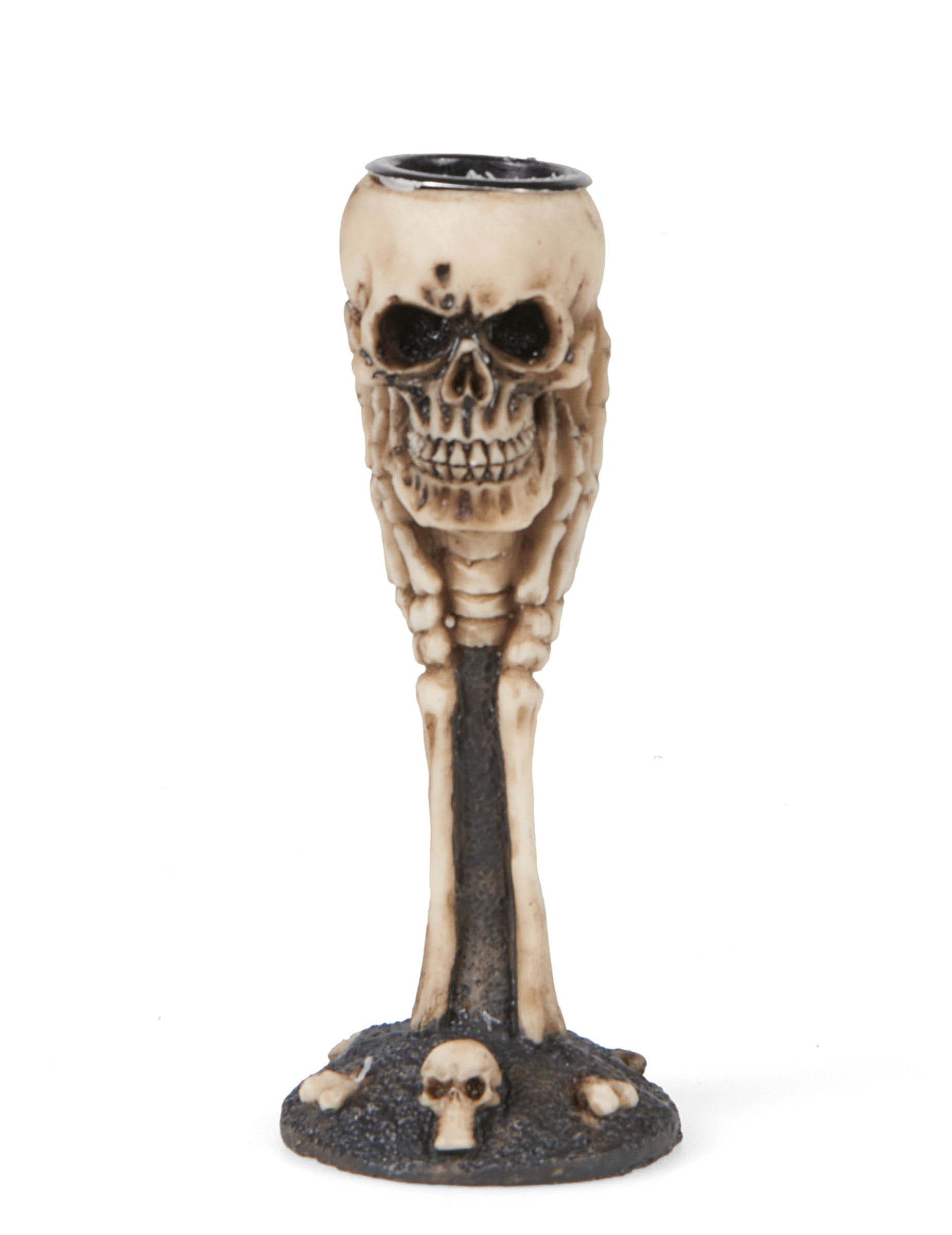 Acest suport de lumânări în formă de craniu și oase de 12,5 cm Aduce o atingere întunecată și originală a decorului tău, perfectă pentru a consolida o atmosferă sumbră sau gotică în timpul evenimentelor tale. Fabricat din rășină solidă, măsoară 5 x 12,5 cm și prezintă o structură osoasă realistă, cu un craniu sculptat în partea de sus și mai multe oase mici la poalele bazei. Finisajele detaliate și finisajul îmbătrânit îi conferă un aspect atât de înfricoșător, cât și de decorativ. Perfect pentru un Halloween înfricoșător, o masă de banchet ghoulish sau un decor al conacului bântuit.