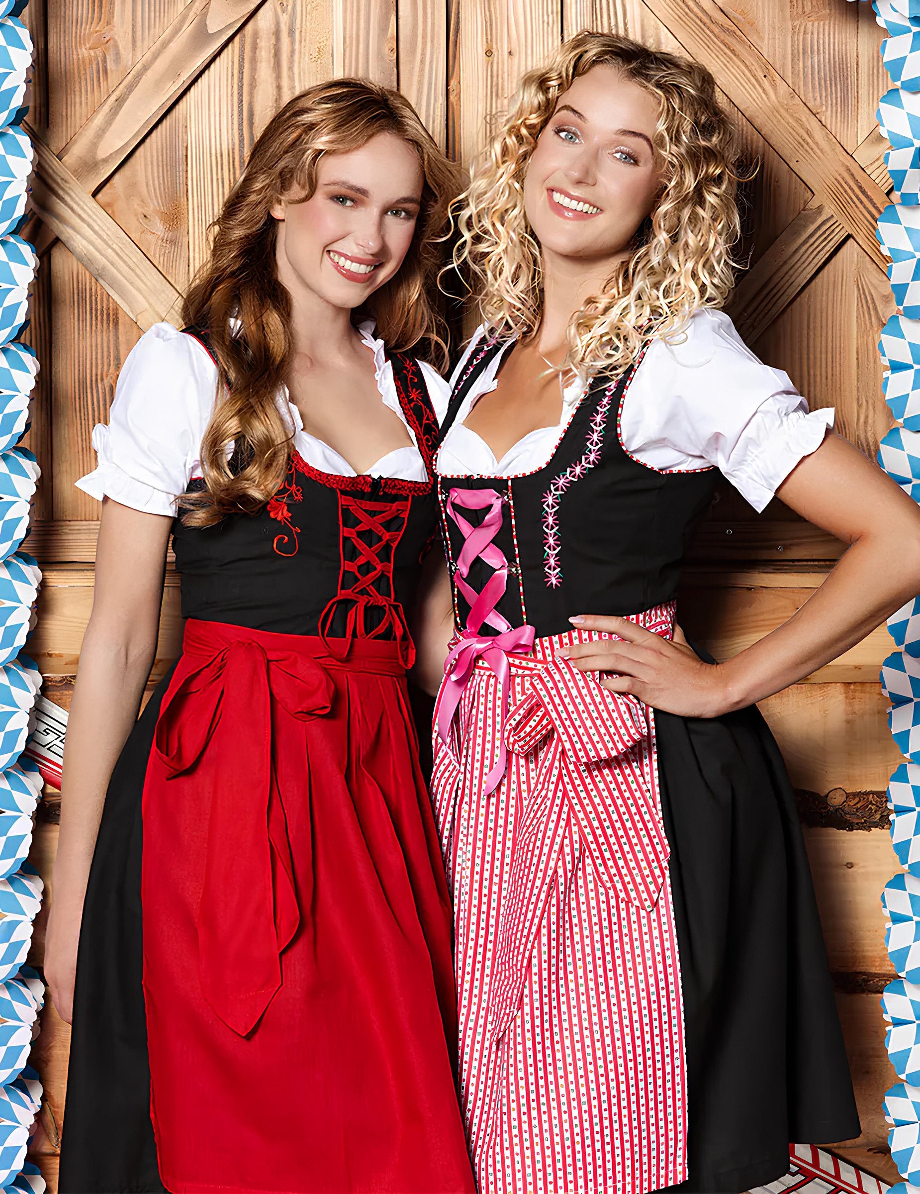 Ce déguisement de Bavaroise noir à broderies rouges pour femme se compose d’une robe noire à bretelles, d’un top blanc intégré à manches bouffantes, et d’un tablier rouge noué à la taille. Le corsage est orné de broderies rouges délicates et d’un laçage central, qui apportent une touche authentique à l’ensemble. Le contraste du noir et du rouge, associé aux finitions traditionnelles, donne à cette tenue un style marqué et élégant, parfait pour une ambiance de fête bavaroise chaleureuse.