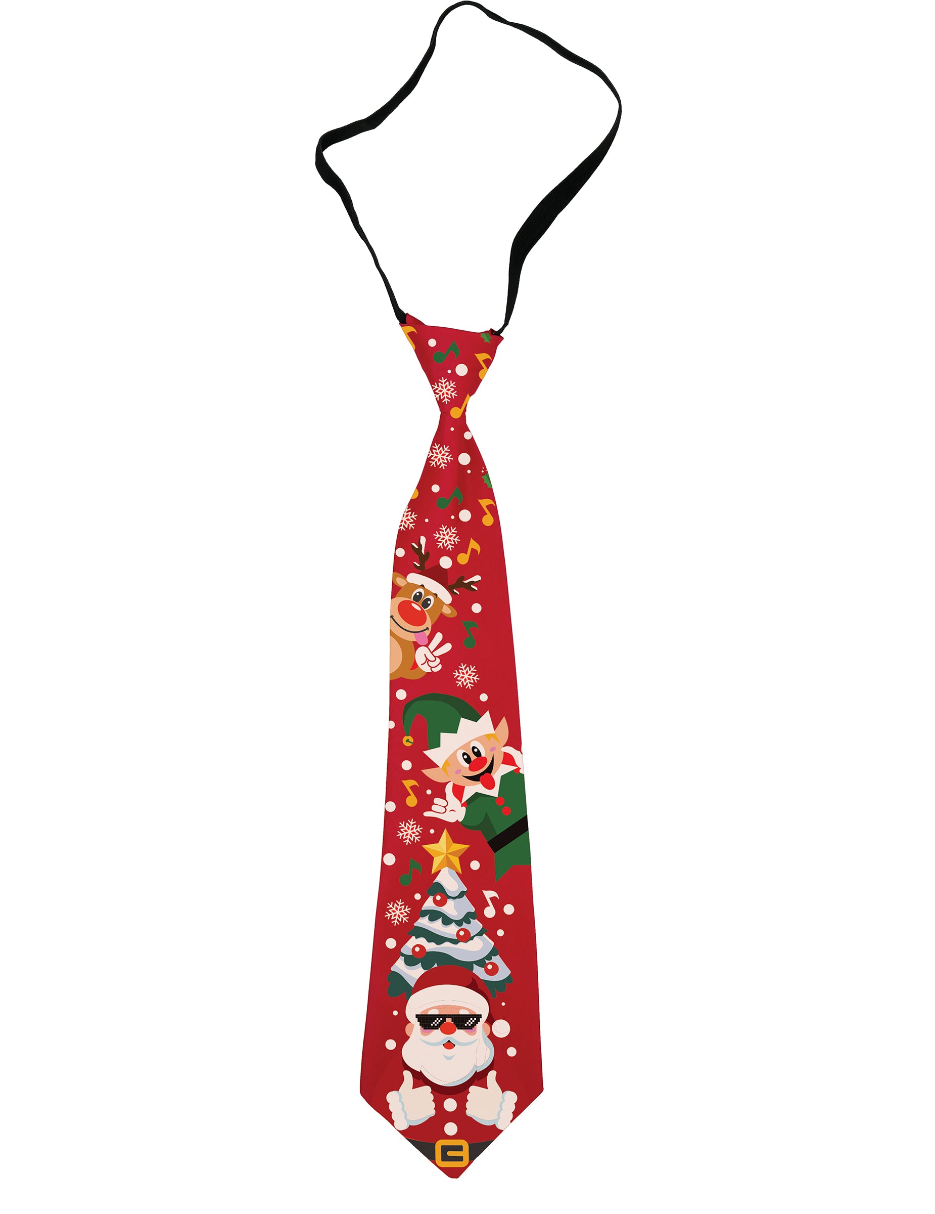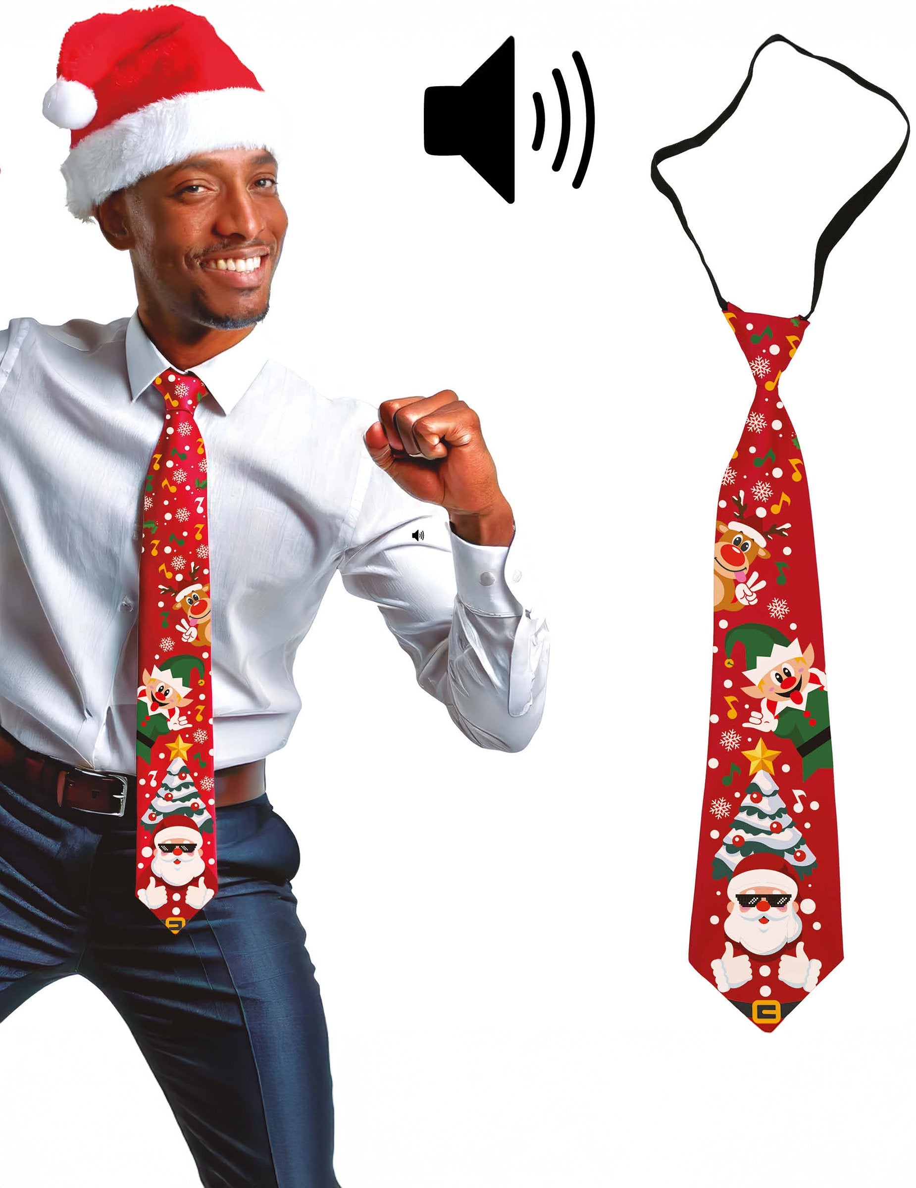 Adaugă o notă festivă ținutei tale cu această cravată muzicală de Crăciun pentru adulți! Decorată cu motive vesele precum Moș Crăciun, un elf și un brad de Crăciun, se închide ușor cu banda elastică neagră. Prezintă un buton care declanșează o melodie de Crăciun, garantând un efect surpriză. Un accesoriu distractiv pentru a aduce un zâmbet prietenilor și familiei, menținând în același timp spiritul sărbătorilor. Funcționează cu 2 baterii LR41 (incluse). Ideală pentru cine de Crăciun, evenimente corporate sau seri festive cu prietenii.