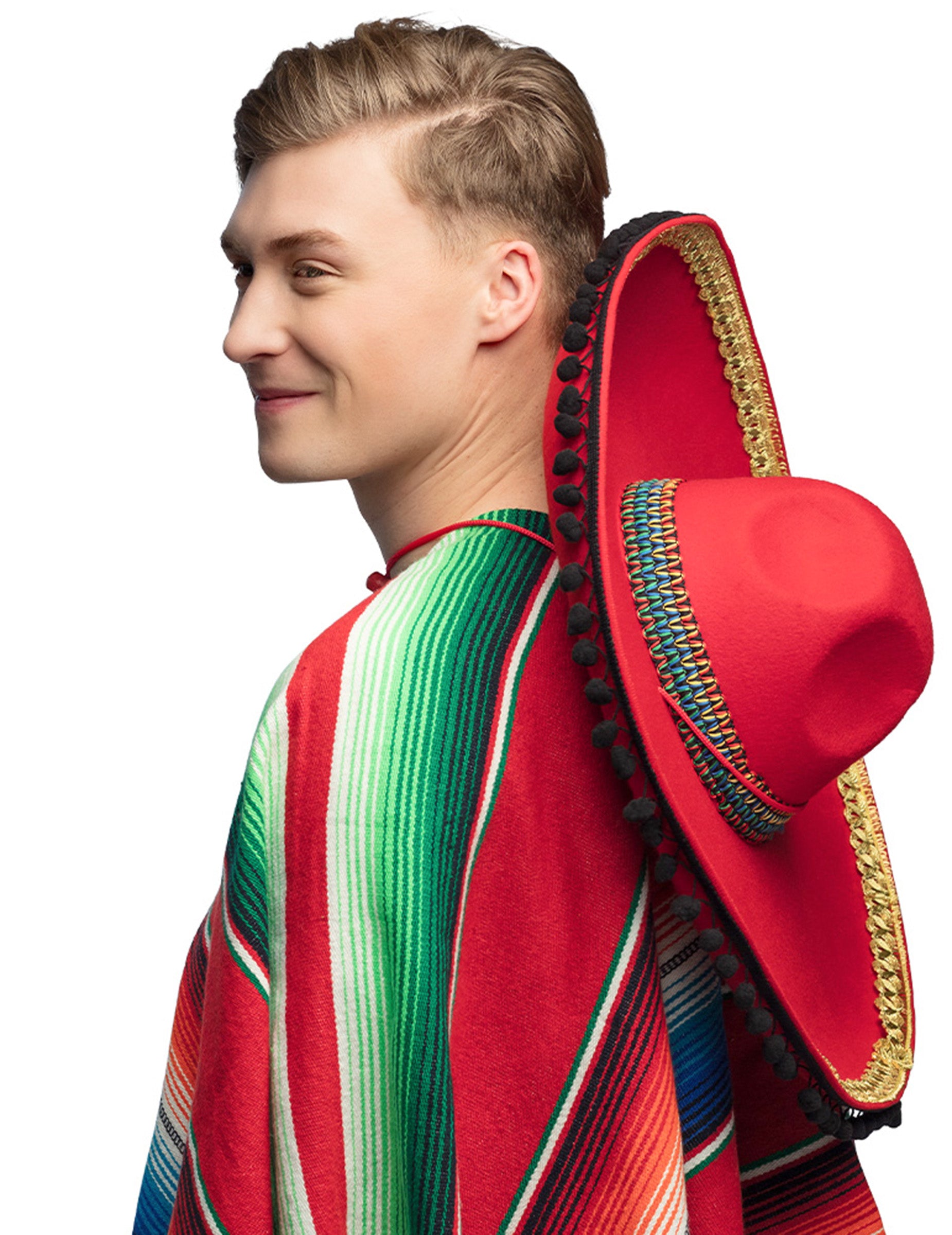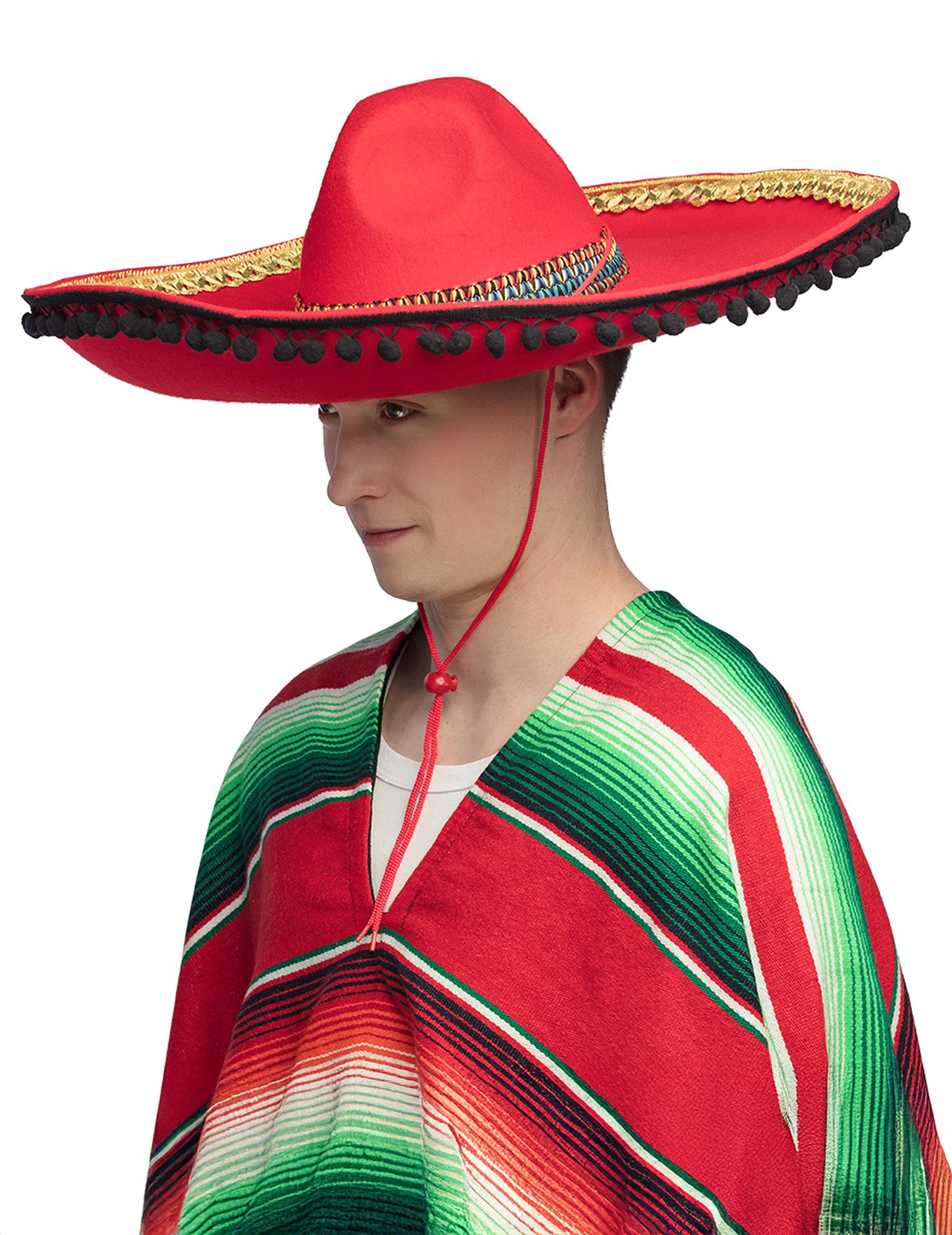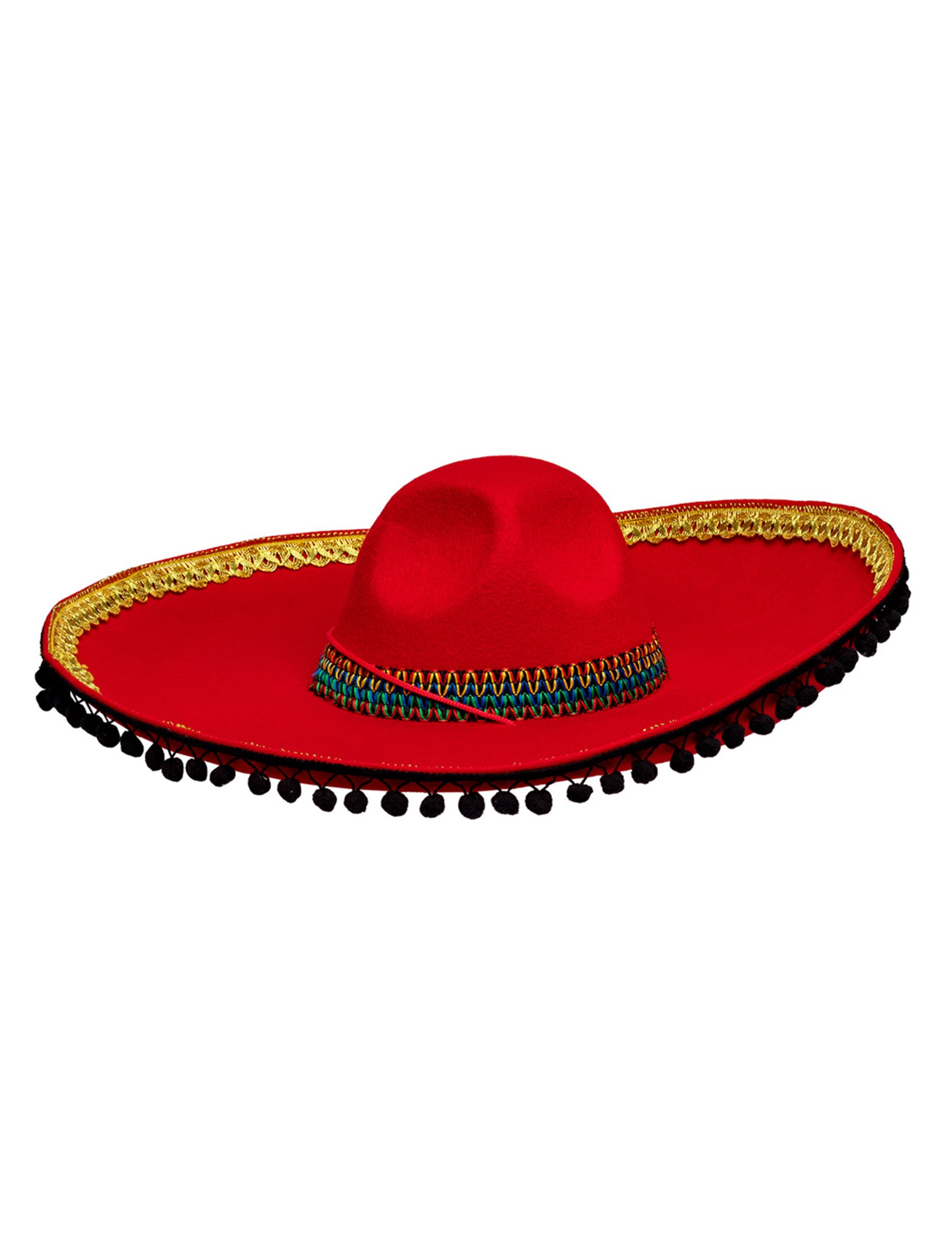 Apportez une ambiance mexicaine authentique avec ce superbe sombrero rouge deluxe décoré de pompons noirs, galons colorés et bordure dorée. Son style traditionnel et festif en fait l’accessoire parfait pour compléter un déguisement mexicain ou donner une touche fun à vos soirées. Avec un diamètre d’environ 57 cm, il convient à la plupart des adultes et se porte confortablement. Idéal pour les soirées à thème mexicain, carnavals, spectacles, festivals ou fêtes déguisées.