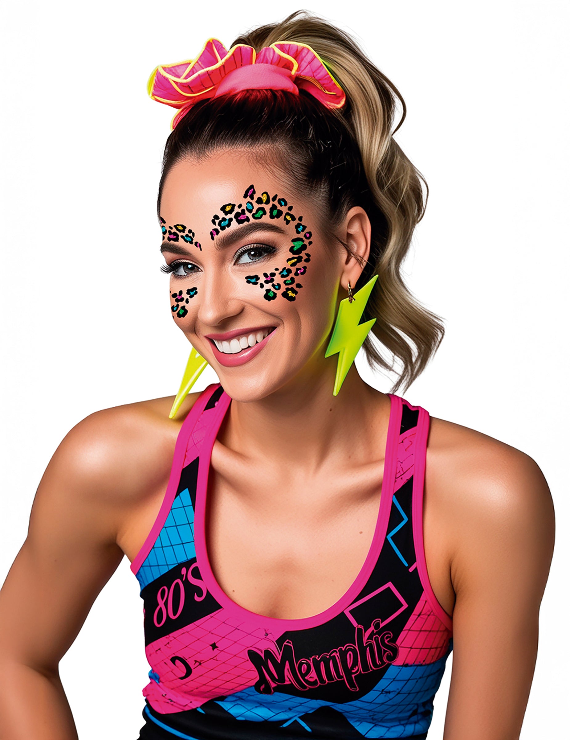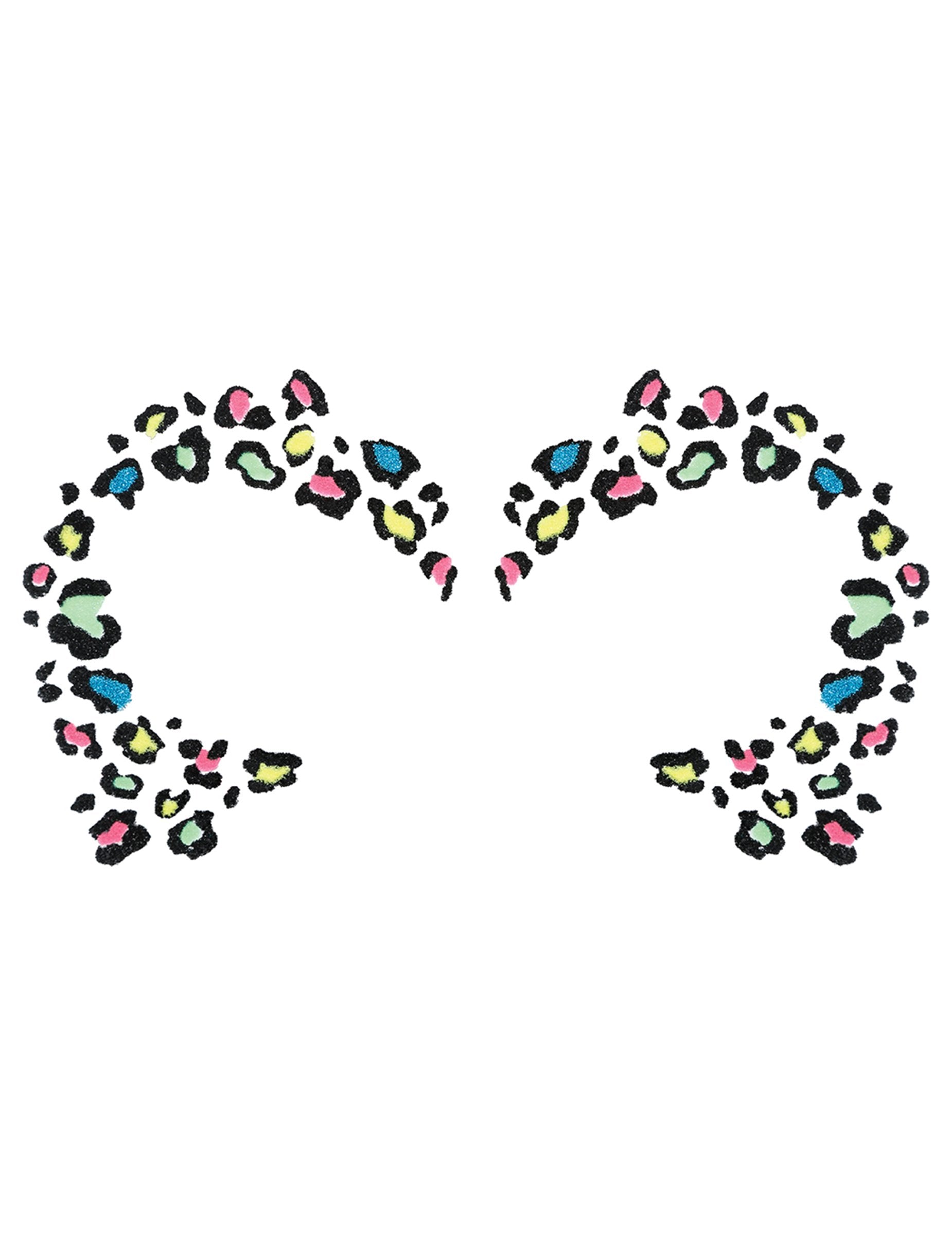 Acest tatuaj temporar cu sclipici multicolor prezintă un imprimeu vibrant de leopard care cu siguranță va atrage toate privirile. Se aplică rapid și este confortabil de purtat, rezista la atingere toată noaptea. Este accesoriul perfect pentru un festival, o petrecere strălucitoare, un carnaval sau o petrecere în costume, adăugând o notă distractivă și orbitoare ținutei tale.