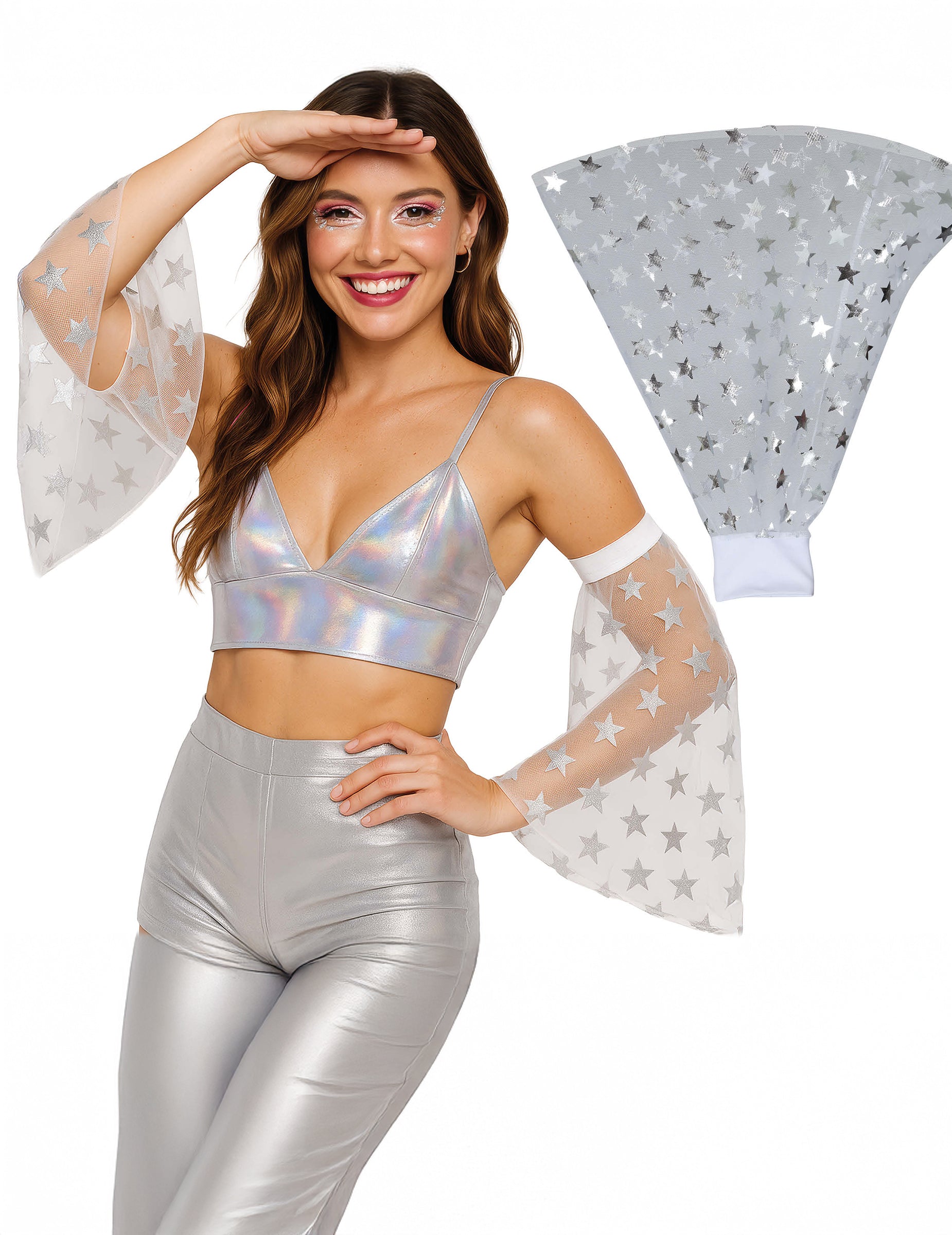 Adăugați o notă sclipitoare ținutei dumneavoastră cu aceste manșete disco argintii decorate cu stele strălucitoare. Confecționate din voal transparent și ușor, se poartă cu ușurință datorită manșetei elastice, asigurând confort și fixare pe tot parcursul petrecerii. Ideale pentru un look disco, un festival, o petrecere costumata sau carnaval, ele vor ilumina mișcările și vor evidenția gesturile de dans.
