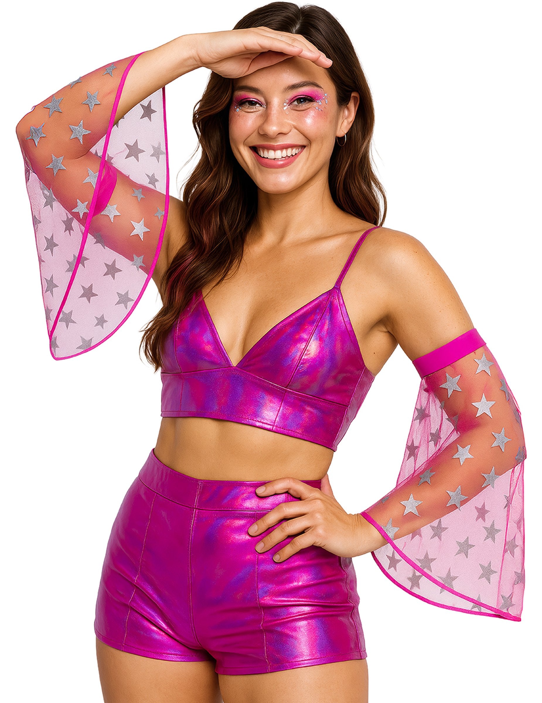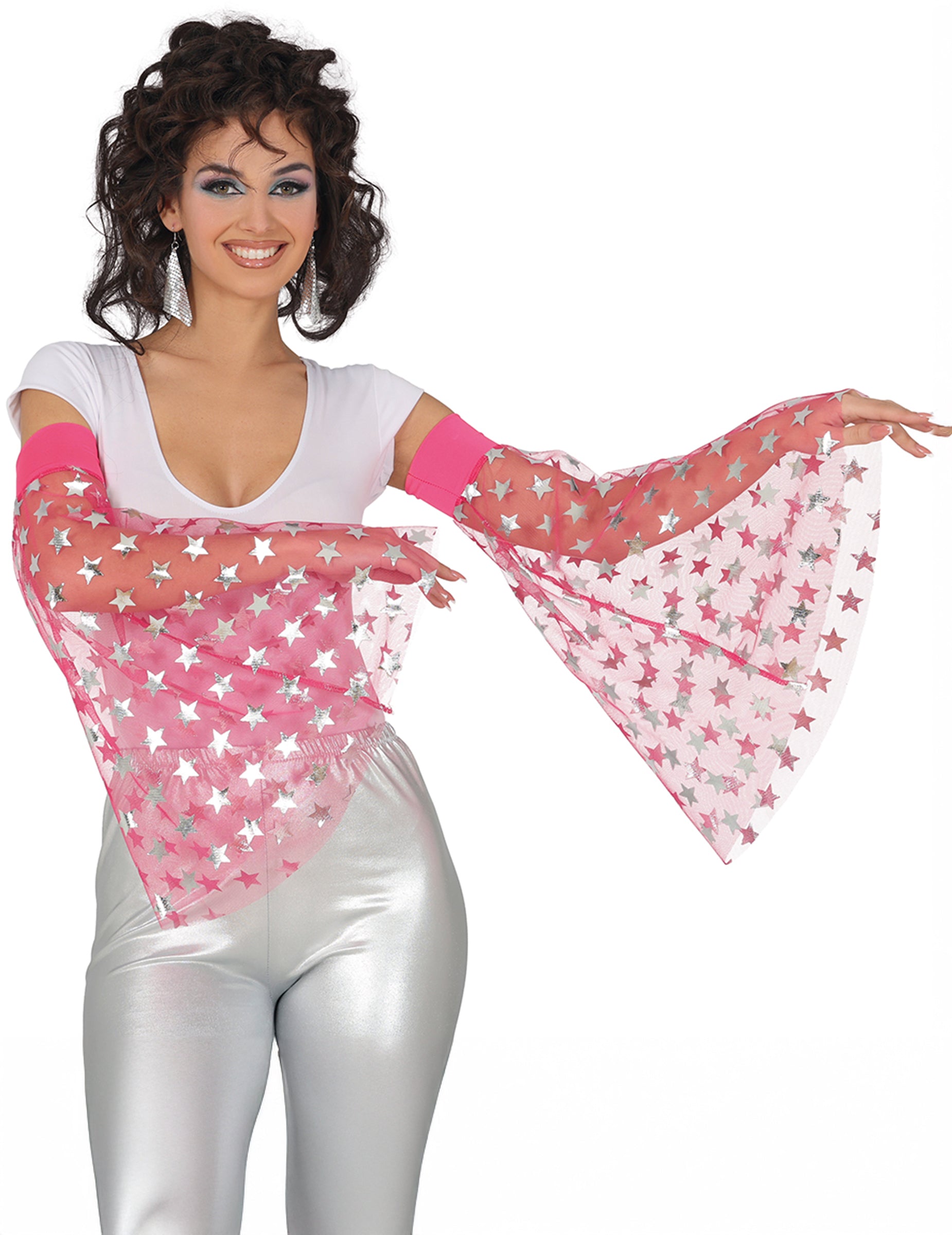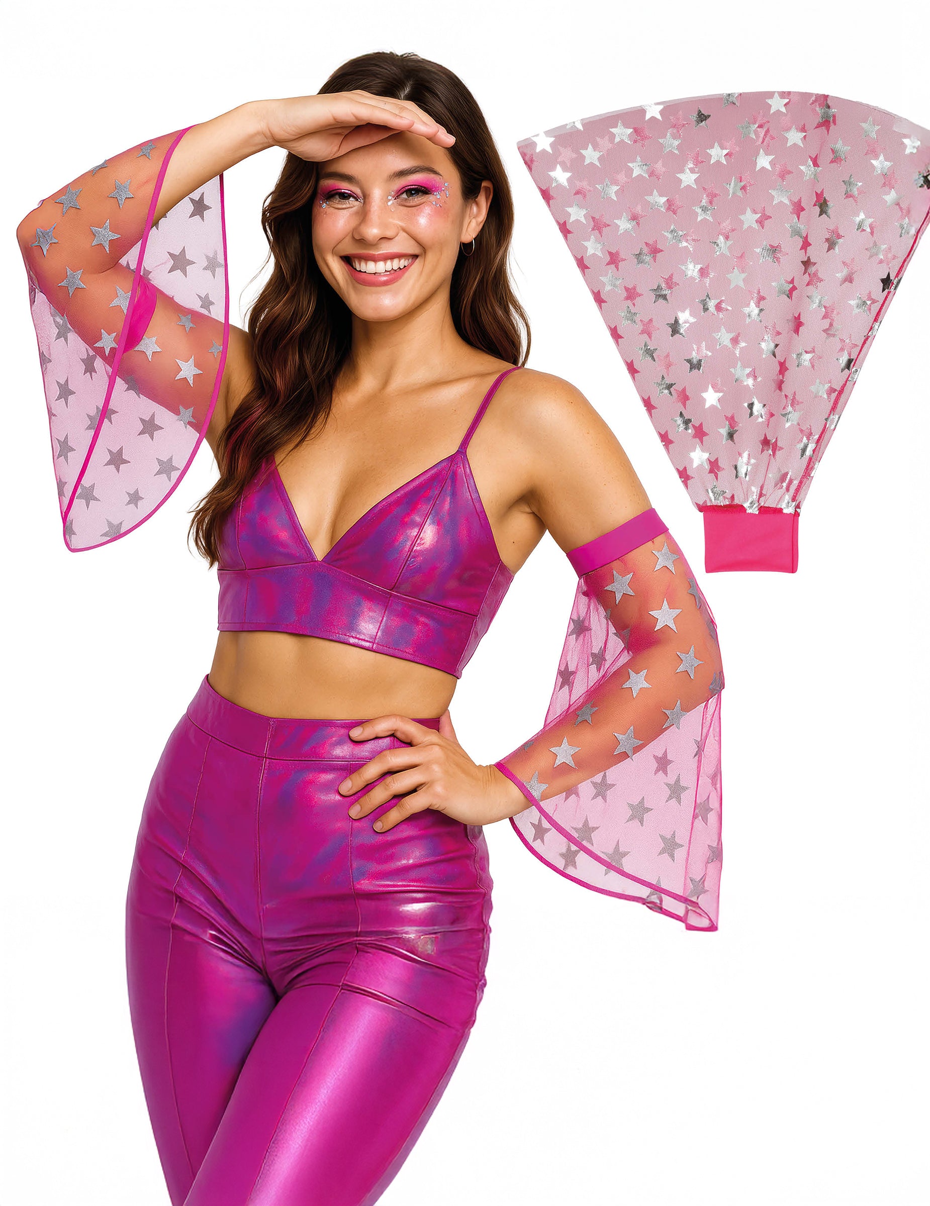 Aceste superbe manșete disco roz decorate cu stele argintii vor adăuga o notă glamour și strălucitoare ținutei tale de petrecere. Confecționate din voal ușor și fluid, se îmbracă ușor datorită manșetei elastice care asigură o bună fixare și confort. Perfecte pentru un costum disco, o petrecere tematică, un festival sau un carnaval, ele aduc instant un look spectaculos și retro.