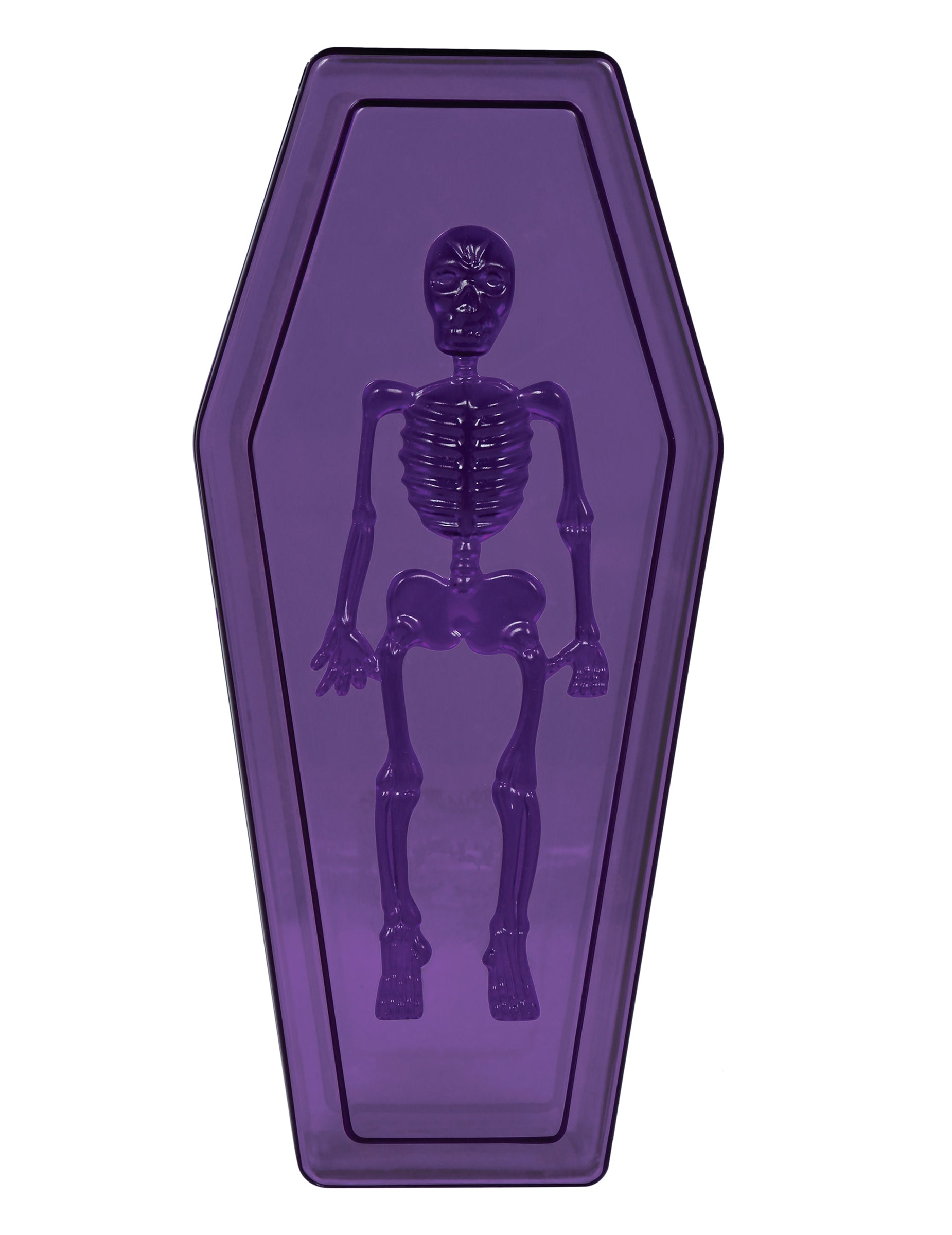 Acest Cutia violetă în formă de sicriu măsoară 19 x 9 cm și are un schelet în relief pe capac. Ideal pentru a ascunde dulciuri sau obiecte mici, atrage atenția și sporește o atmosferă misterioasă.