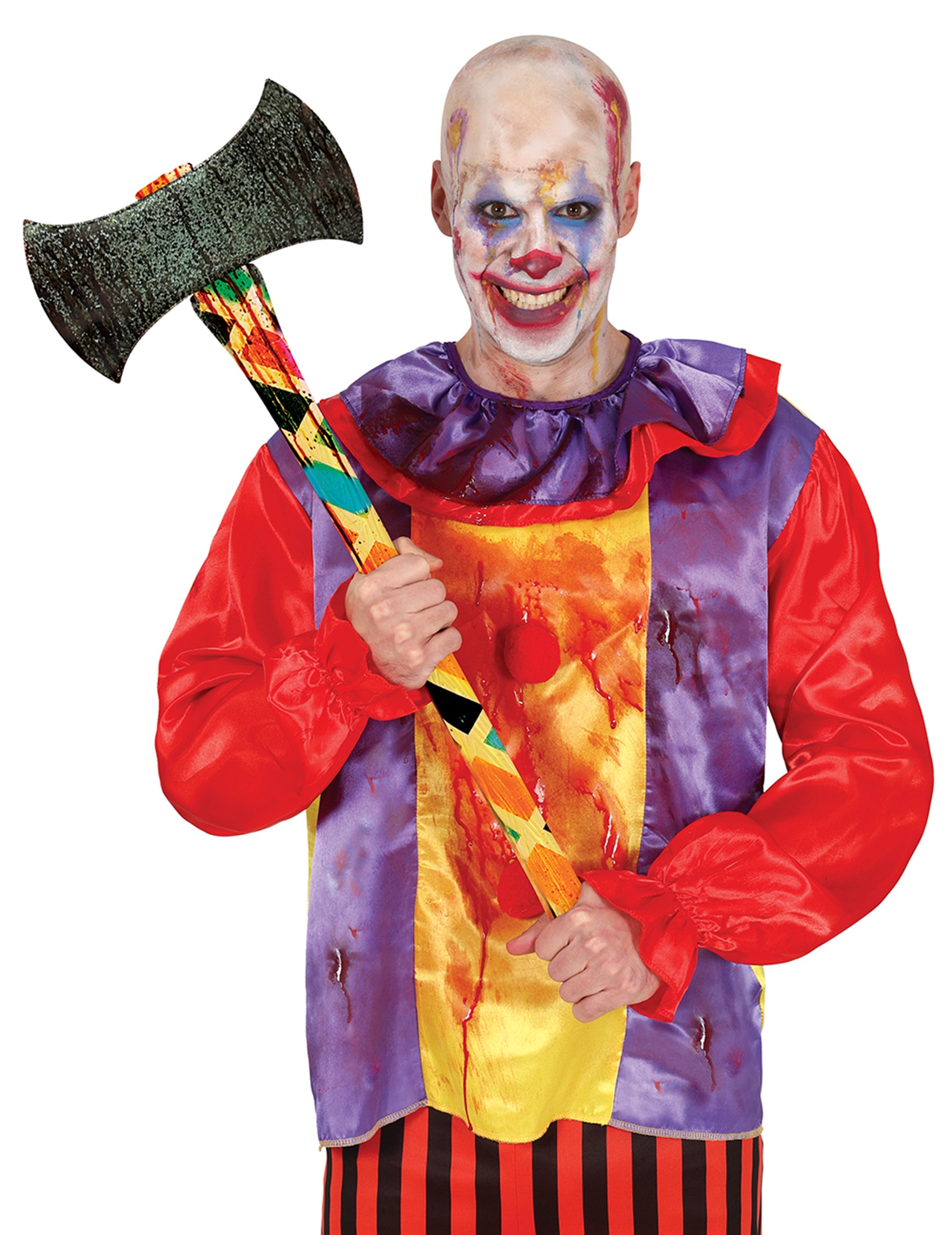 Această secure de clovn de 73 cm cm aproximativ este arma perfectă pentru a răspândi teroarea. Cu mânerul său colorat în stil de circ și lama neagră cu efect învechit, joacă pe contrastul dintre lumea copilărească a spectacolului și brutalitatea unui accesoriu înfricoșător.