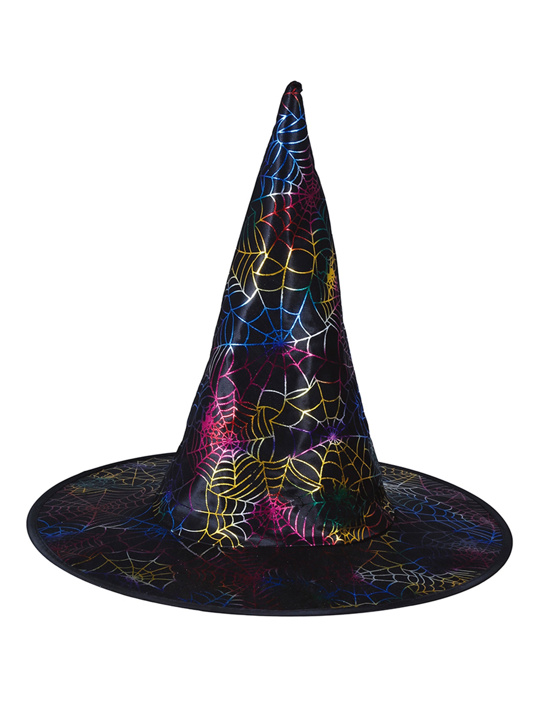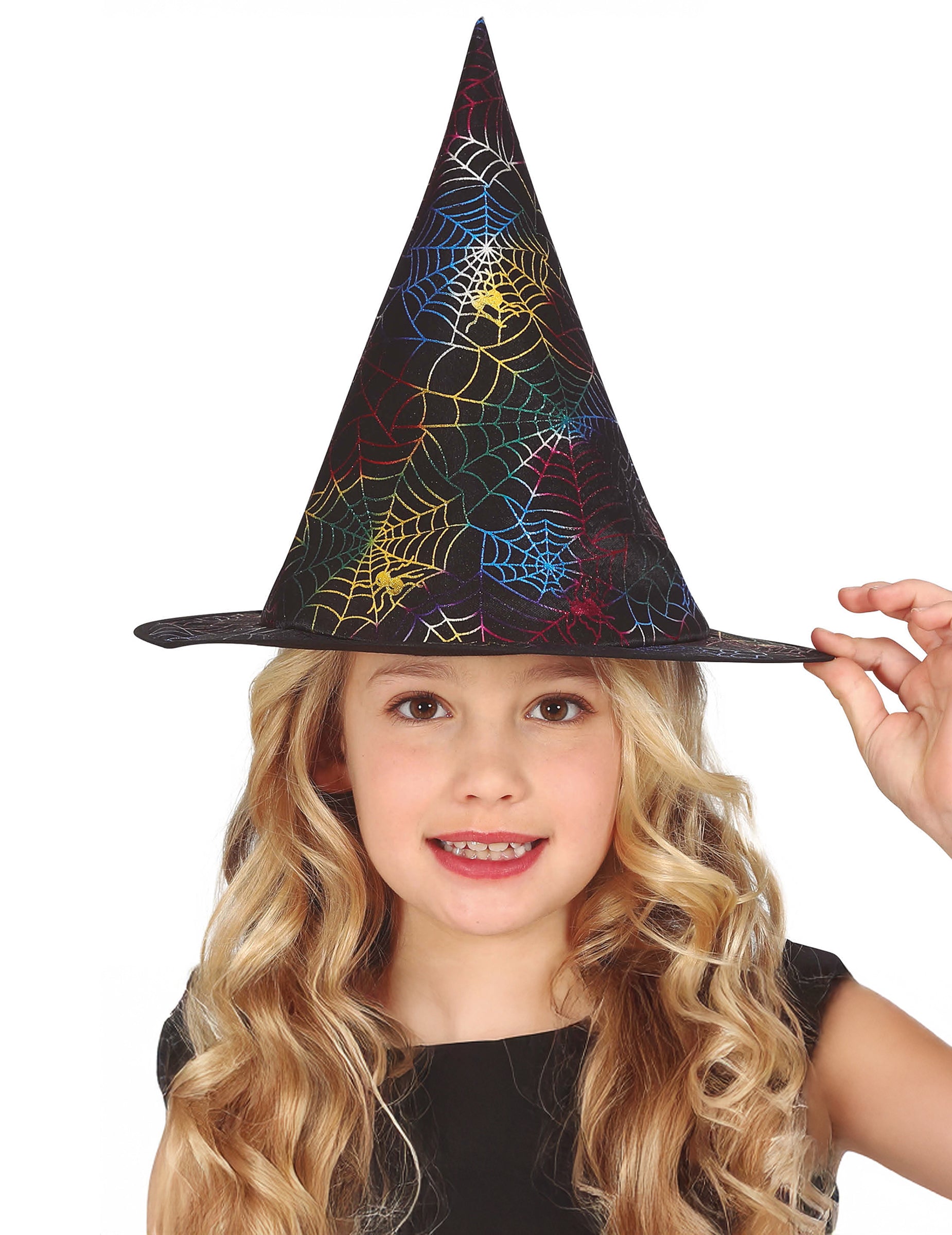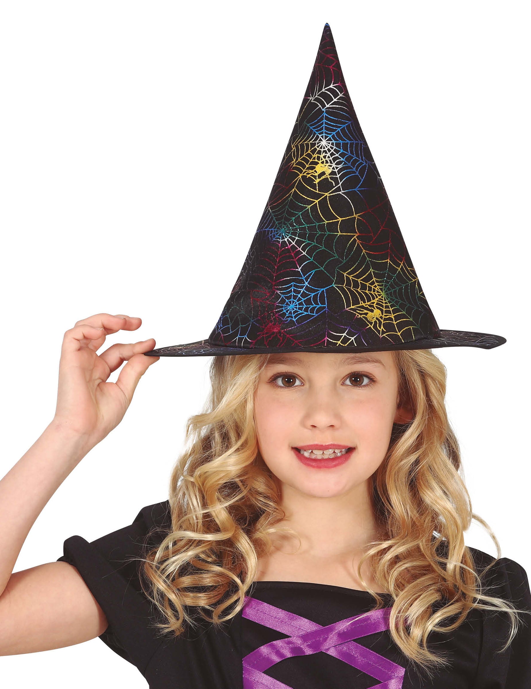 Această pălărie de vrăjitoare neagră este decorată cu superbe pânze de păianjen multicolore care strălucesc în funcție de lumină. Forma sa tradițională, ascuțită și borul larg o fac accesoriul ideal pentru a completa un costum de vrăjitoare pentru copii. Originală și strălucitoare, aduce o notă de fantezie și mister petrecerilor de Halloween sau carnavalurilor.