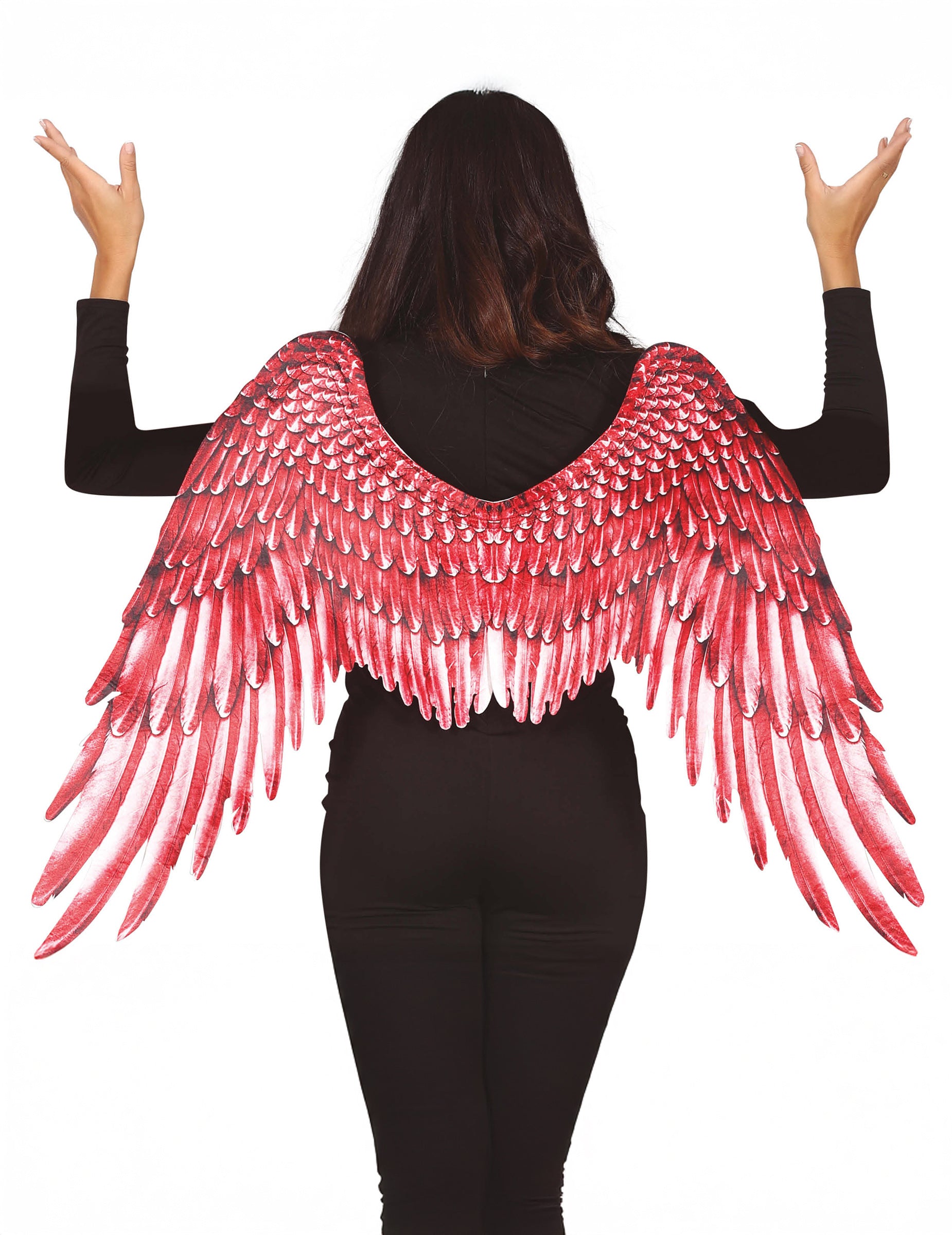Aceste aripi roșii pentru adulți sunt din material textil. Sunt imprimate cu un model de pene roșii și măsoară aproximativ 100 x 70 cm. Se poartă ușor cu ajutorul bretelelor, ca un rucsac.