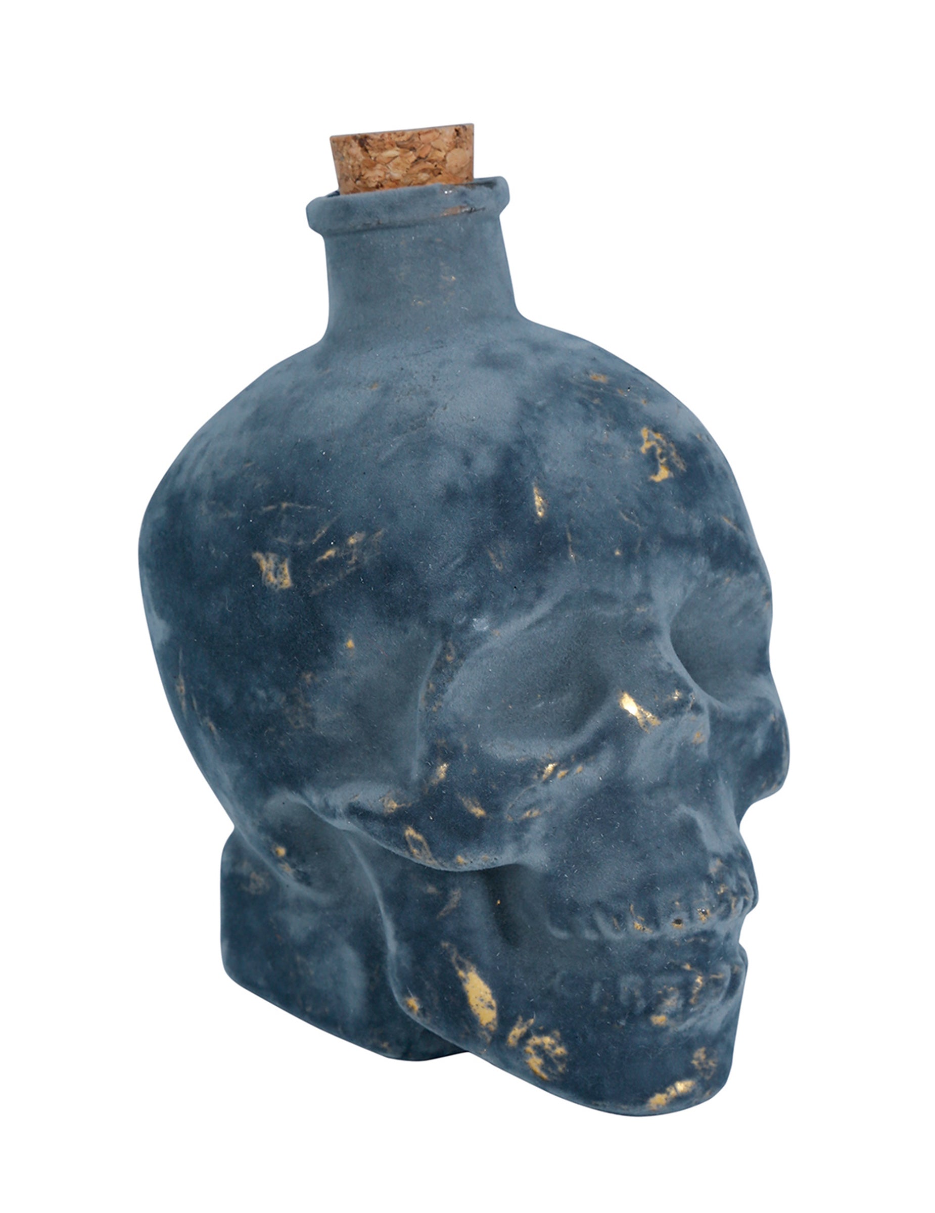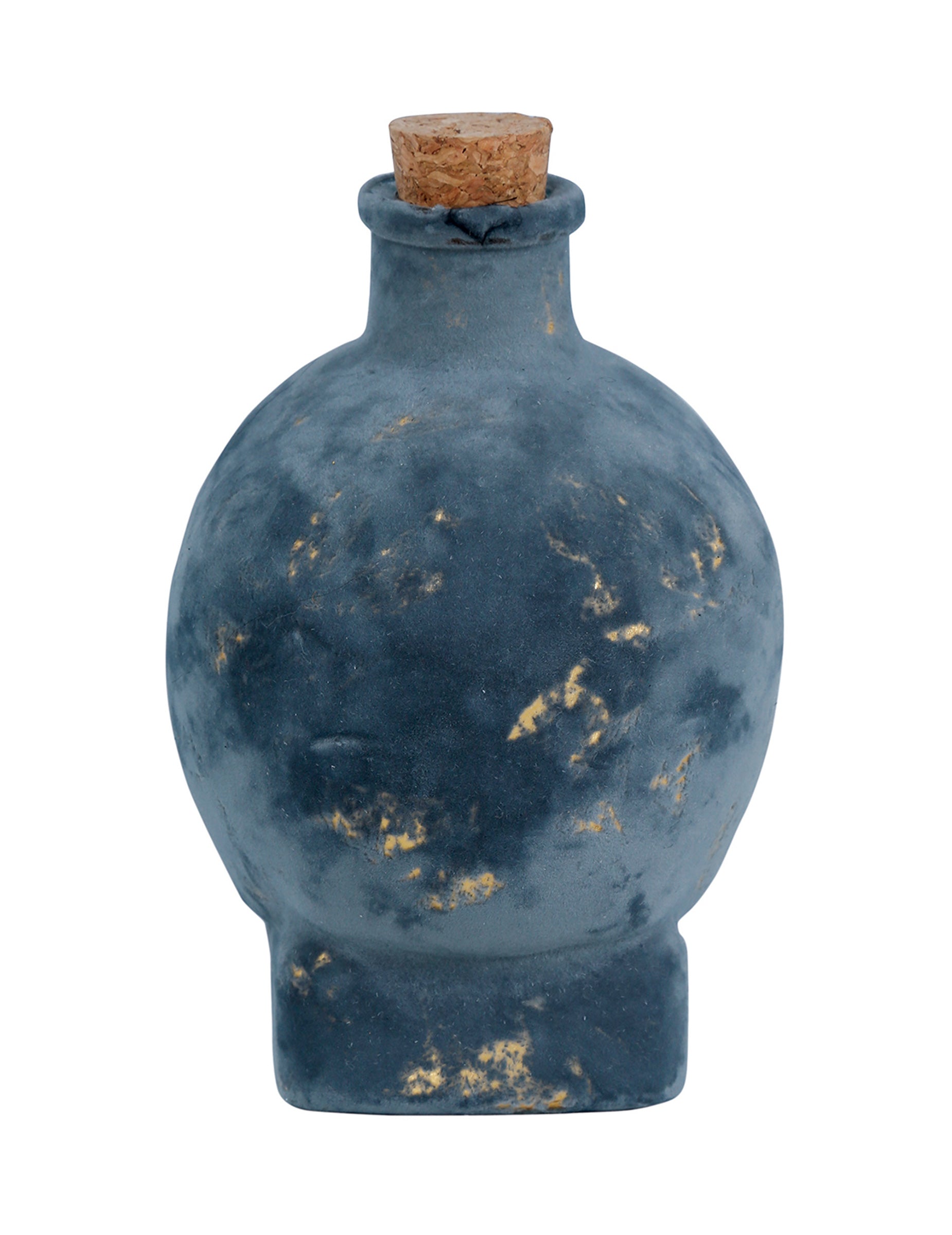 Această sticlă de sticlă măsoară aproximativ 13 cm. Reprezintă un craniu cu aspect îmbătrânit, ca și cum ar fi fost acoperit de-a lungul timpului cu un strat subțire de mușchi. Va completa perfect decorațiunile pentru masa de Halloween.