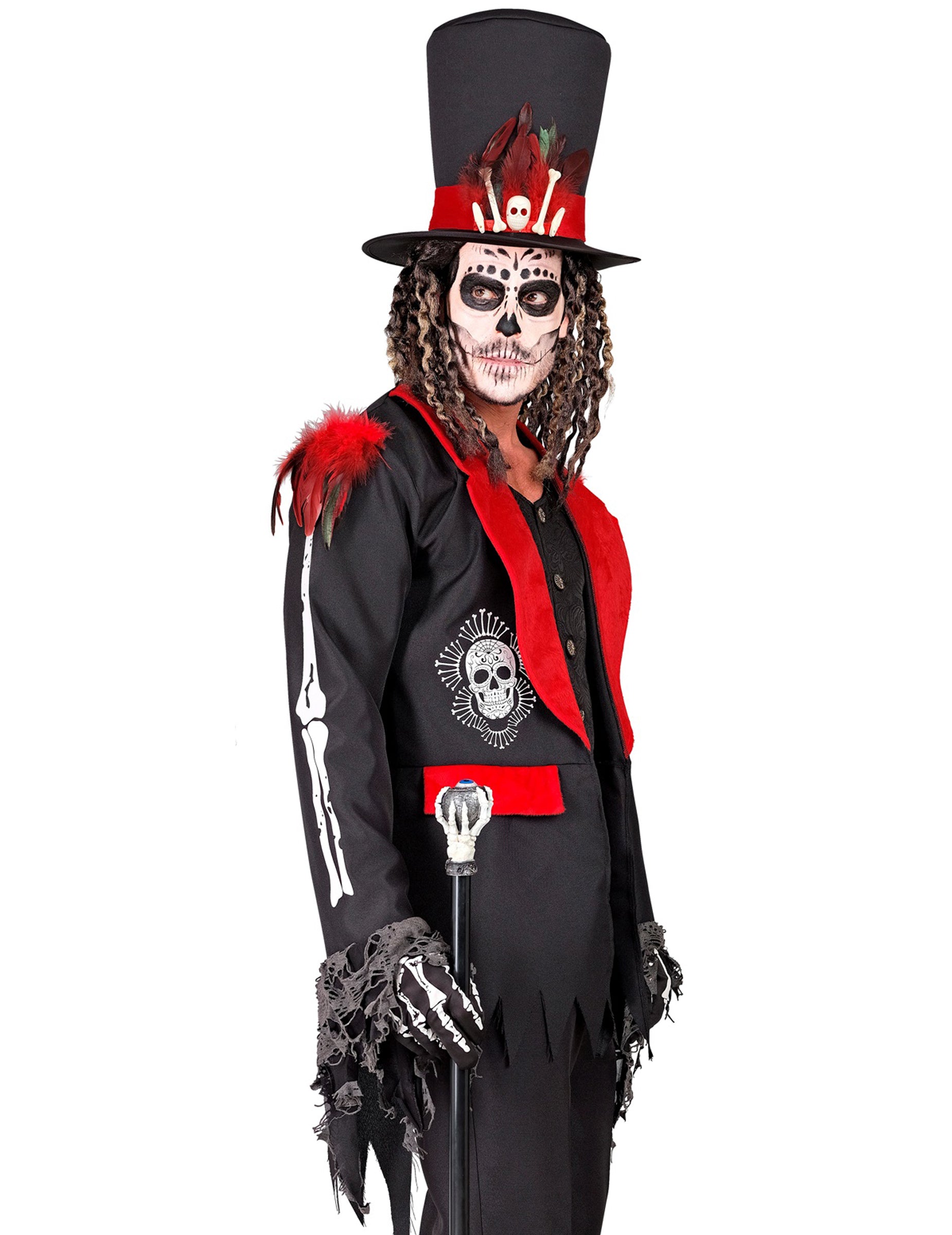 Întruchipează un practicant al artelor oculte cu acest costum impresionant de maestru voodoo. Sacoul negru decorat cu detalii roșii, asociat cu o vestă elegantă, oferă o siluetă întunecată și carismatică. Pălăria cilindrică decorată cu pene și cranii completează acest look înfricoșător și mistic.