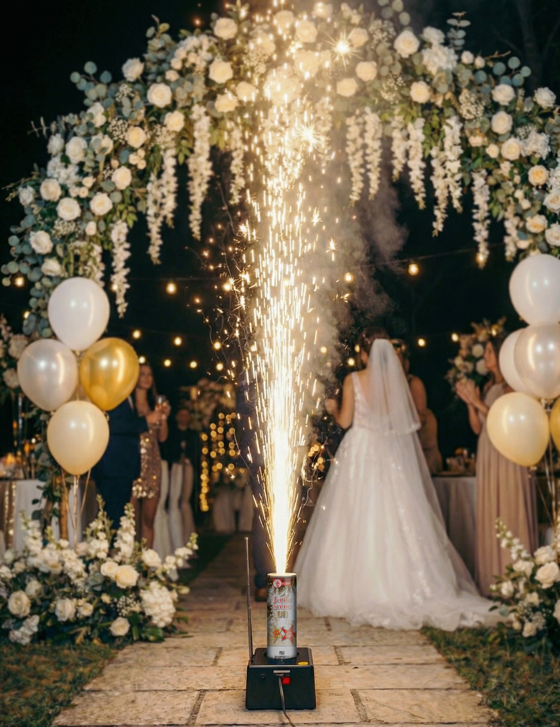 Odată activat, jetul ridică un nor auriu până la 2 metri înălțime, ideal pentru a însoți o nuntă, o petrecere de Revelion, o zi de naștere, un spectacol sau orice altă sărbătoare în aer liber.