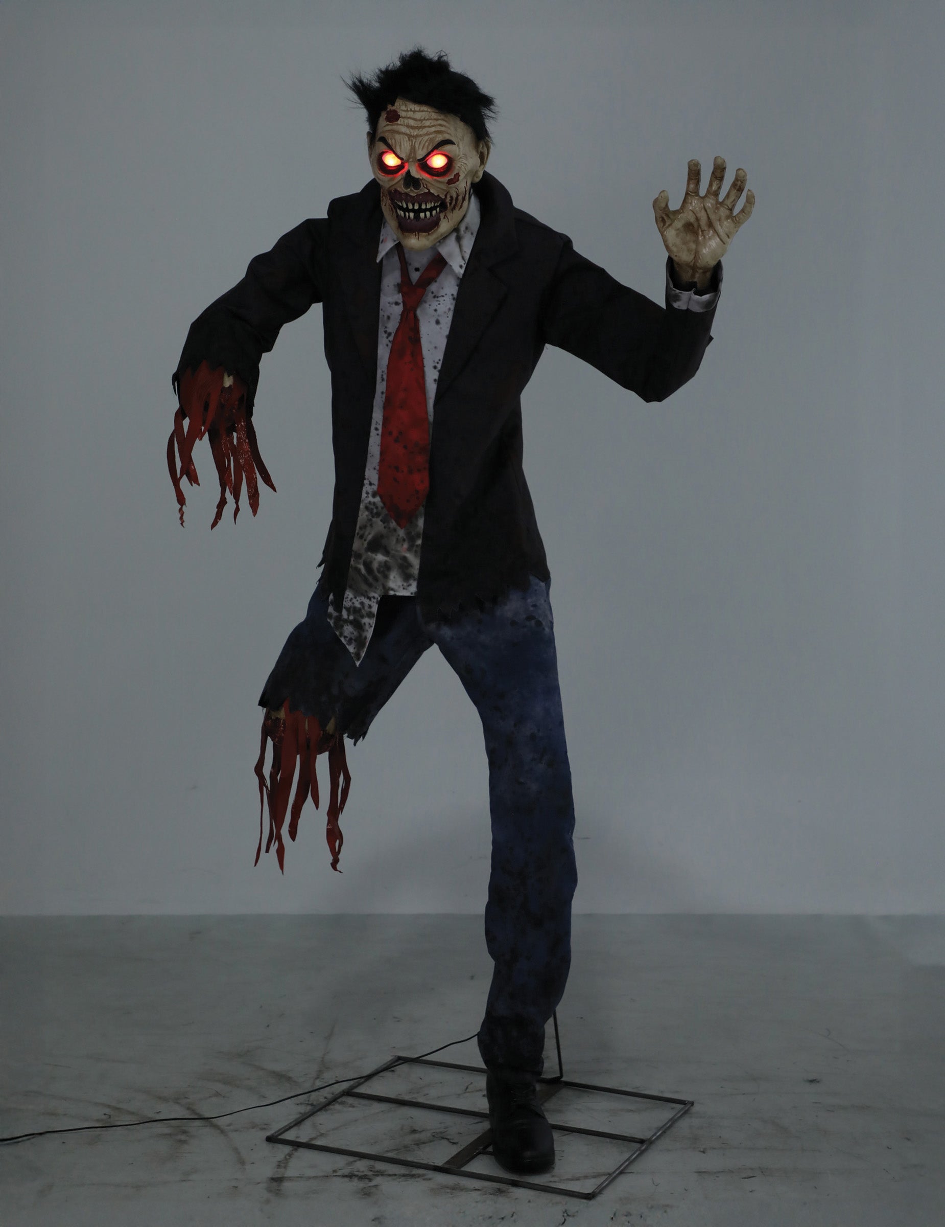 Acest zombi animat cu fracturi de aproximativ 1,8 metri pare gata să sară în orice moment. Cu costumul său sfâșiat și privirea roșiatică, aduce o notă înfiorătoare decorului tău de Halloween.
