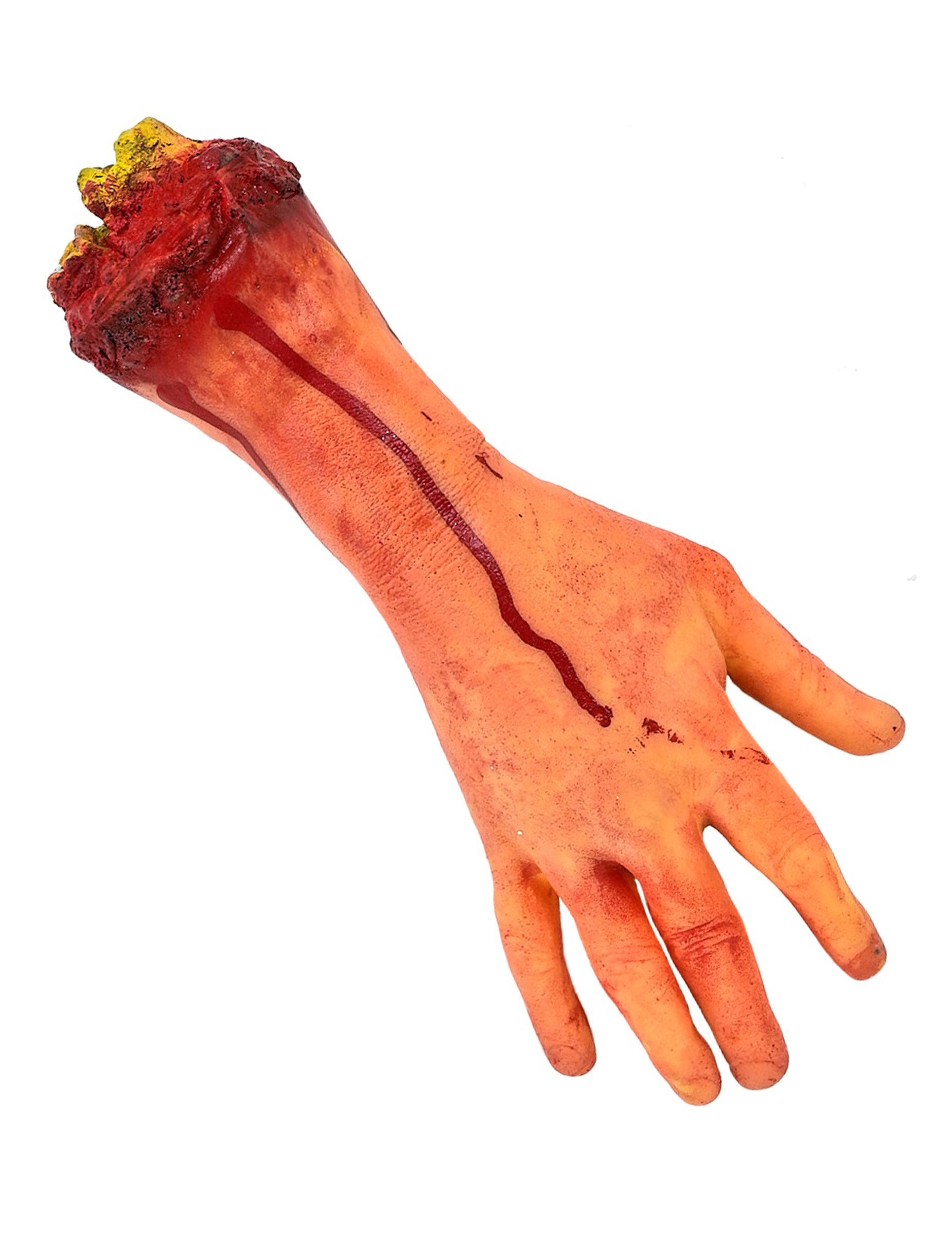Cu culoarea sa realistă a pielii, degetele alungite și urmele de sânge închise la culoare care se întind până la încheietură, această mână tăiată însângerată în mărime reală este perfectă pentru a crea un efect de panică imediată. Partea secționată, colorată în roșu închis și galben, lasă să se vadă o rană deschisă impresionantă.