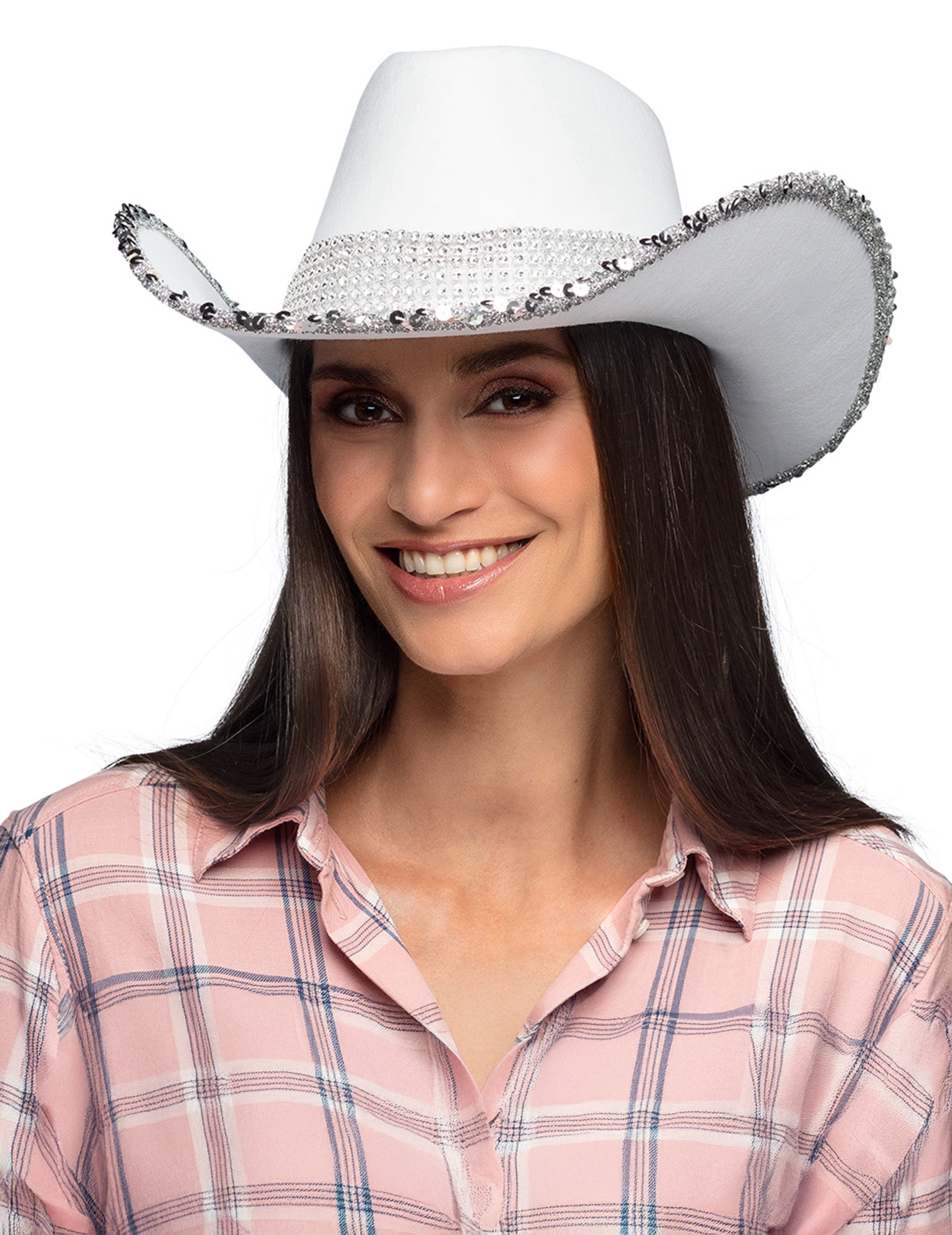 Pălărie de cowboy albă pentru adulți cu strasuri