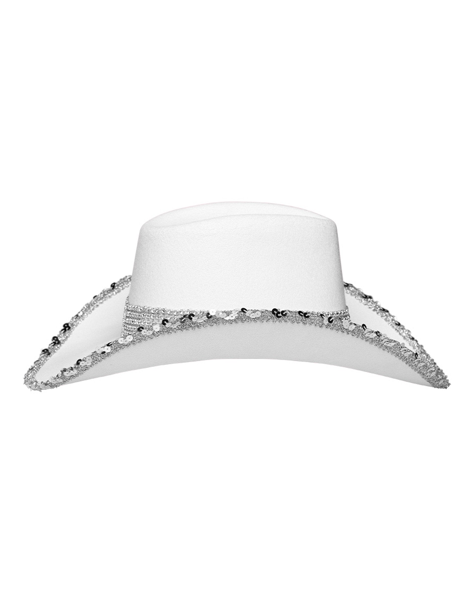 Această pălărie albă de cowboy pentru adulți este perfectă pentru o petrecere a burlacilor plină de farmec, un festival la modă sau o petrecere costumată unică. Efectul luminos din piele întoarsă, banda strălucitoare cu strasuri și borul cu bordură argintie o fac o piesă elegantă și festivă. Completează perfect o ținută modernă de cowgirl, fie că este vorba de o petrecere a burlacilor, carnaval, Revelion sau orice eveniment cu tematică western.