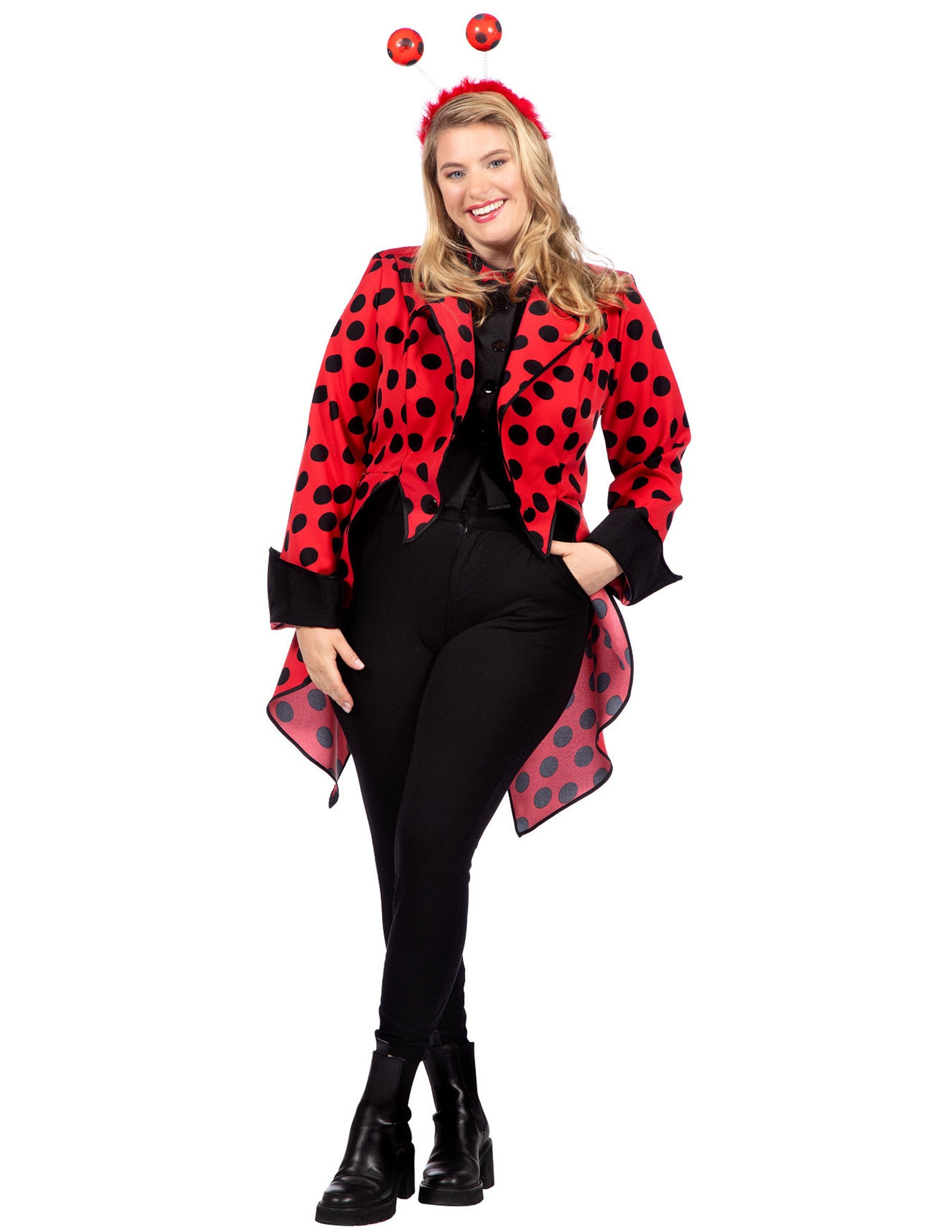 Această jachetă frac de buburuză pentru femei este accesoriul ideal pentru a transforma instantaneu ținuta ta într-un look distractiv și elegant.