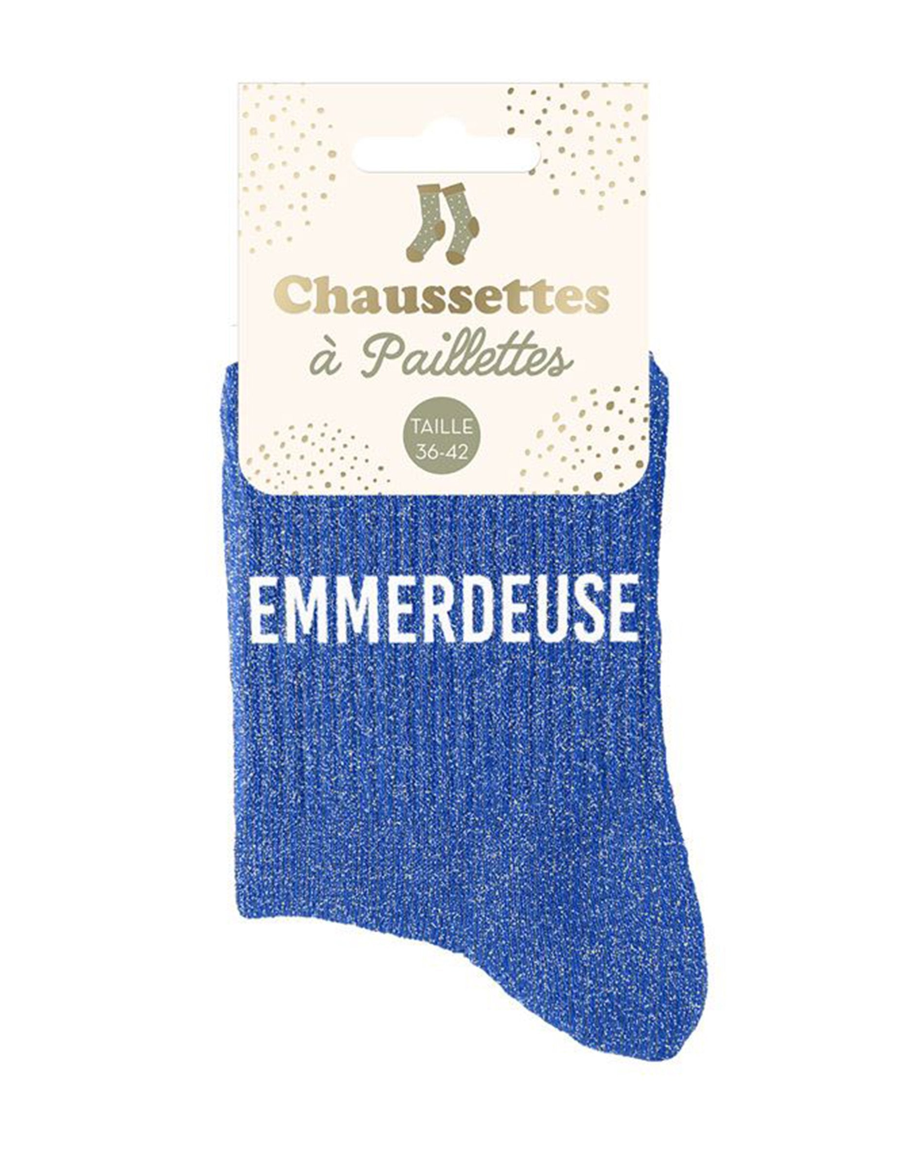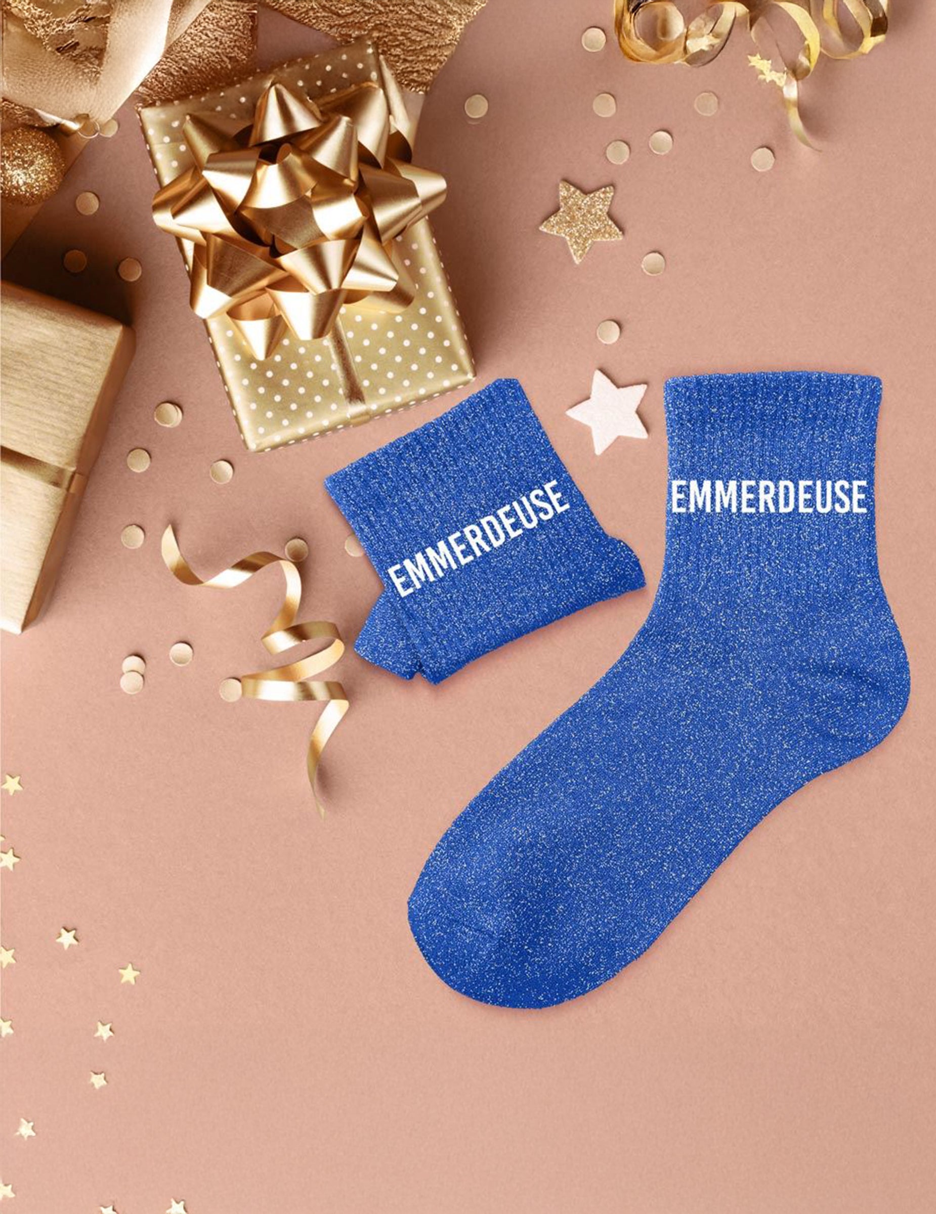 Lasă-ți personalitatea să strălucească cu aceste șosete albastre cu sclipici pentru femei, mărimile 36-42! Împodobite cu cuvântul „EMMERDEUSE” (Târfă) în litere albe, acestea combină îndrăzneala, umorul și stilul. Materialul lor moale și elastic oferă confort la purtare, în timp ce sclipiciul strălucitor adaugă o notă de lumină ținutei tale. Un accesoriu distractiv și original, perfect ca un cadou plin de personalitate sau pentru a-ți exprima temperamentul cu strălucire și umor.
