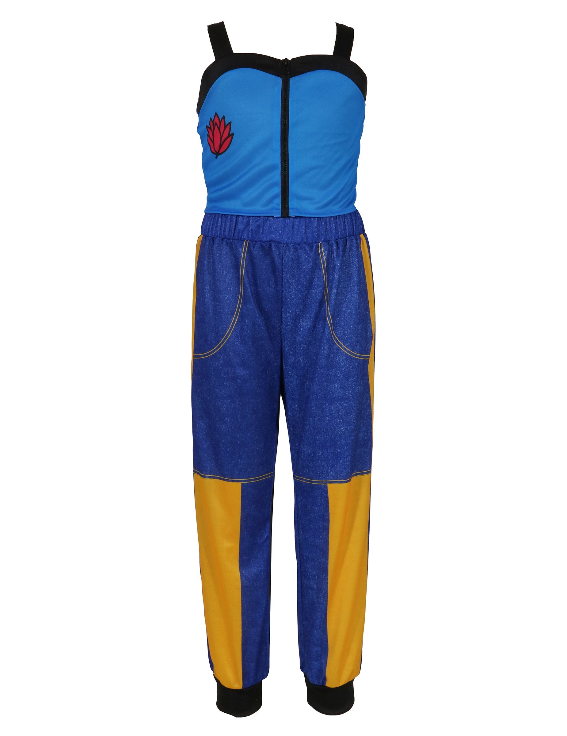 Topul este albastru și negru, cu un fermoar adevărat care se deschide complet în față pentru un aspect modern și ultra-elegant, precum și un imprimeu floral frumos pe o parte care adaugă o notă feminină și originală. Pantalonii au un imprimeu denim foarte realist, cu detalii galben strălucitor care energizează întreaga ținută și îi sporesc aspectul la modă.