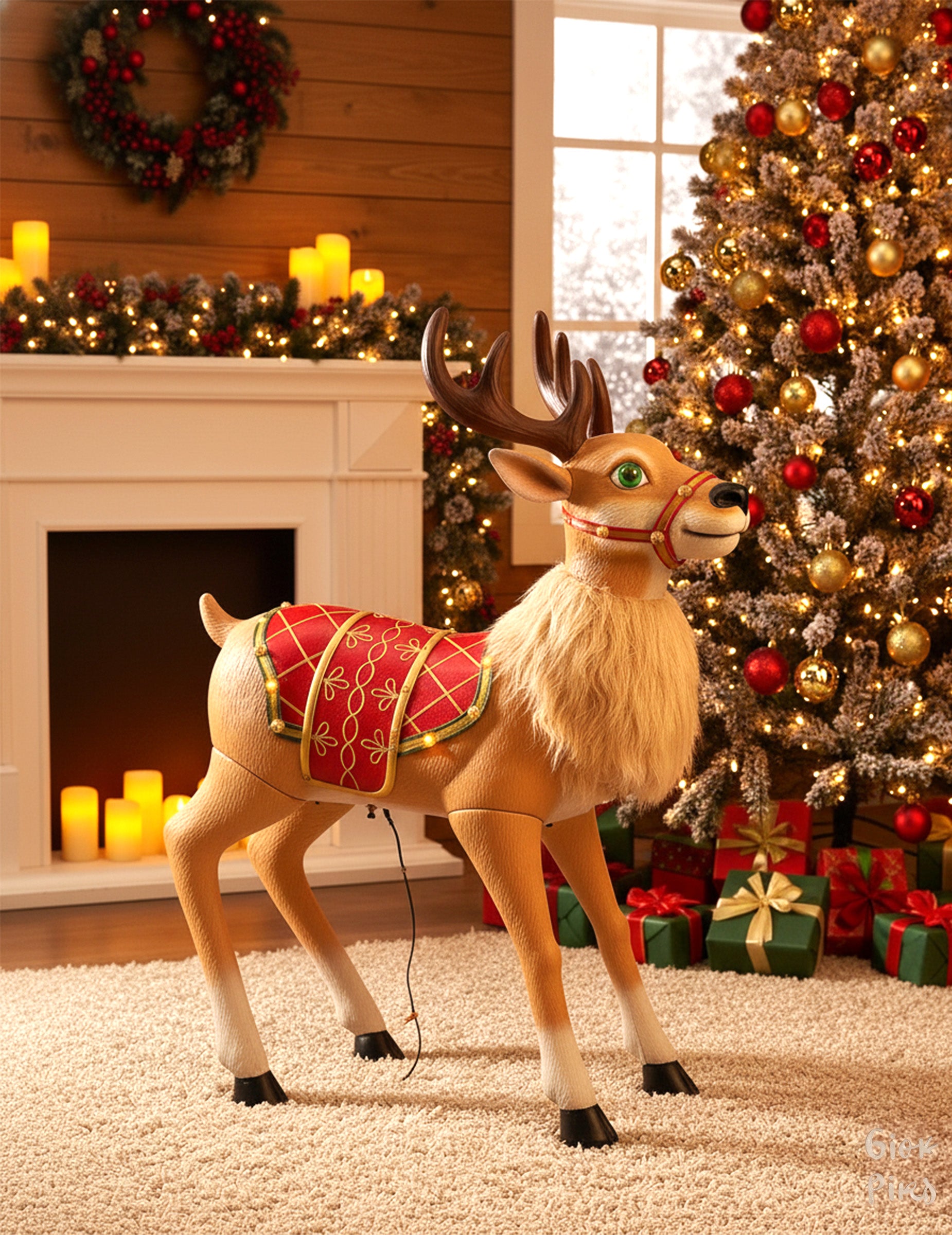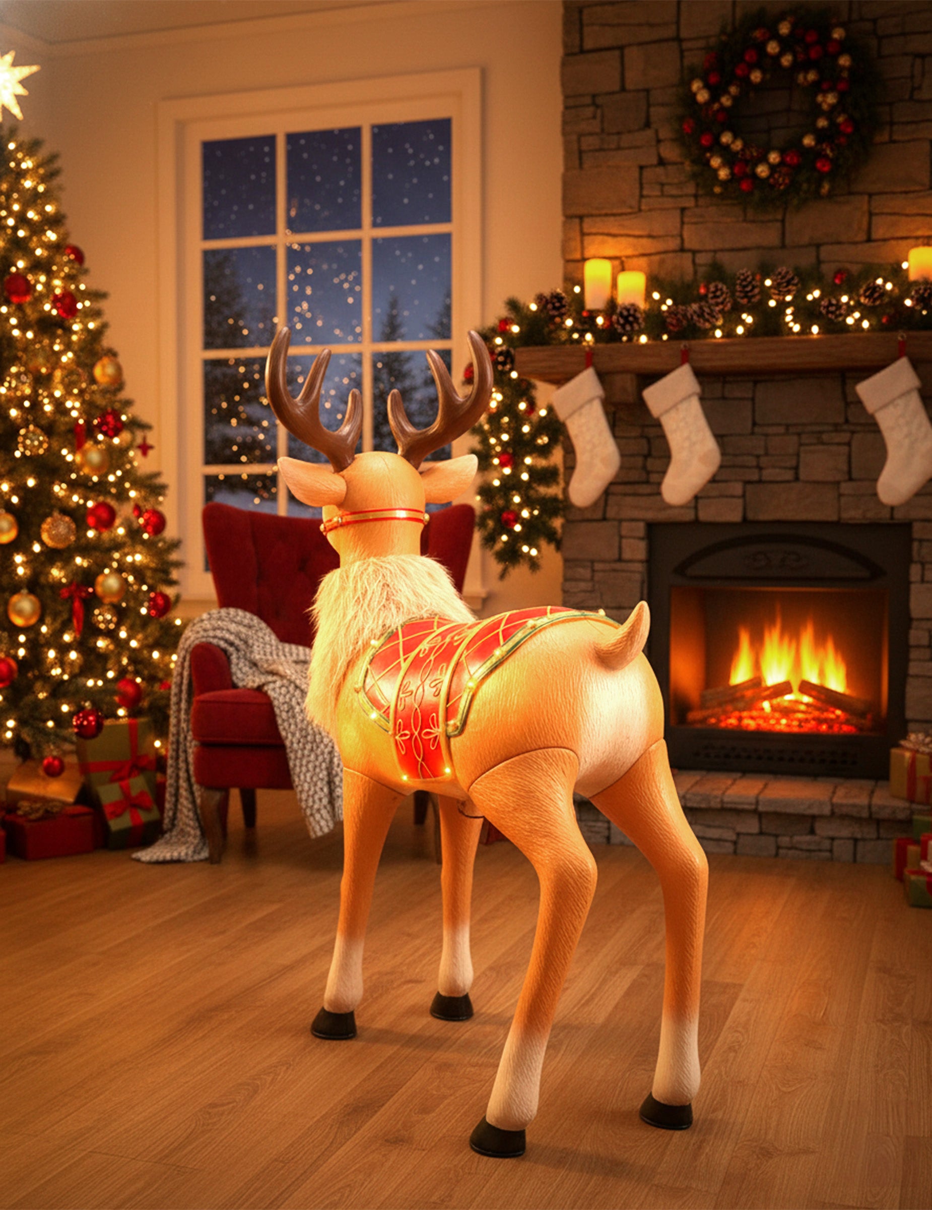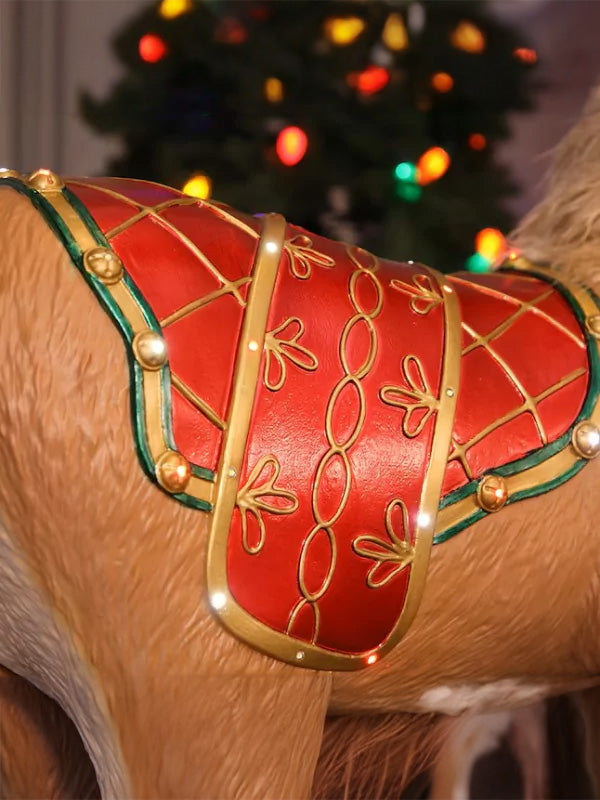 Cu șaua sa roșie iluminată cu LED și mișcările sale realiste, atrage toate privirile și îi încântă pe cei mici și mari. Sistemul său animat și sonor difuzează sunete festive blânde, cufundând instantaneu încăperea în spiritul Crăciunului.
