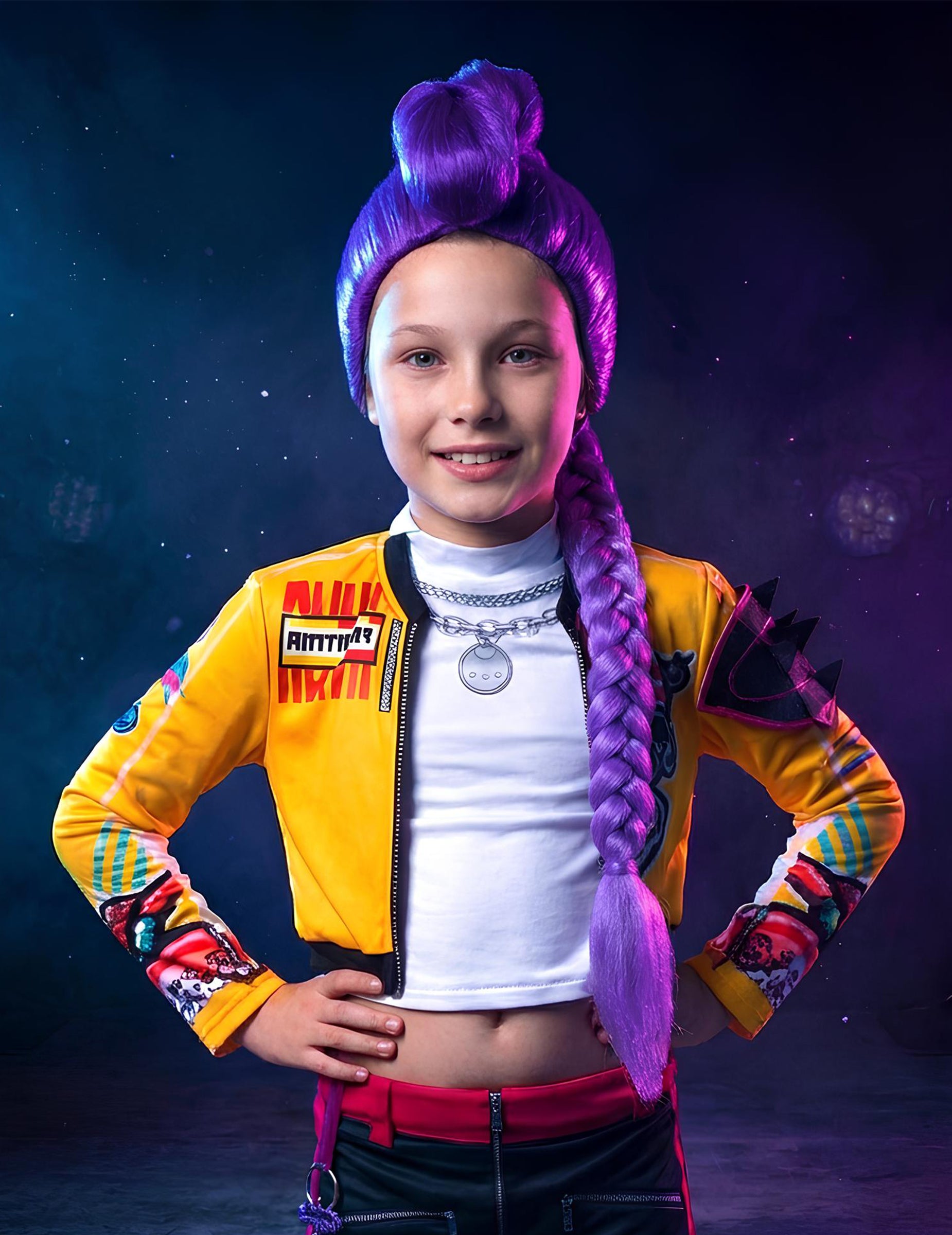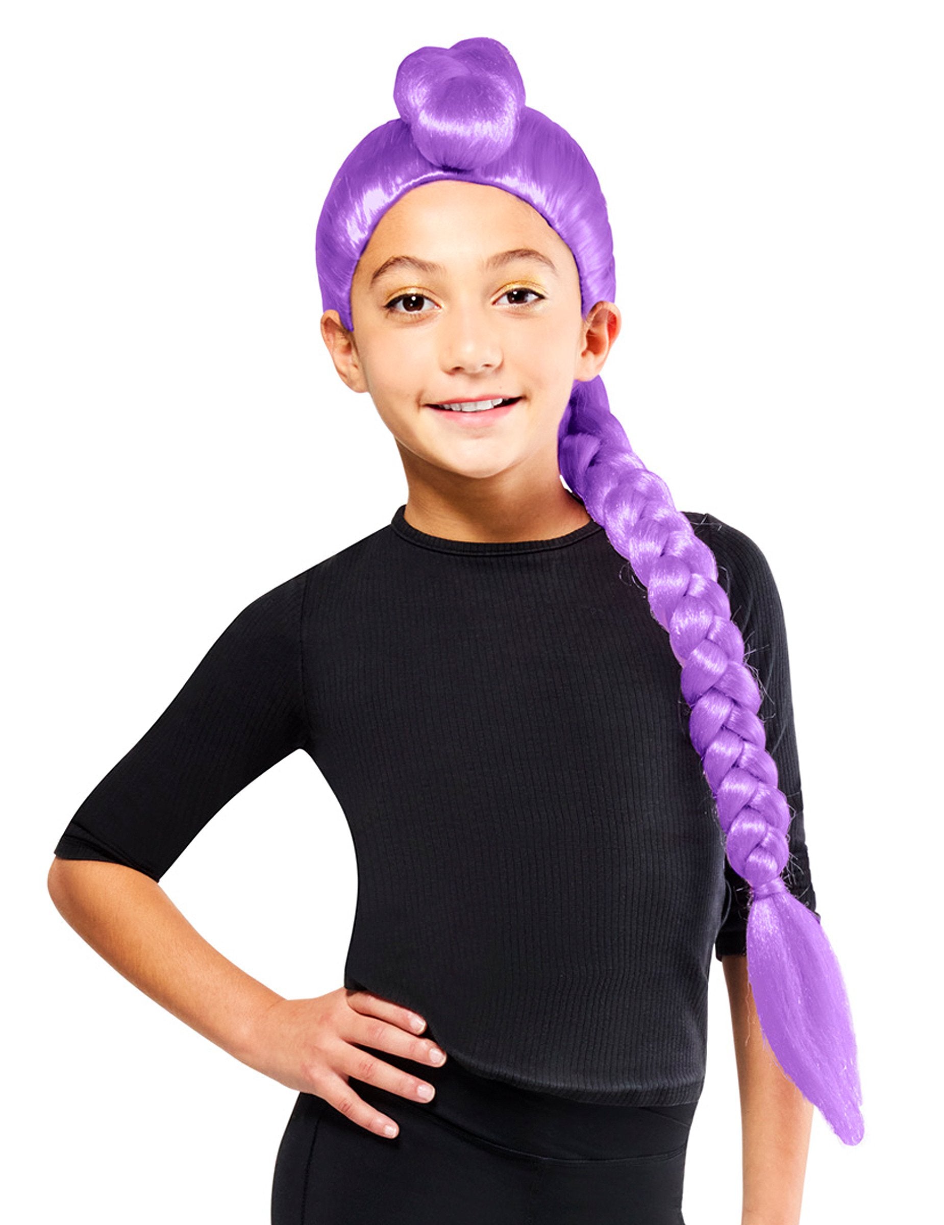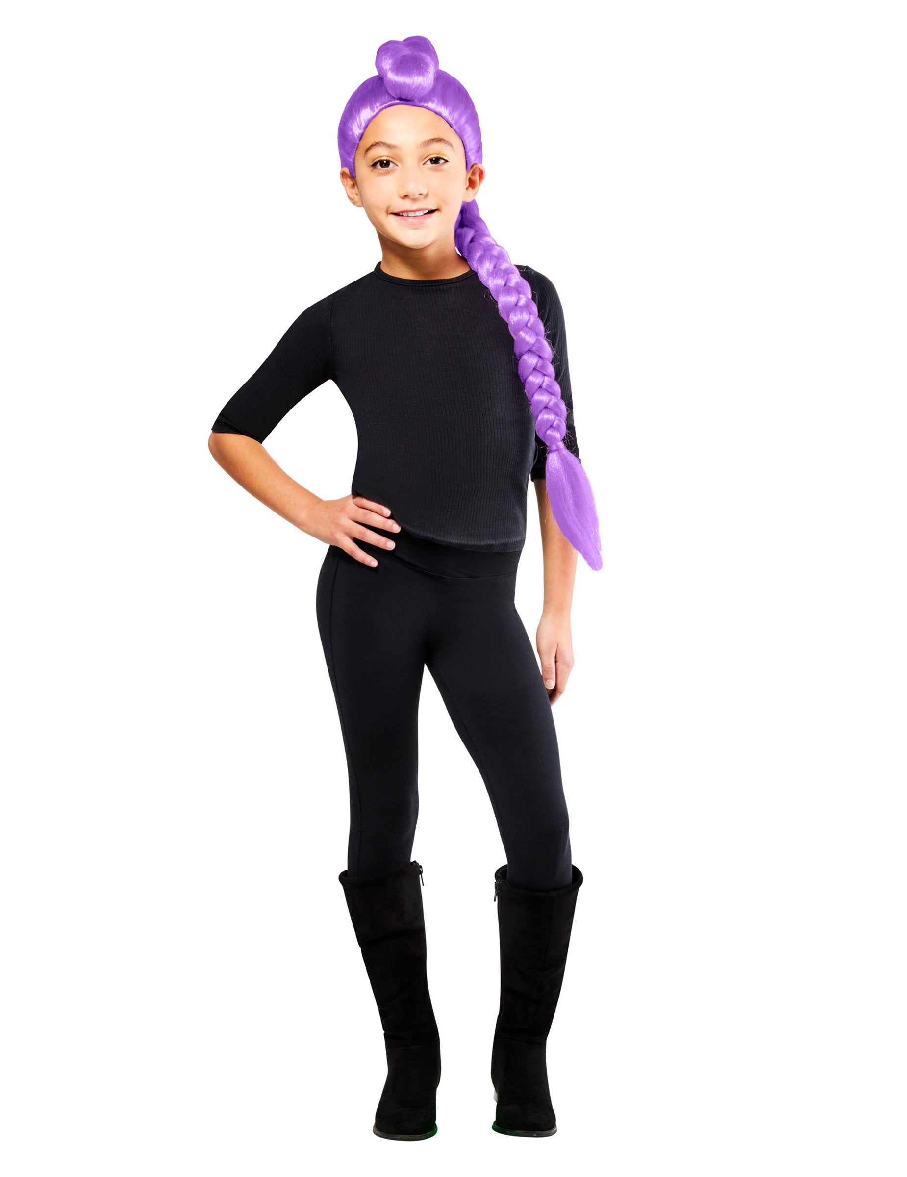 Cu această perucă Rumi Kpop Demon Hunter pentru fete, fiecare copilă se poate transforma într-o adevărată eroină a filmului de animație de succes KPop Demon Hunters. Inspirată de personajul Rumi, cântăreață și vânătoare de demoni, această coadă lungă împletită violet, prinsă într-un coc, evocă atât forța, cât și stilul idolilor K-pop. Ideală pentru Carnaval, un spectacol sau o petrecere cu costume, această perucă va face să strălucească toate micile fane pregătite să pătrundă în universul magic și muzical al filmului!