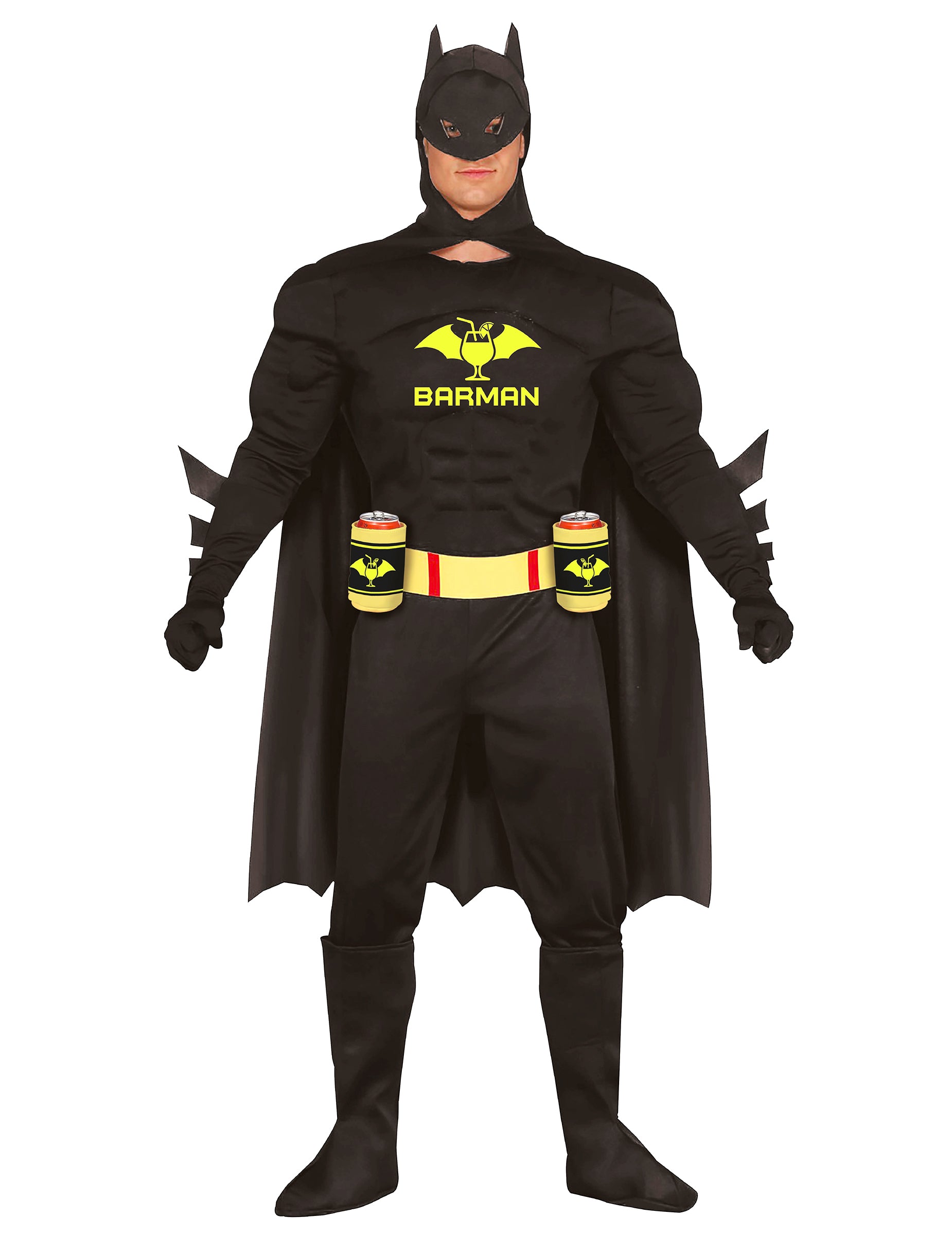 Acest costum de barman pentru adult transformă eroul mascat în regele petrecerii. Salopeta neagră, cu efect musculos, este împodobită cu sigla galbenă a barmanului, o aluzie nonconformistă la omologul său plin de umor. Pelerina lejeră, cureaua cu suporturi pentru pahare și masca asortată completează acest look original și festiv. Confortabil și ușor de purtat, combină stilul și umorul pentru a te face vedeta momentului. Un costum perfect pentru o petrecere mascat, carnaval sau petrecere a burlacilor.