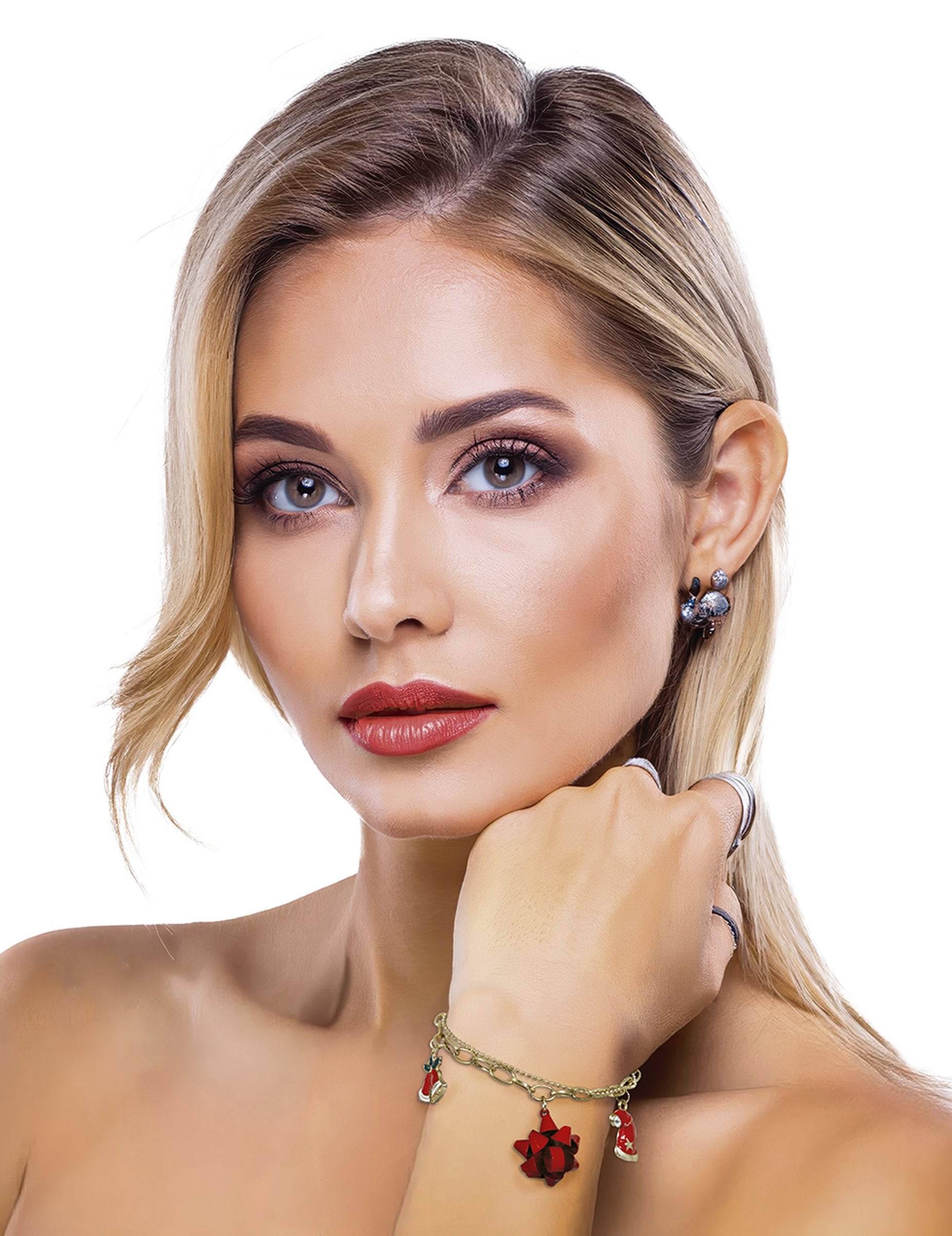 Această brățară metalică cu tematică de Crăciun prezintă pandantive roșii și aurii care evocă magia sărbătorilor: o pălărie de Moș Crăciun, un clopoțel decorat și o fundiță strălucitoare. Montate pe un lanț dublu de aur, aceste elemente festive adaugă strălucire și eleganță încheieturii mâinii tale. Cu o încuietoare reglabilă, se potrivește tuturor mărimilor și poate fi purtată cu o ținută festivă sau ca ținută de zi cu zi în timpul sezonului de Crăciun. Un accesoriu rafinat pentru a sărbători sărbătorile cu stil.