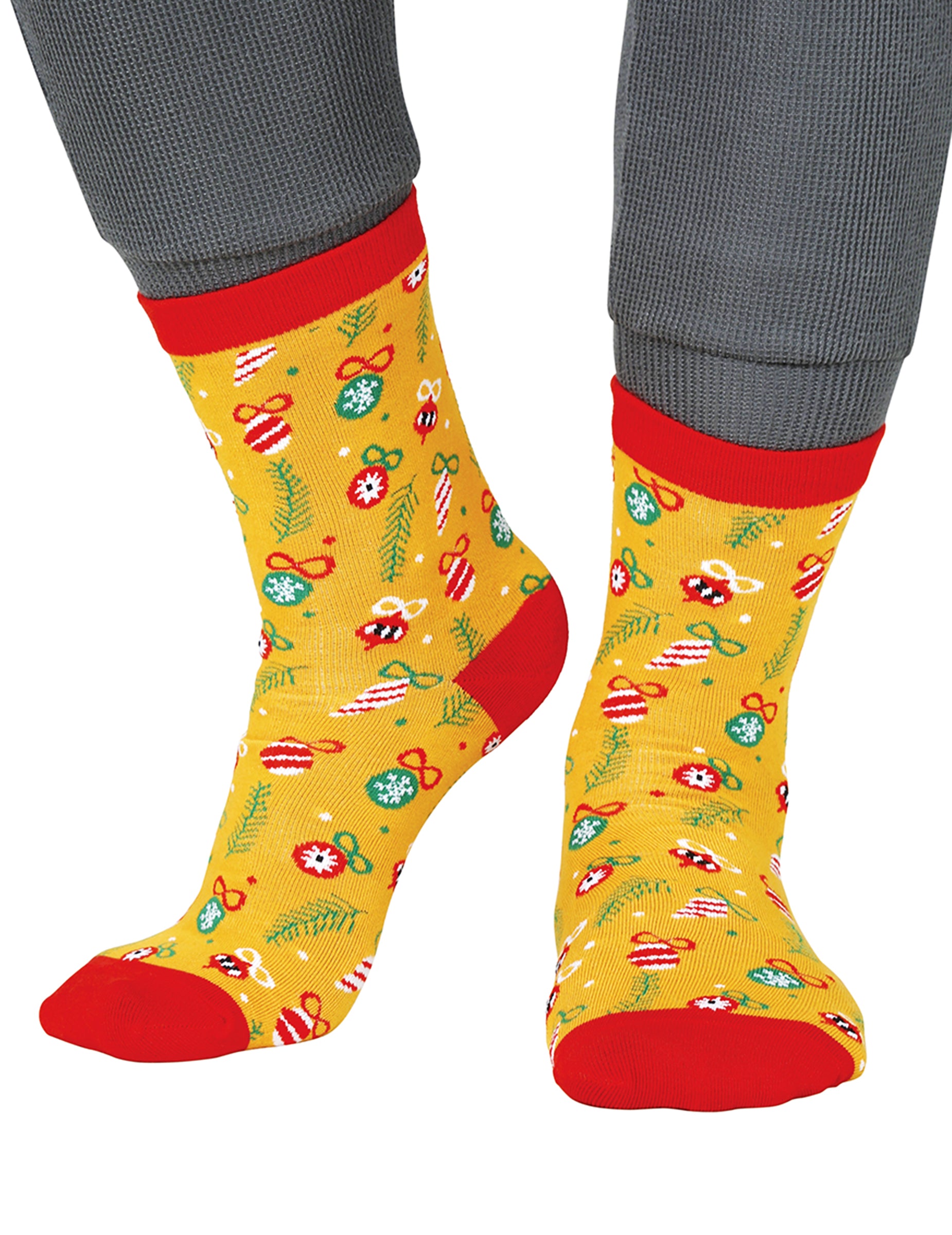 Aceste șosete galbene de Crăciun cu model pentru adulți adaugă o notă strălucitoare ținutei tale de sărbători. Globuri de Crăciun, fulgi de zăpadă și acadele sunt reprezentate pe fundalul lor galben strălucitor într-un amestec vesel de roșu, verde și alb. Marginile și vârfurile roșii adaugă o notă contrastantă și festivă, perfecte pentru a însenina serile de iarnă cu umor și stil.