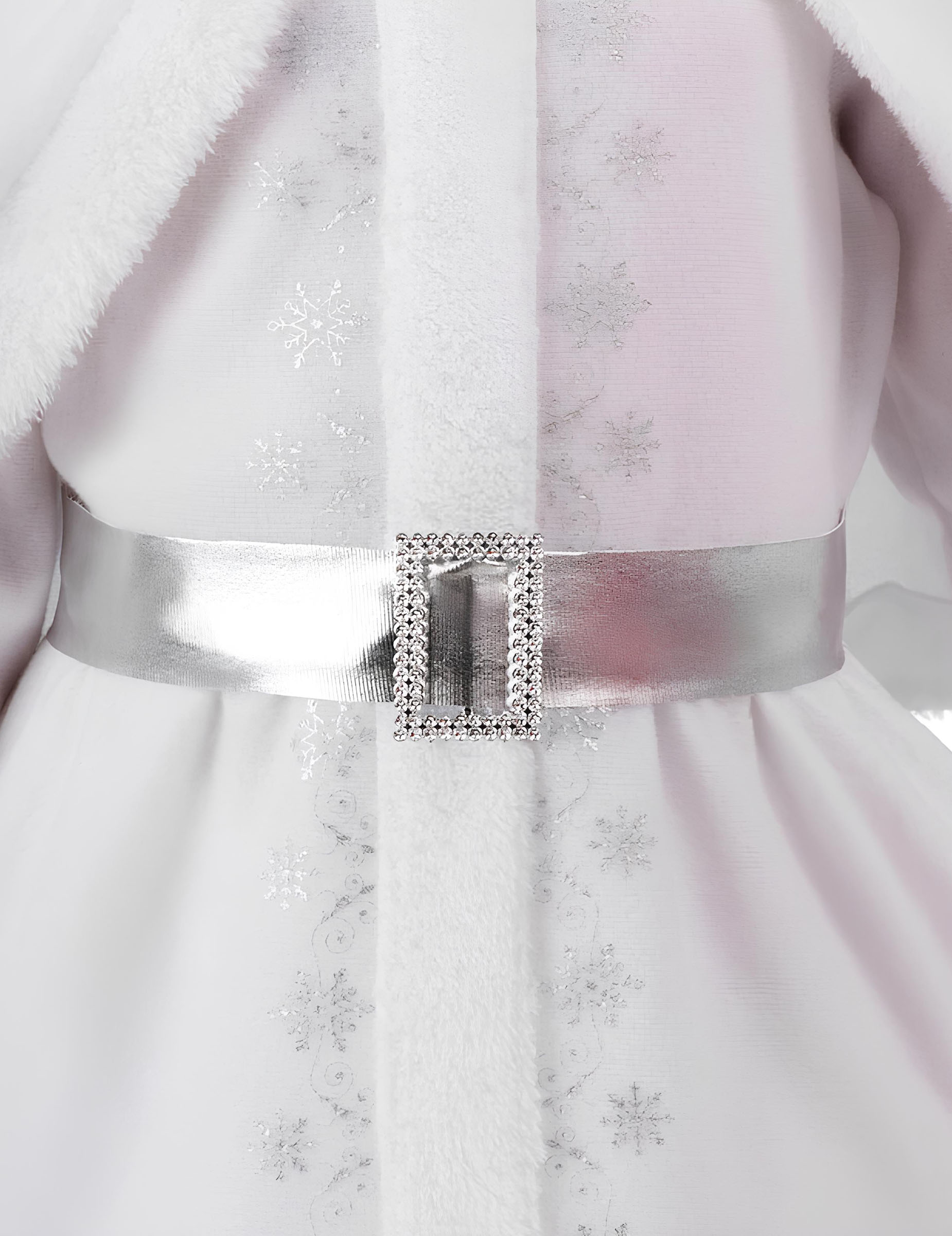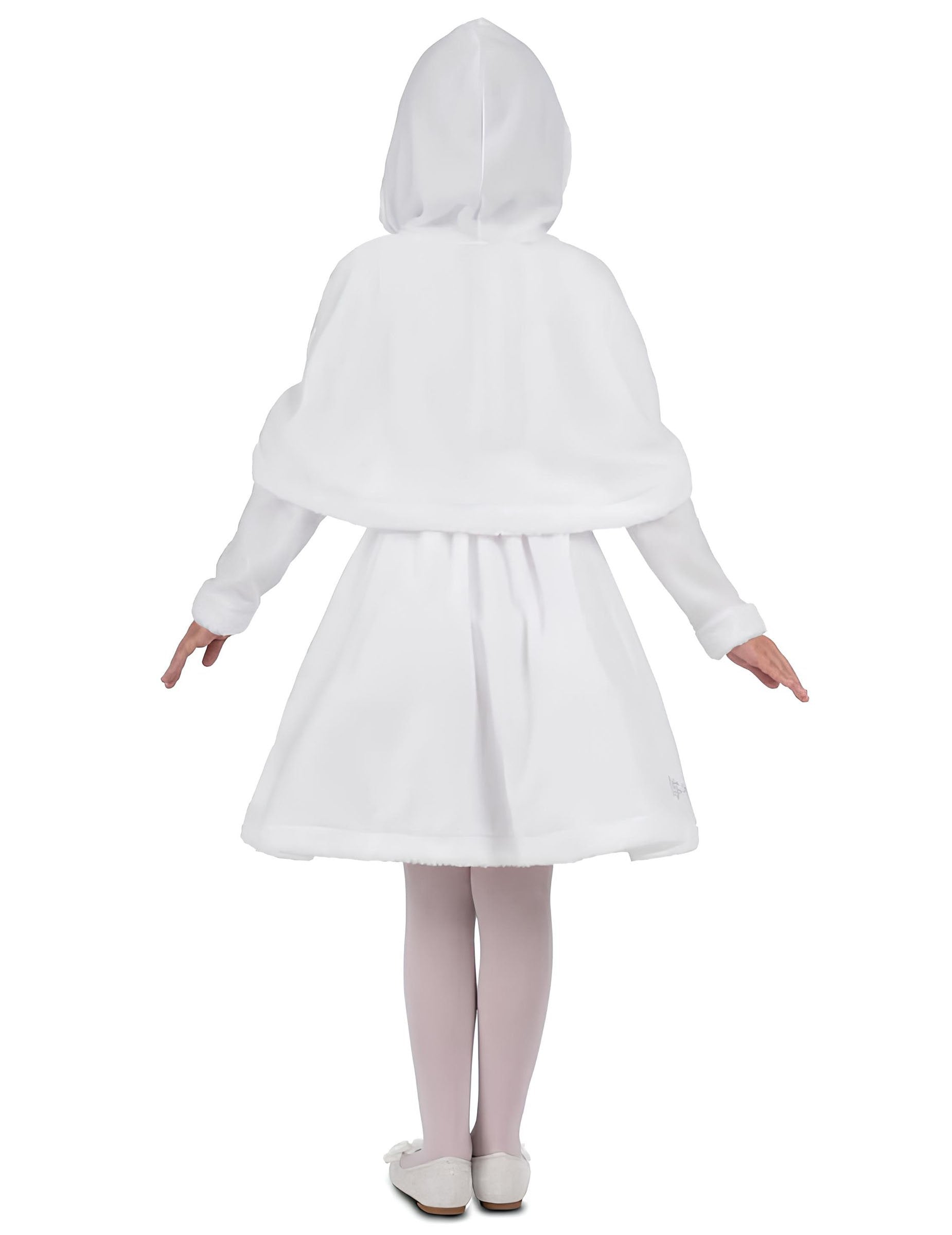Această ținută aduce o atmosferă magică Crăciunului cu rochia sa albă elegantă și pelerina moale cu glugă care învăluie ușor copilul. Ansamblul creează un aspect luminos, perfect pentru a experimenta pe deplin magia sărbătorilor. Acest costum alb de Doamna Crăciun pentru fete combină o rochie lejeră împodobită cu accente argintii și o curea strălucitoare care evidențiază subtil silueta. Pelerina asortată adaugă o notă rafinată de iarnă și este completarea perfectă pentru momentele festive de Crăciun. O ținută care scoate în evidență toată dulceața și strălucirea acestui anotimp fermecat.