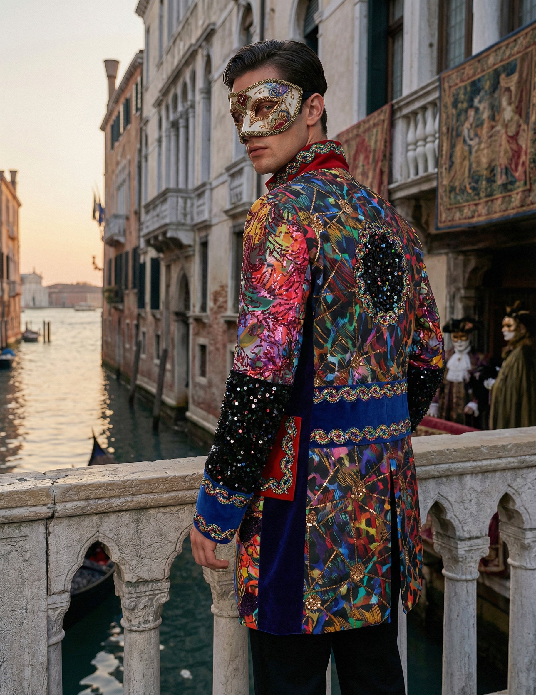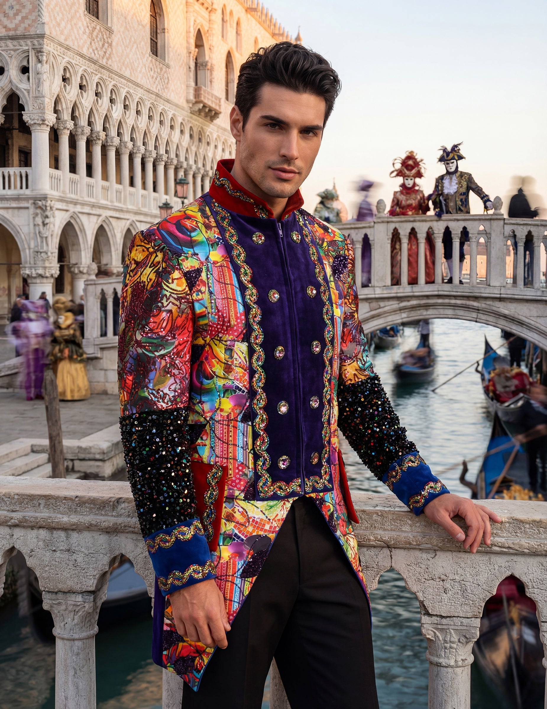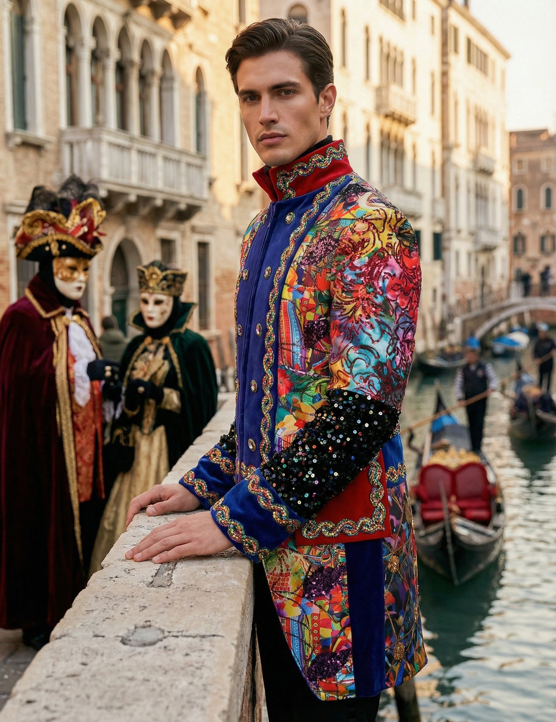 Această jachetă premium de carnaval pentru bărbați, în stil Fiesta Carnavale, multicoloră, atrage imediat atenția prin culorile vibrante și modelele decorative care emană un spirit festiv. Mânecile împodobite, nasturii aliniați și ornamentele contrastante creează un aspect structurat, în timp ce detaliile multicolore adaugă o notă energică. Designul flatează silueta și face o declarație puternică, ideală pentru a completa o ținută îndrăzneață. Perfectă pentru un carnaval sau o petrecere în costume, completează un look care își propune să facă o declarație de stil.