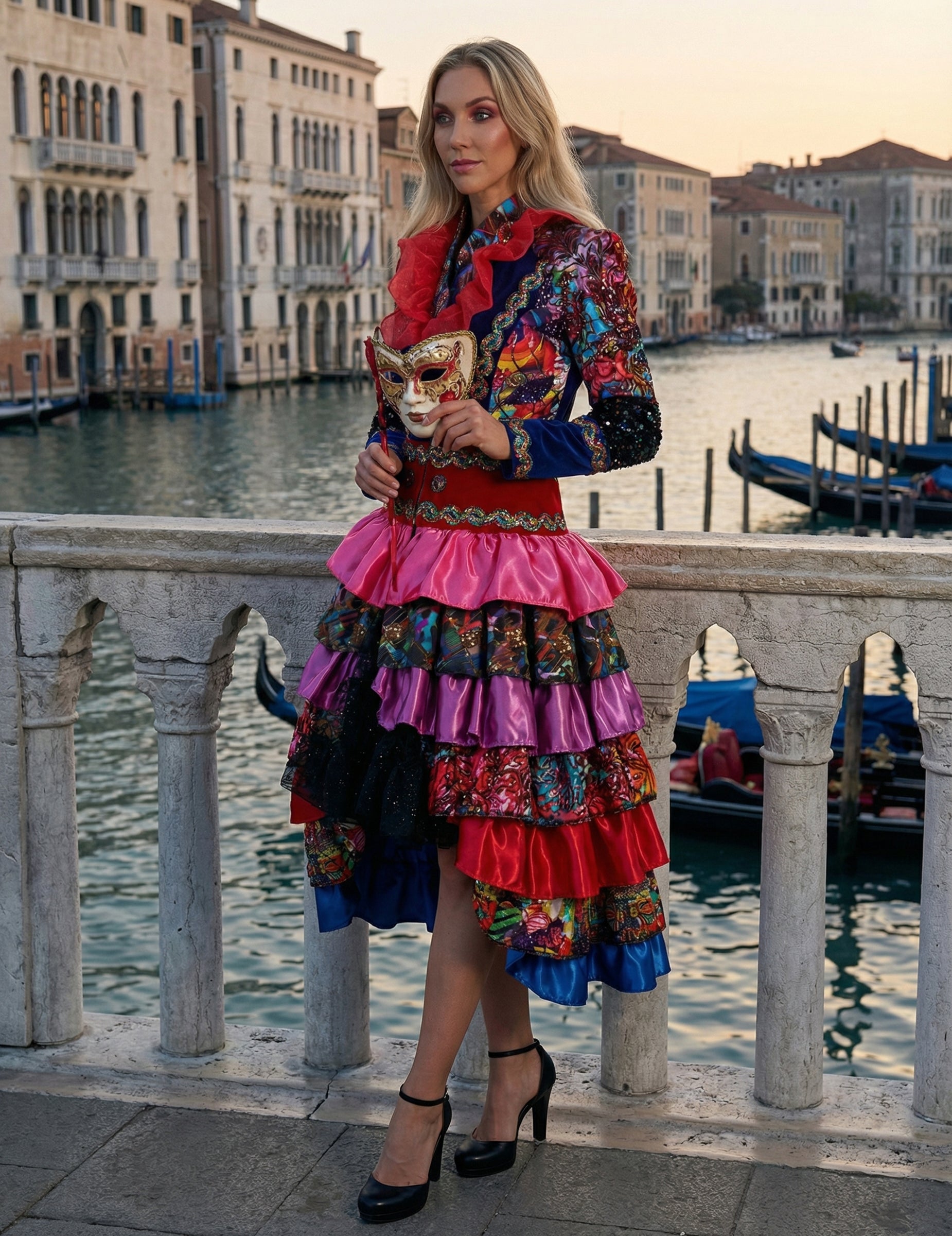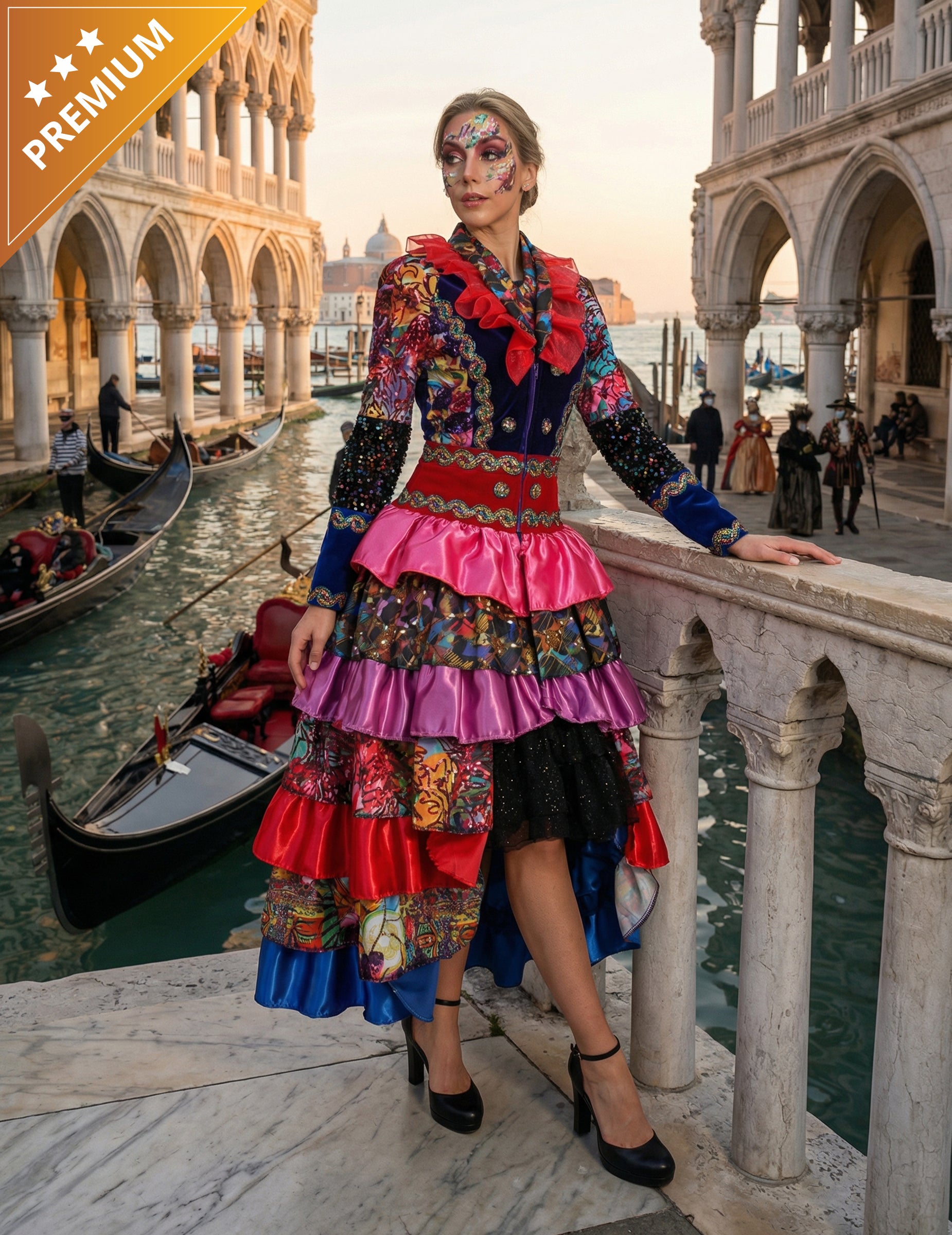 Această jachetă de carnaval premium, multicoloră, în stil Fiesta Carnavale, pentru femei, iese în evidență prin nuanțele sale vibrante și modelele festive atrăgătoare. Mânecile împodobite, gulerul definit și garnitura contrastantă creează un aspect dinamic, în timp ce detaliile multicolore adaugă o notă veselă și plină de caracter. Designul flatează silueta și face o declarație puternică, perfectă pentru o ținută de petrecere. Ideală pentru carnaval sau petreceri în costume, completează perfect un look care își propune să facă o declarație îndrăzneață.