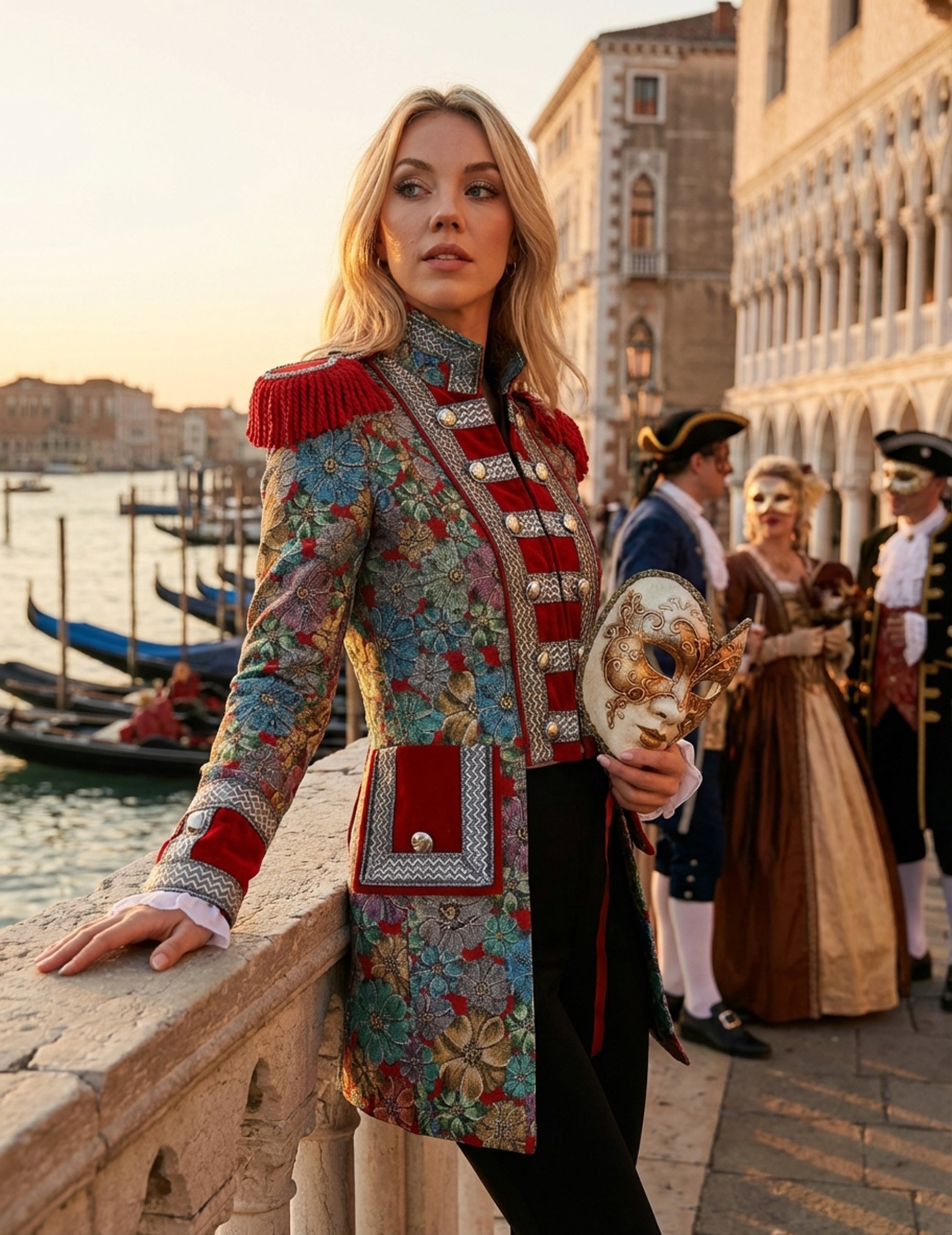 Această jachetă premium de carnaval pentru femei, cu imprimeu floral, iese în evidență prin culorile vibrante și motivele decorative atrăgătoare. Croiala sa elegantă evidențiază umerii cu ornamente roșii, în timp ce detaliile florale adaugă o notă de rafinament. Contrastul dintre bordură și benzile decorative creează un aspect armonios și plin de caracter, perfect pentru o ținută festivă. Este piesa ideală pentru un carnaval sau orice sărbătoare unde doriți să etalați un stil încrezător și elegant.