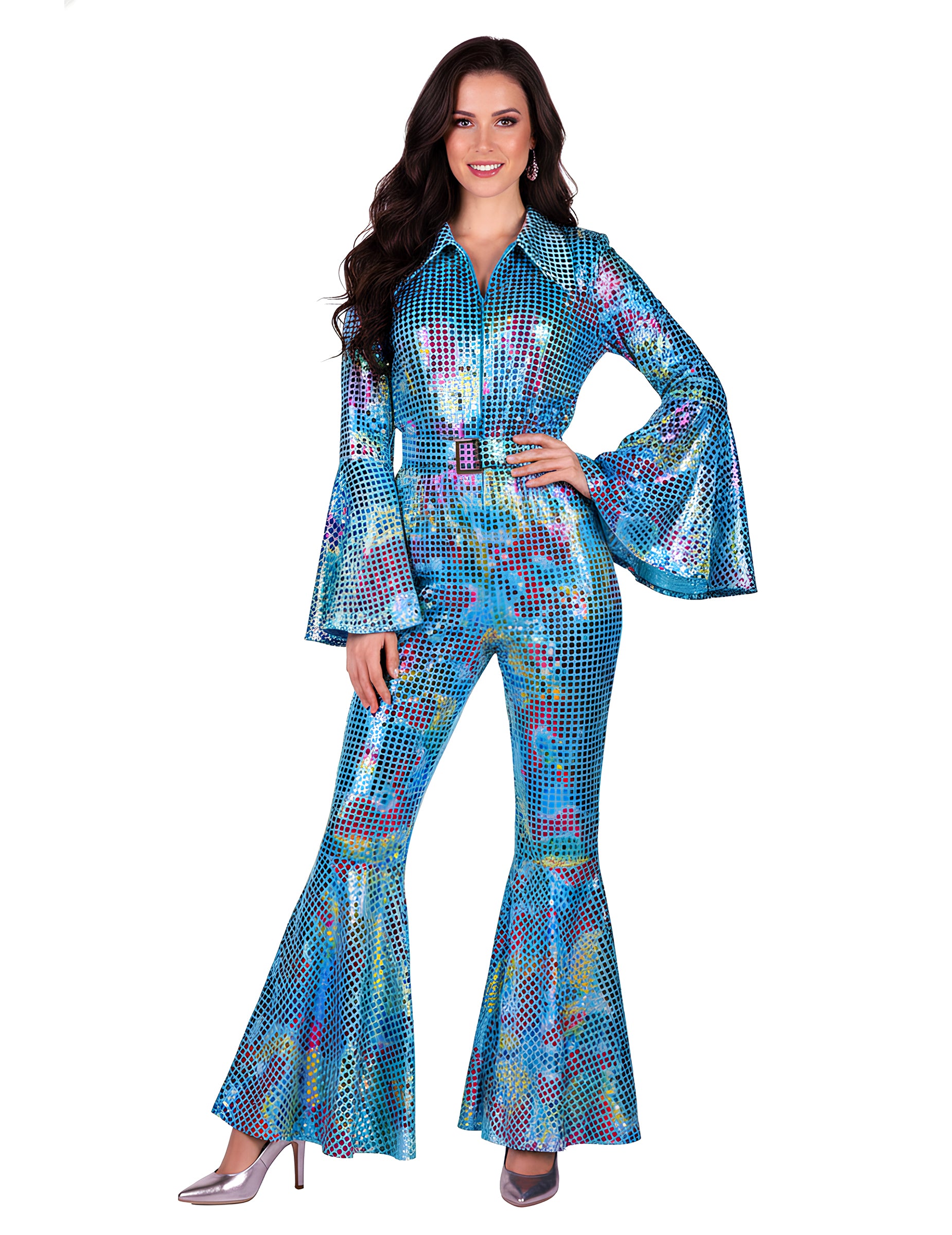 Această salopetă disco turcoaz premium pentru femei atrage instantaneu atenția cu efectul său strălucitor și nuanța vibrantă, perfectă pentru sărbătorirea Anului Nou. Materialul său multi-reflectorizant luminează fiecare mișcare și conferă o prezență izbitoare din momentul în care sosești la o petrecere. Mânecile evazate și tivul clopot creează o siluetă disco clasică, oferind în același timp un stil fluid și definit. Croiul flatează silueta fără a dezvălui prea mult, pentru un aspect elegant și festiv la orice eveniment animat.
