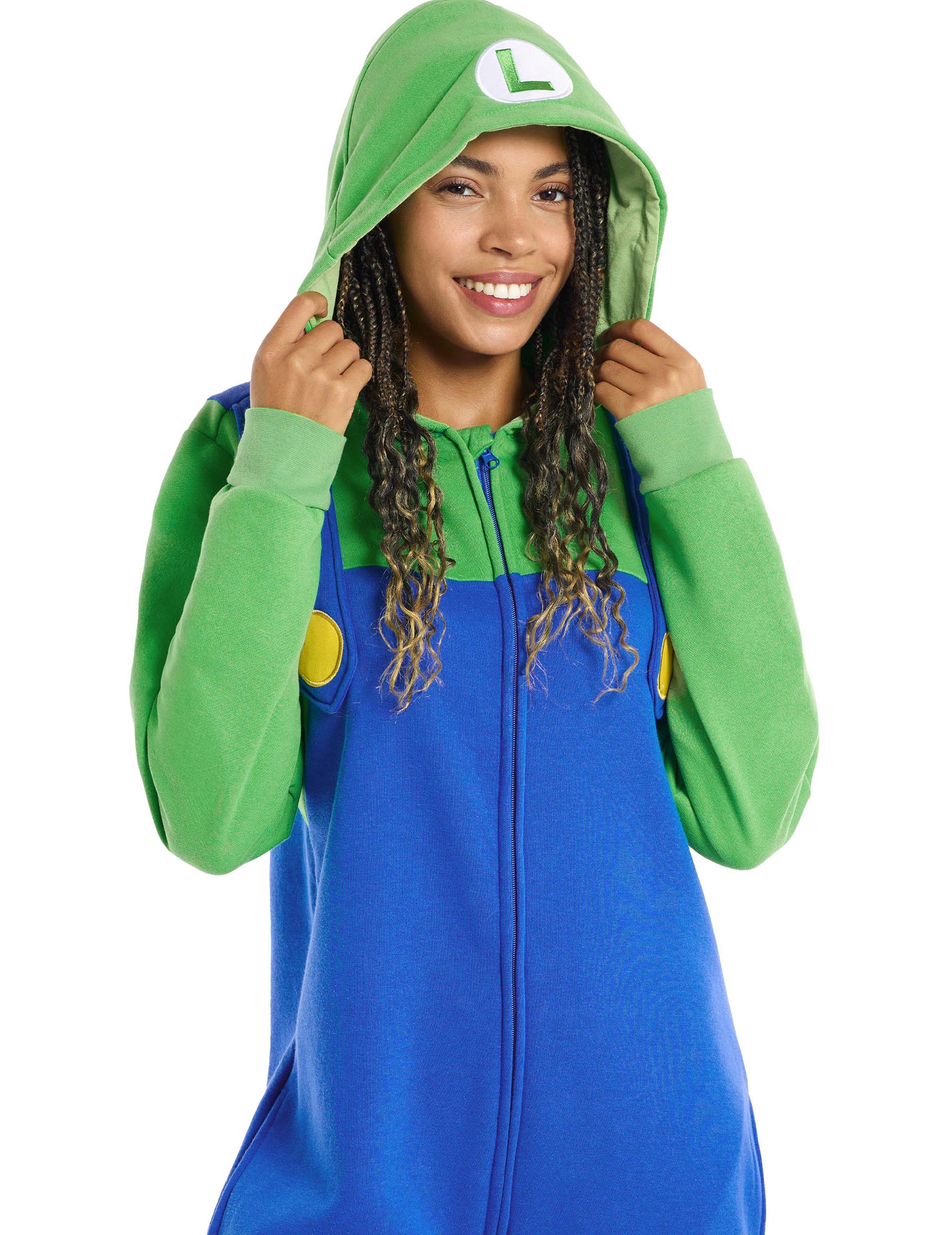Această salopetă Luigi™ pentru adulți reproduce culorile emblematice ale personajului, având un top verde cu glugă și o parte albastră tip salopetă pentru un look ușor de recunoscut.