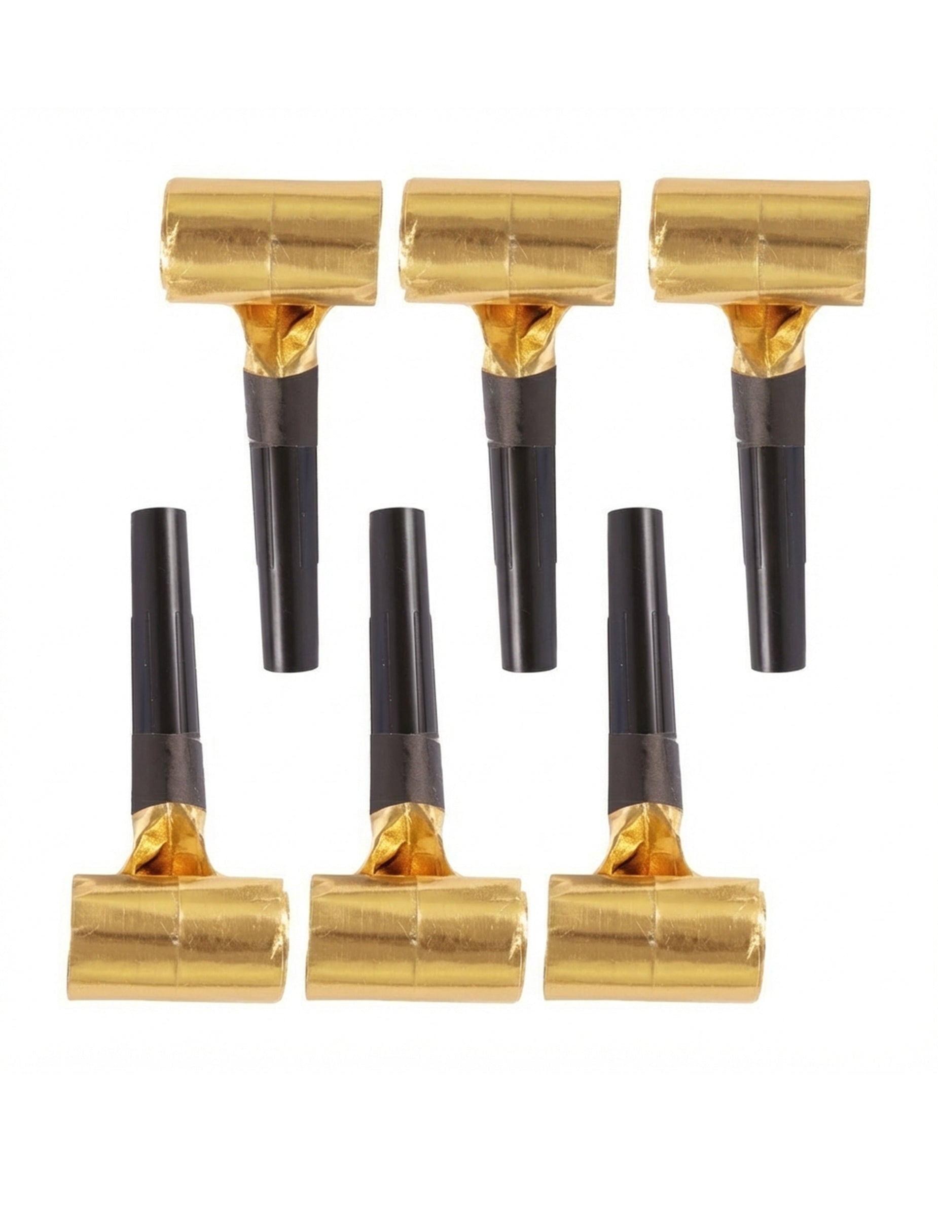 Cele 6 fluiere de petrecere negre și aurii oferă un aspect festiv datorită nuanțelor asortate. Designul lor simplu permite utilizarea ușoară pentru a adăuga o notă amuzantă serii. Combinația de negru și auriu se potrivește perfect unei decorațiuni de petrecere elegante și aduce un efect rafinat. Ideale pentru o aniversare, Revelion sau orice eveniment festiv.