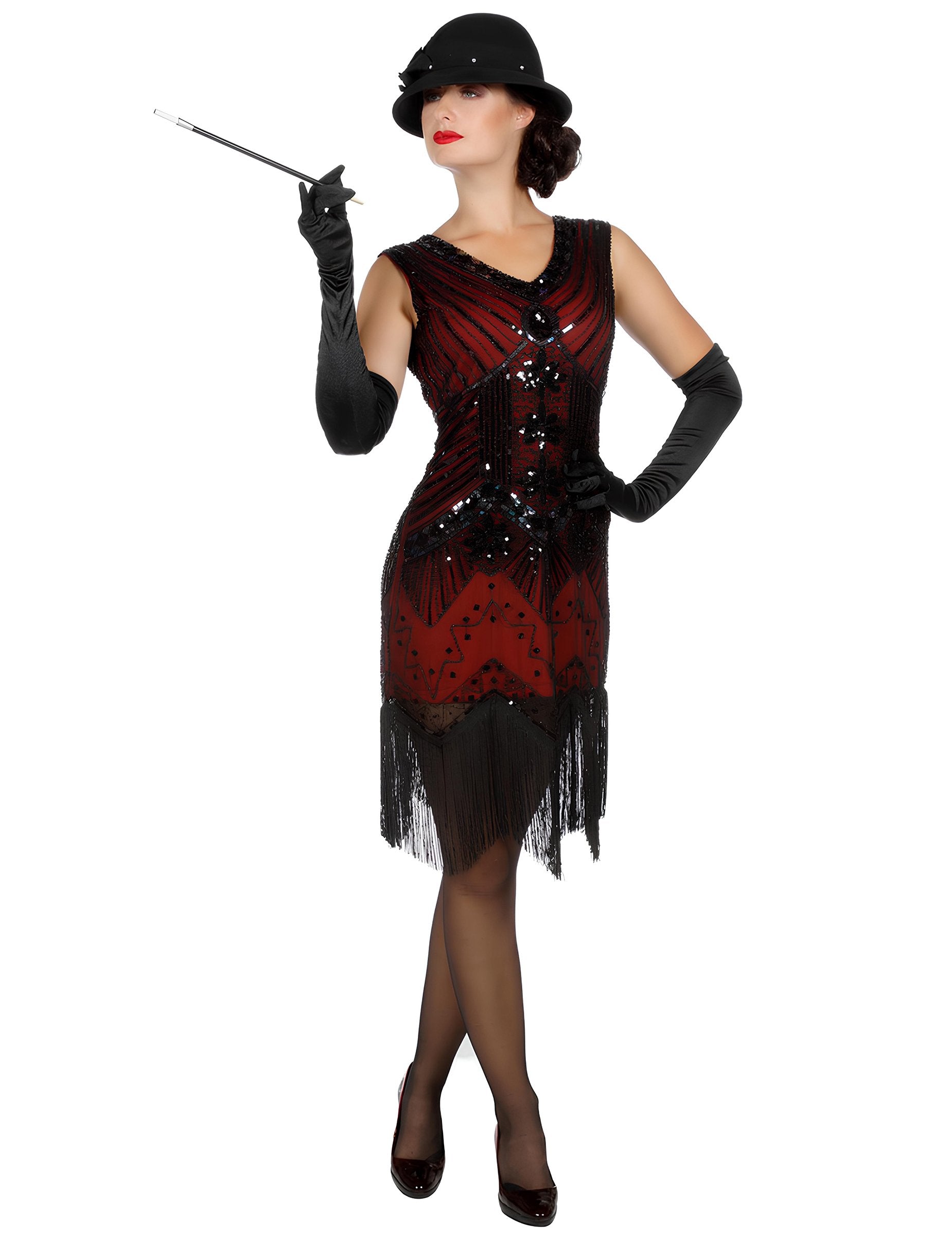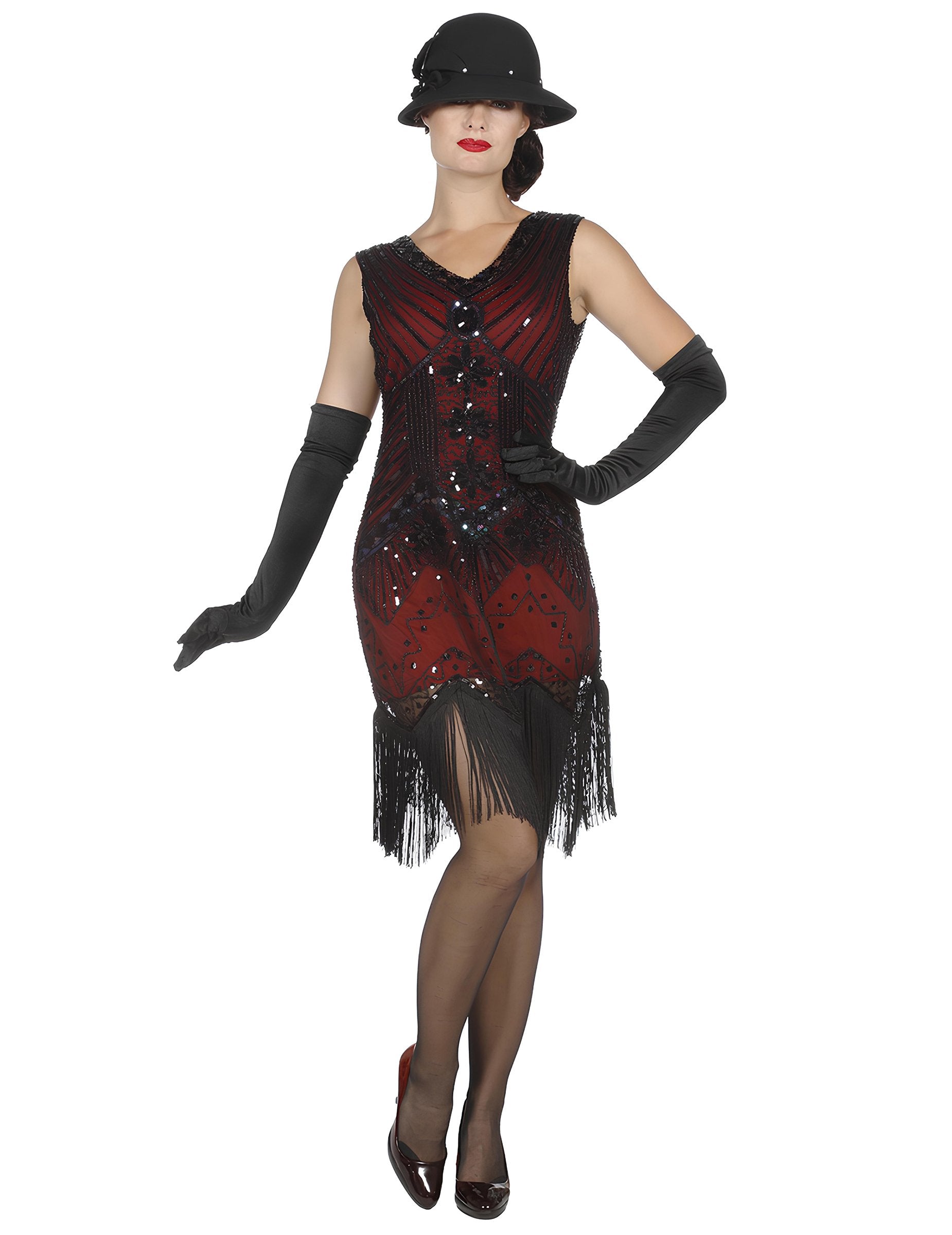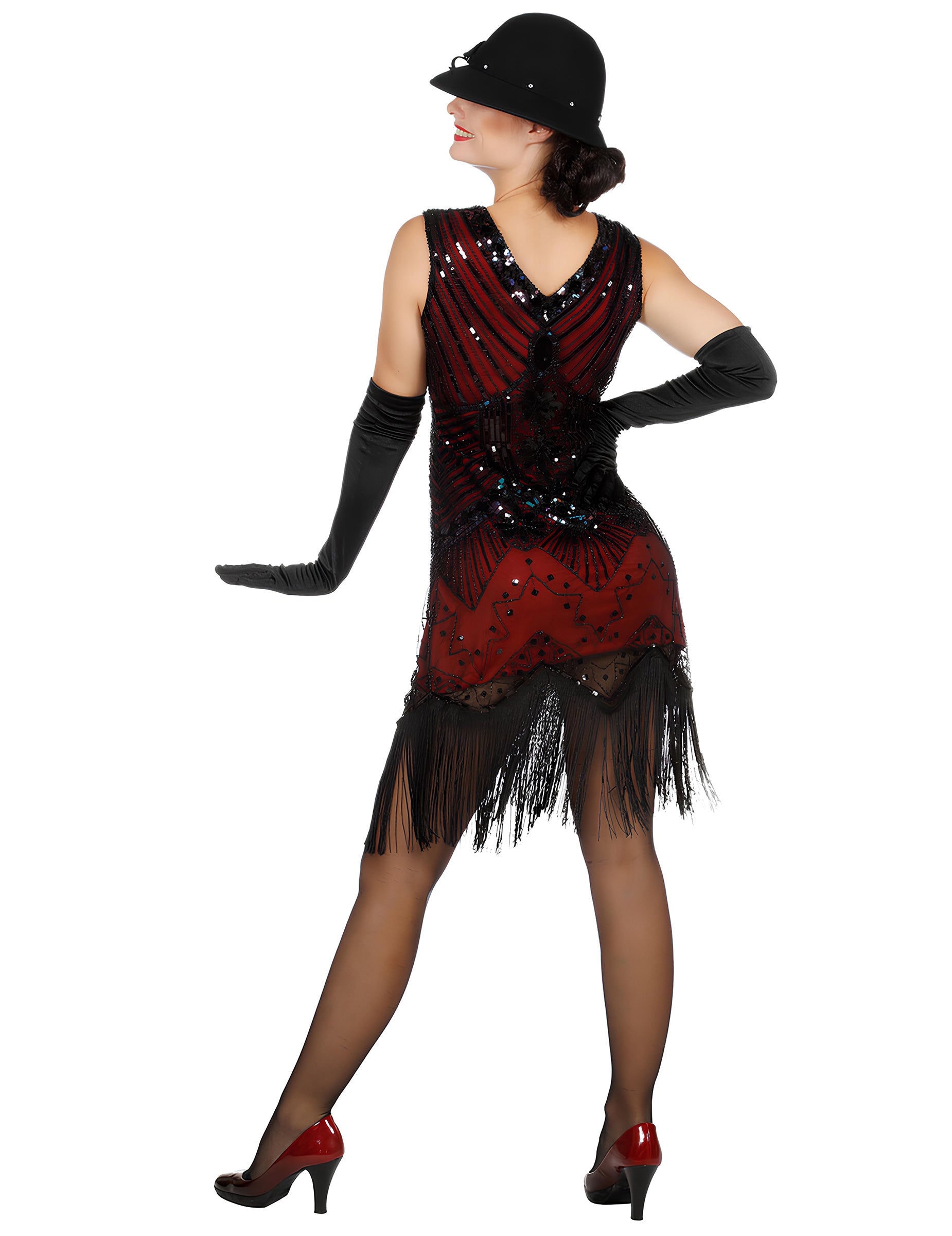 Acest costum Charleston roșu cu paiete de lux pentru femei evidențiază o rochie decorată cu paiete negre și roșii, desenând motive elegante ce amintesc de farmecul ținutelor din anii nebuni. Roșul intens conferă personalitate întregului ansamblu, în timp ce contrastele închise adaugă o notă rafinată. Croiala dreaptă este accesorizată cu franjuri negre la baza rochiei, creând o mișcare ușoară și fidelă stilului Charleston. Detaliile discrete și liniile regulate fac ținuta elegantă fără a fi prea încărcată. Perfect pentru o petrecere tematică anii '20, un eveniment retro sau o ocazie elegantă, unde această rochie va aduce un aspect îngrijit și va face prezența ta și mai armonioasă, memorabilă și plăcută de admirat.