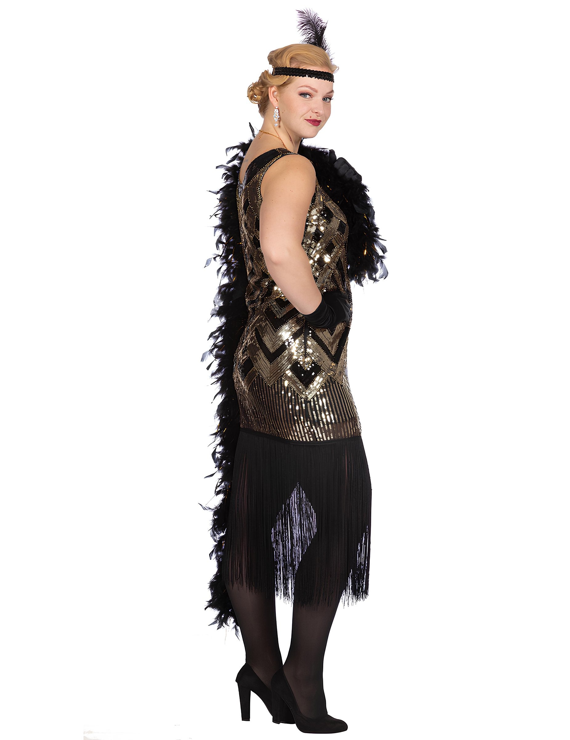 Acest costum Charleston negru și auriu cu paiete de lux pentru femei evidențiază o rochie ale cărei paiete metalizate formează modele grafice care atrag privirea în mod natural. Combinația de negru și auriu creează un contrast elegant ce conferă o prezență autentică ținutei. Croiala scurtă lasă să cadă franjuri lungi și drepte, oferind mișcare ritmată și fluidă la fiecare pas, în spiritul autentic al anilor nebuni. Modelele schimbătoare, mai dense în partea de sus și mai rare spre partea de jos, aduc o structură vizuală plăcută. Perfectă pentru o petrecere tematică anii '20, un bal retro sau un eveniment elegant, unde această rochie va evidenția un stil îndrăzneț și va face apariția ta și mai captivantă, veselă și memorabilă.
