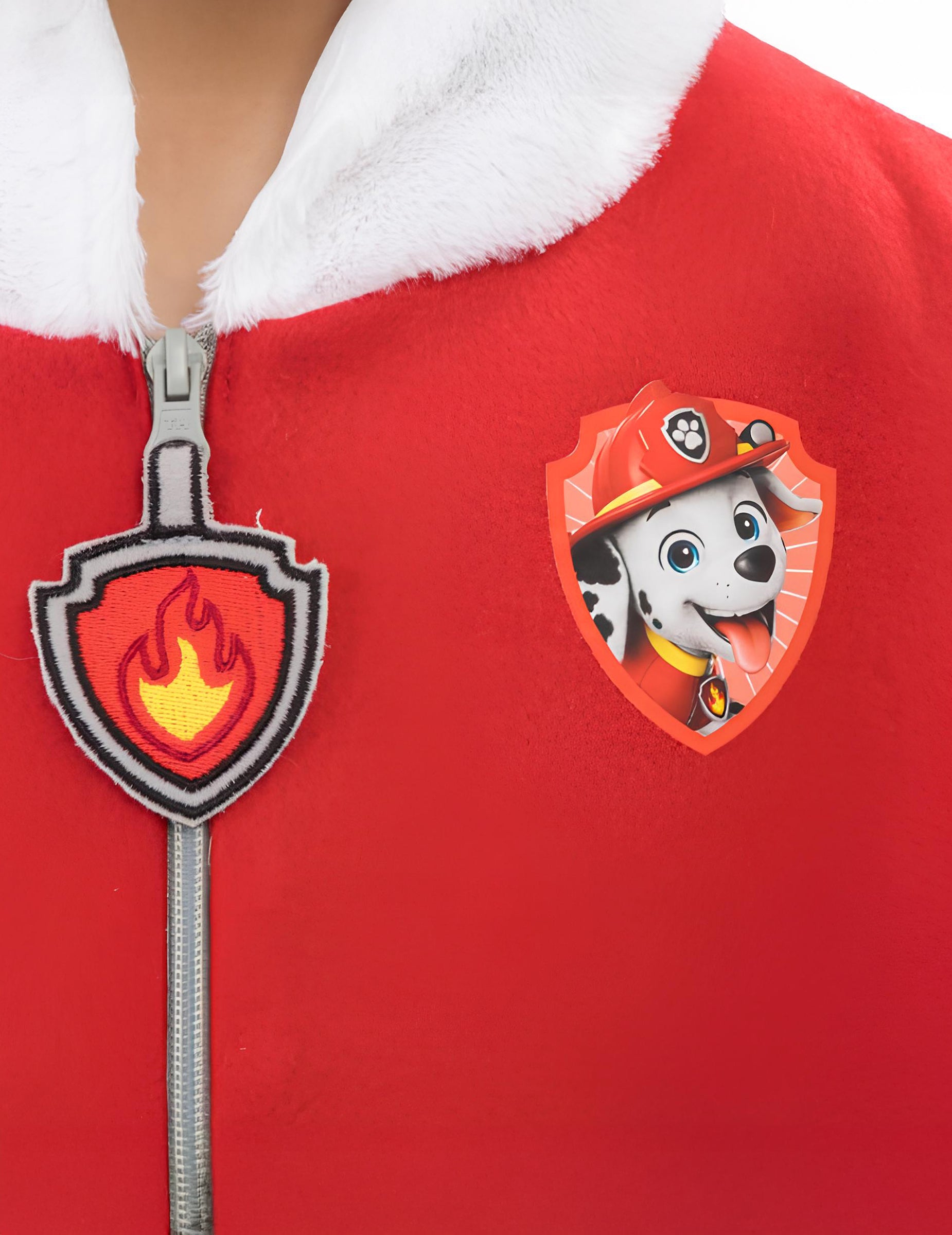 Această salopetă Marcus Patrula Cățelușilor pentru copii, realizată sub licență oficială Patrula Cățelușilor. Acest costum îi permite copilului dumneavoastră să adopte look-ul celebrului dalmațian pompier din serial. Salopeta combină un material moale alb cu pete negre și un top roșu decorat cu o insignă imprimată și buzunare desenate. Se închide în față cu ajutorul unui fermoar discret. Gluga reprezintă capul lui Marcus, cu urechi 3D, față imprimată și casca roșie integrată în design. Această salopetă este ideală pentru joaca de zi cu zi, petreceri de aniversare costumate sau Carnaval.