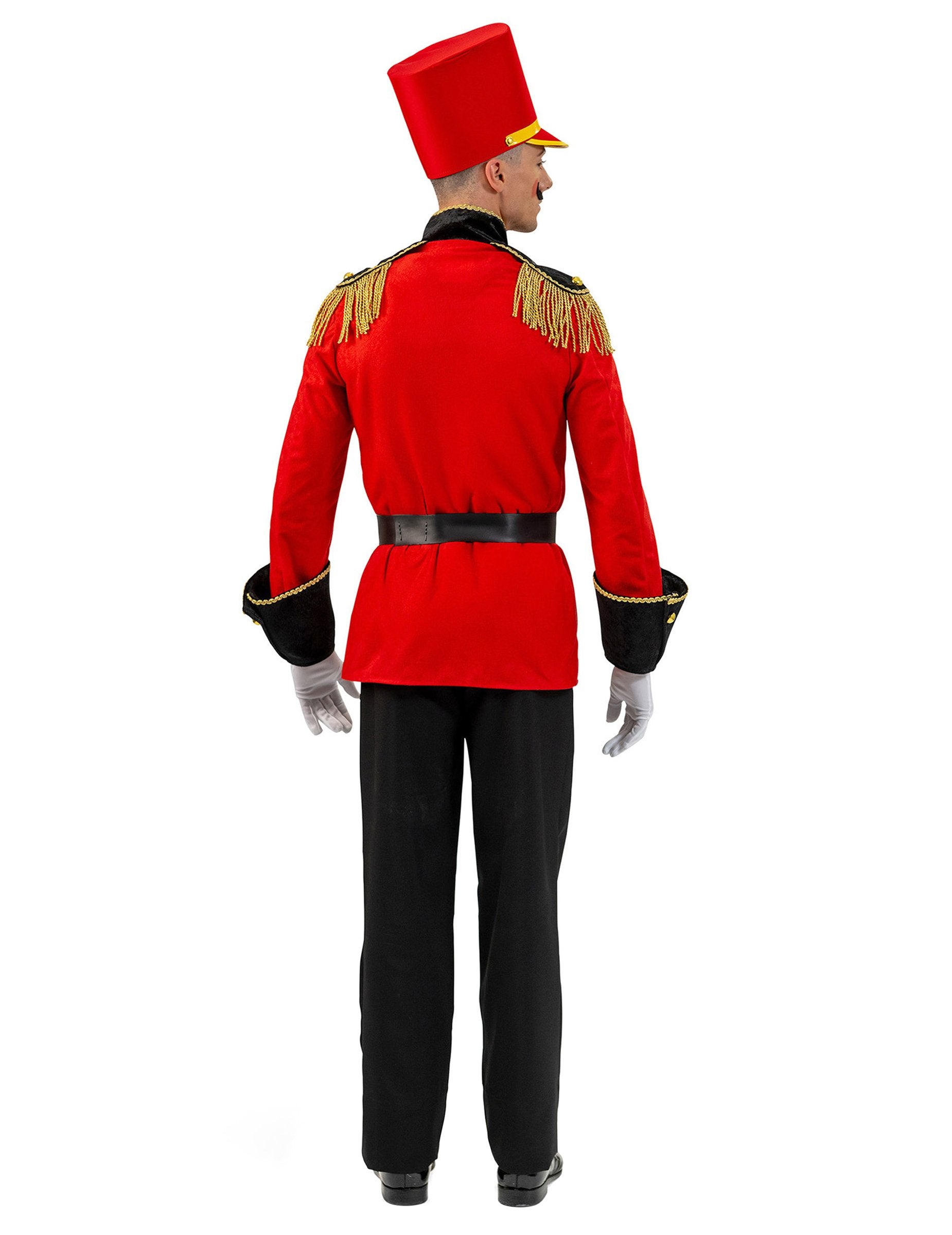 La veste est rouge avec des galons dorés et des épaulettes à franges qui renforcent son aspect de soldat de spectacle. Le bas des manches est noir avec un liseré doré. La coupe descend au niveau des hanches environ et s’ouvre légèrement sur le devant. Une ceinture noire souligne la silhouette et complète l’ensemble.